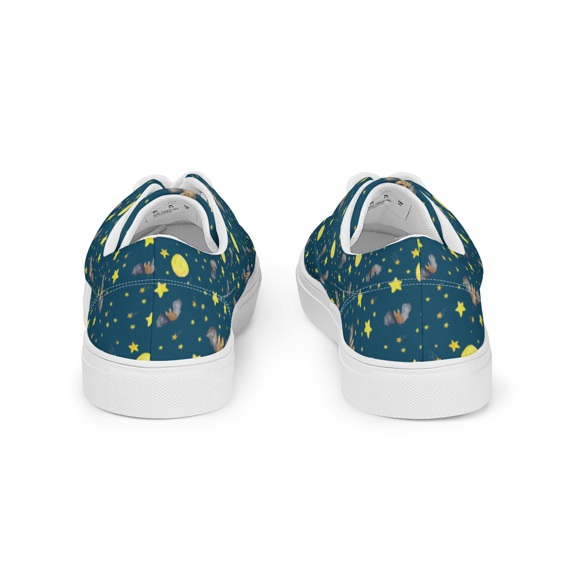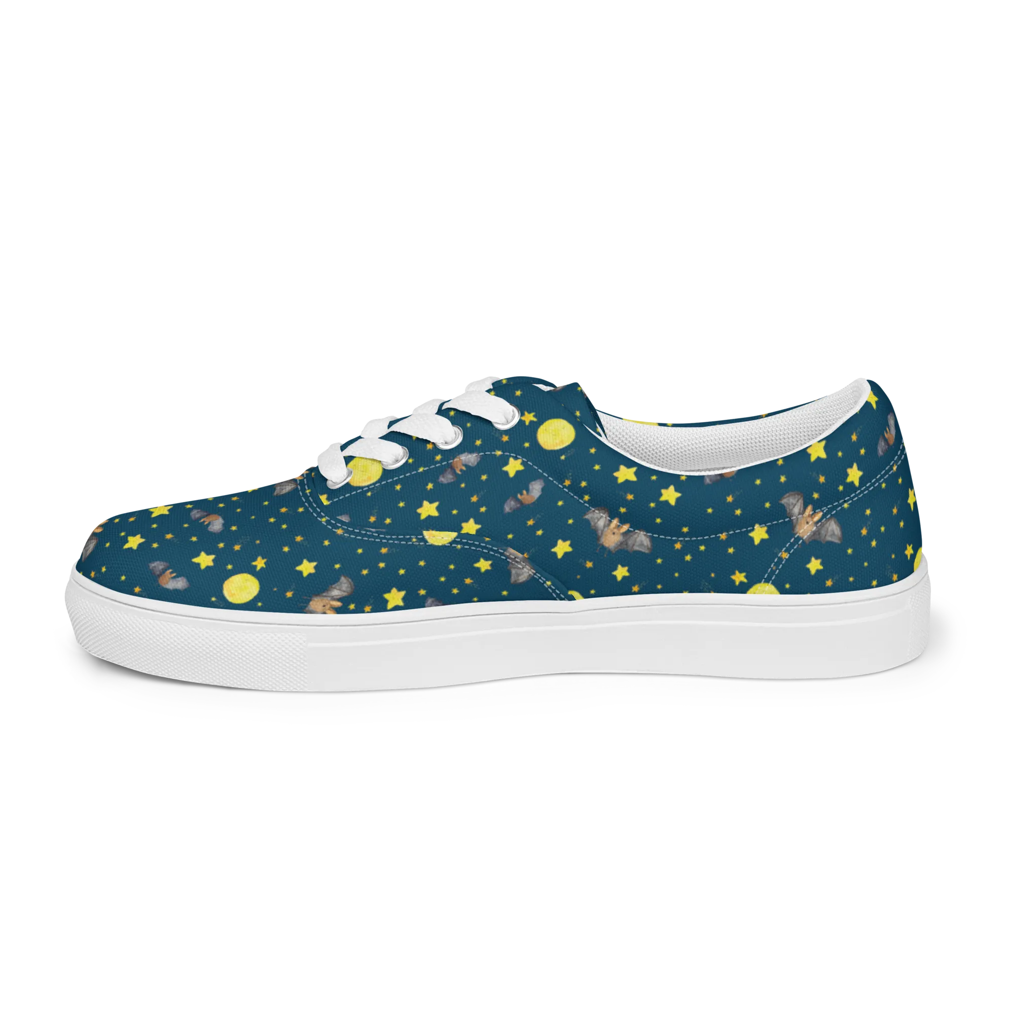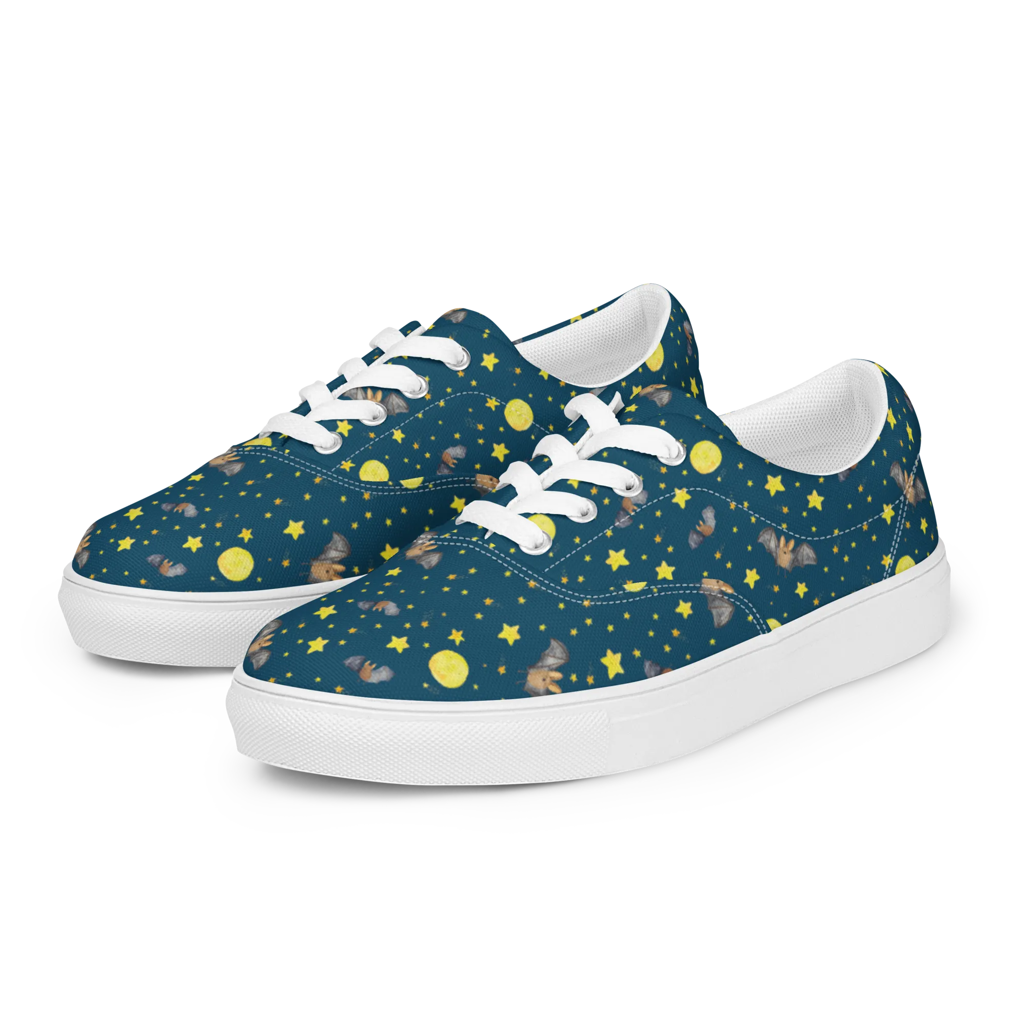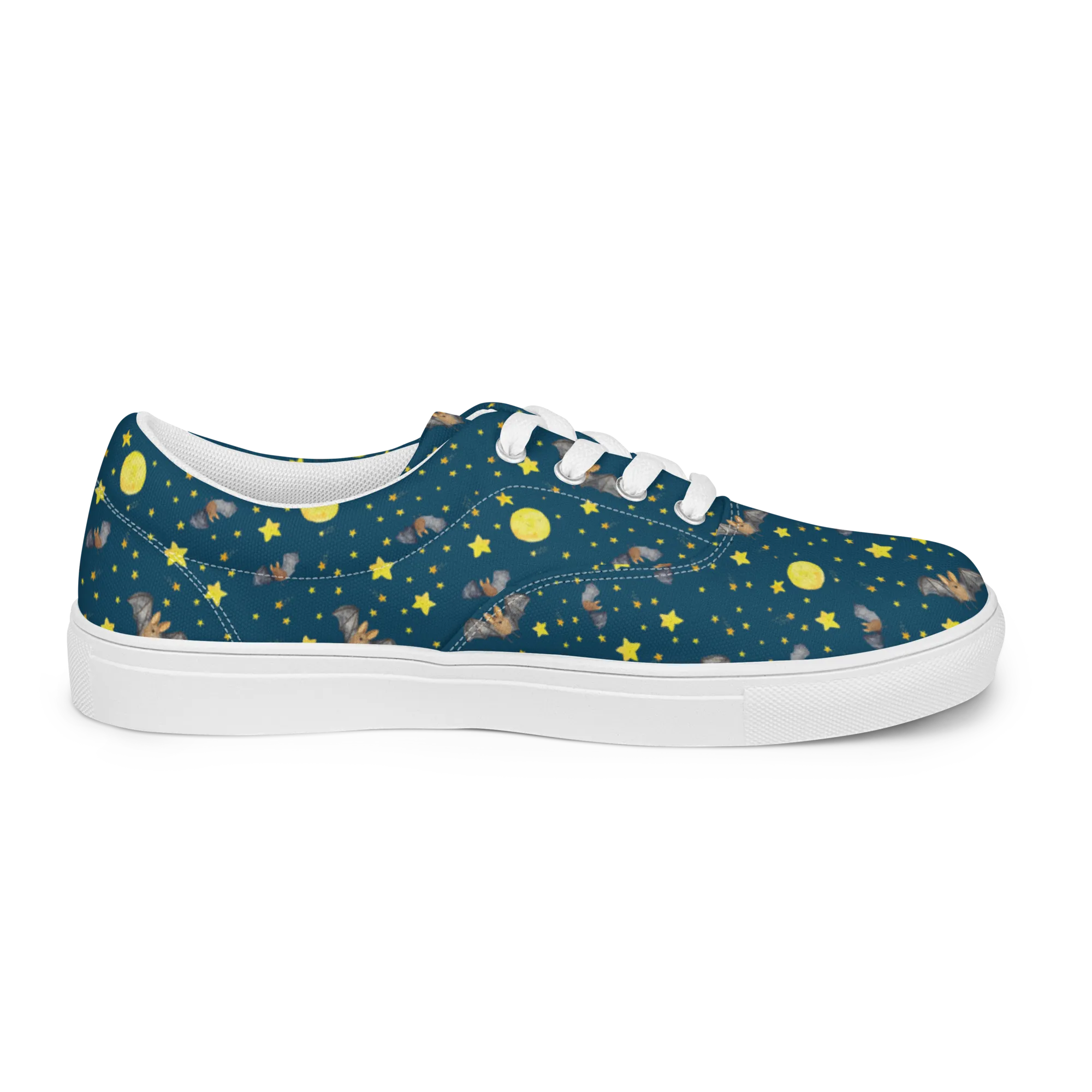 Unsere liebevoll gestalteten Damen Stoffschuhe tragen ein kleines Wunder der Nacht auf der Oberfläche: eine niedliche Fledermaus mit zarten Flügeln, die zum Träumen einlädt. Das Design verbindet Tiermotive und Gute Laune zu einem Sneaker, der deinen Alltag verschönert. Ob als Damen Turnschuh für Freizeit, Shopping oder gemütliche Stunden mit Freundinnen – dieser Stoffschuh ist ein echter Blickfang.