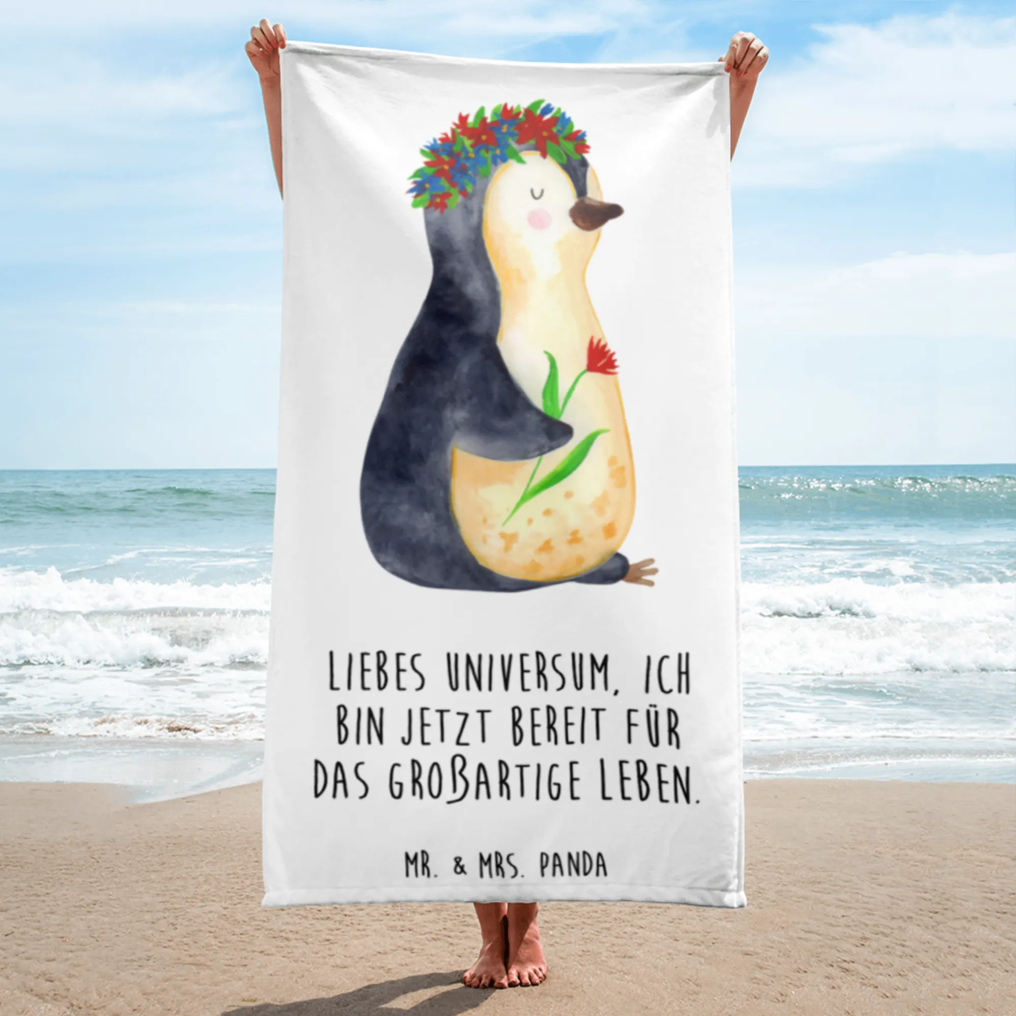 Imagine wrapping yourself in a warm hug from the universe – that’s exactly what our XL bath towel featuring the delightful penguin flowerwreath from Mr. & Mrs. Panda offers! This oversized towel isn’t just your average towel; it’s a statement piece that combines comfort and charm, perfectly suited for anyone looking to add a touch of whimsy and positivity to their beach or bath experience.