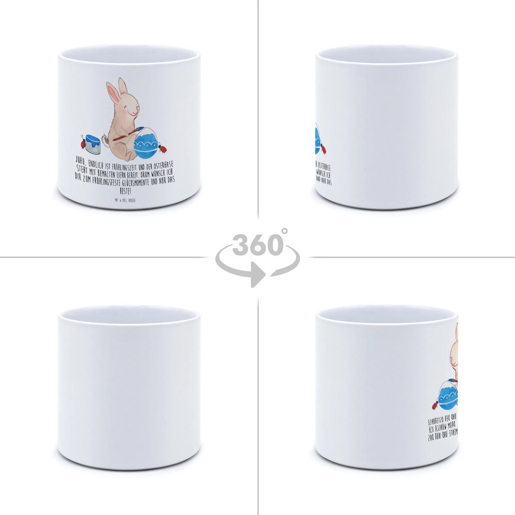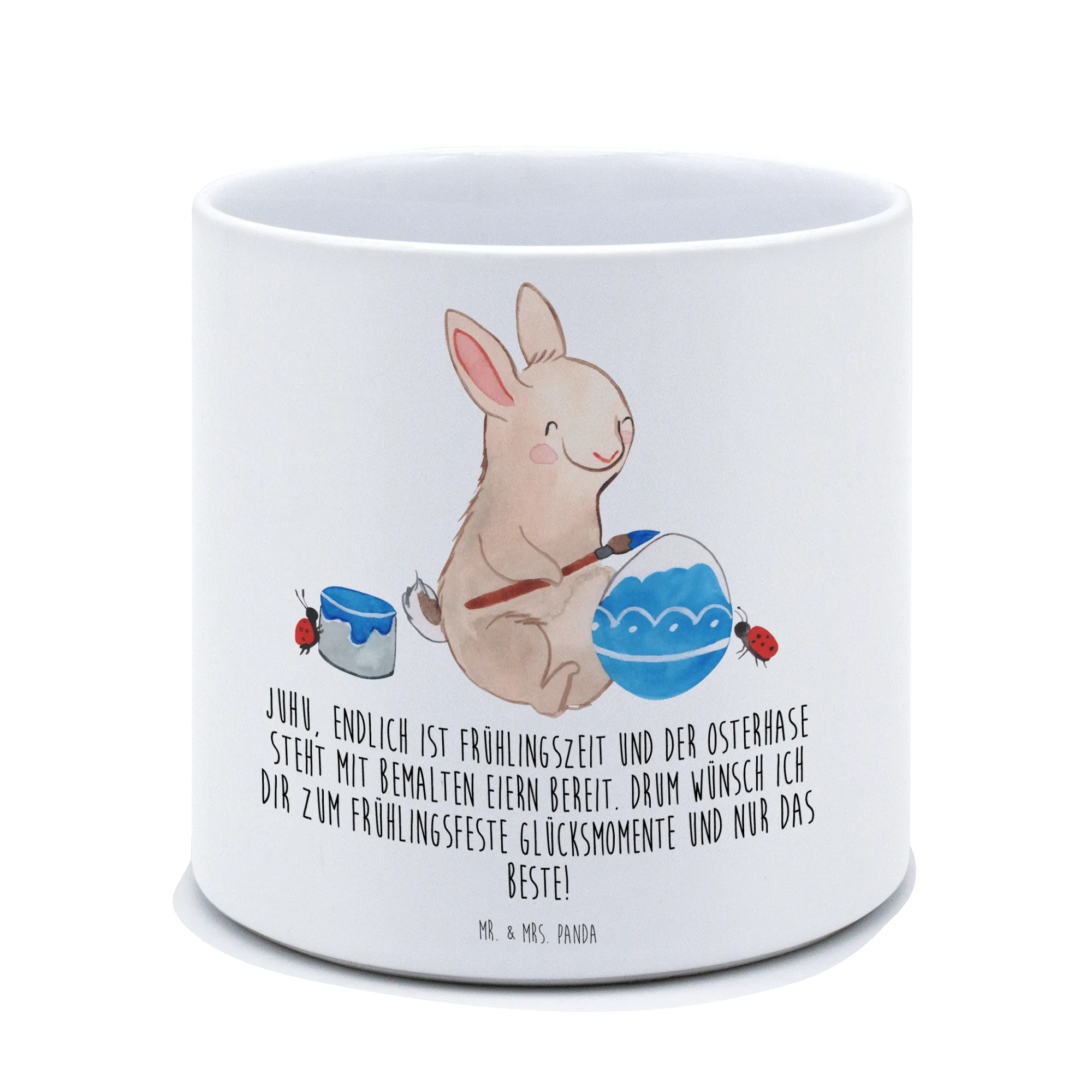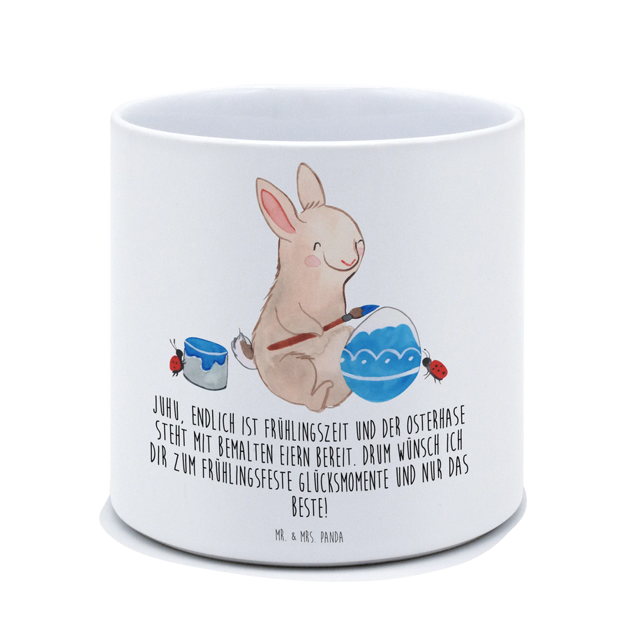 This enchanting flower pot is also perfect for Easter gifts, allowing you to present it beautifully filled with hand-painted eggs or even as a centerpiece for your spring picnics. With the lovely slogan, "Juhu, endlich ist Frühlingszeit und der Osterhase steht mit bemalten Eiern bereit. Drum wünsch ich dir zum Frühlingsfeste Glücksmomente und nur das Beste!", it carries a cheerful message that embodies the essence of the season.