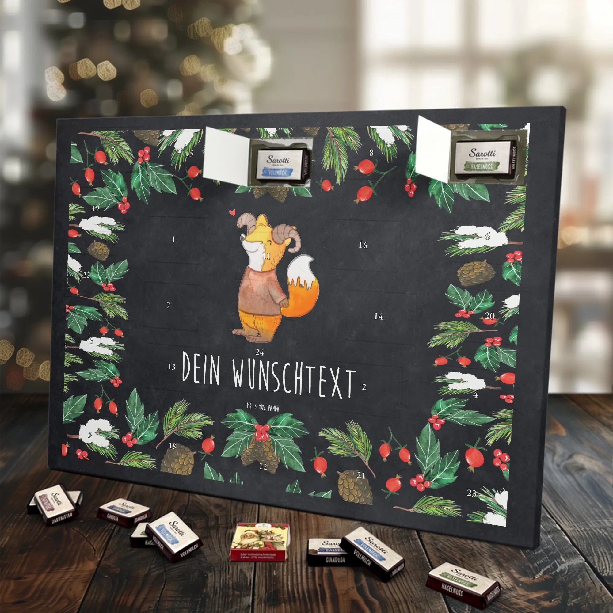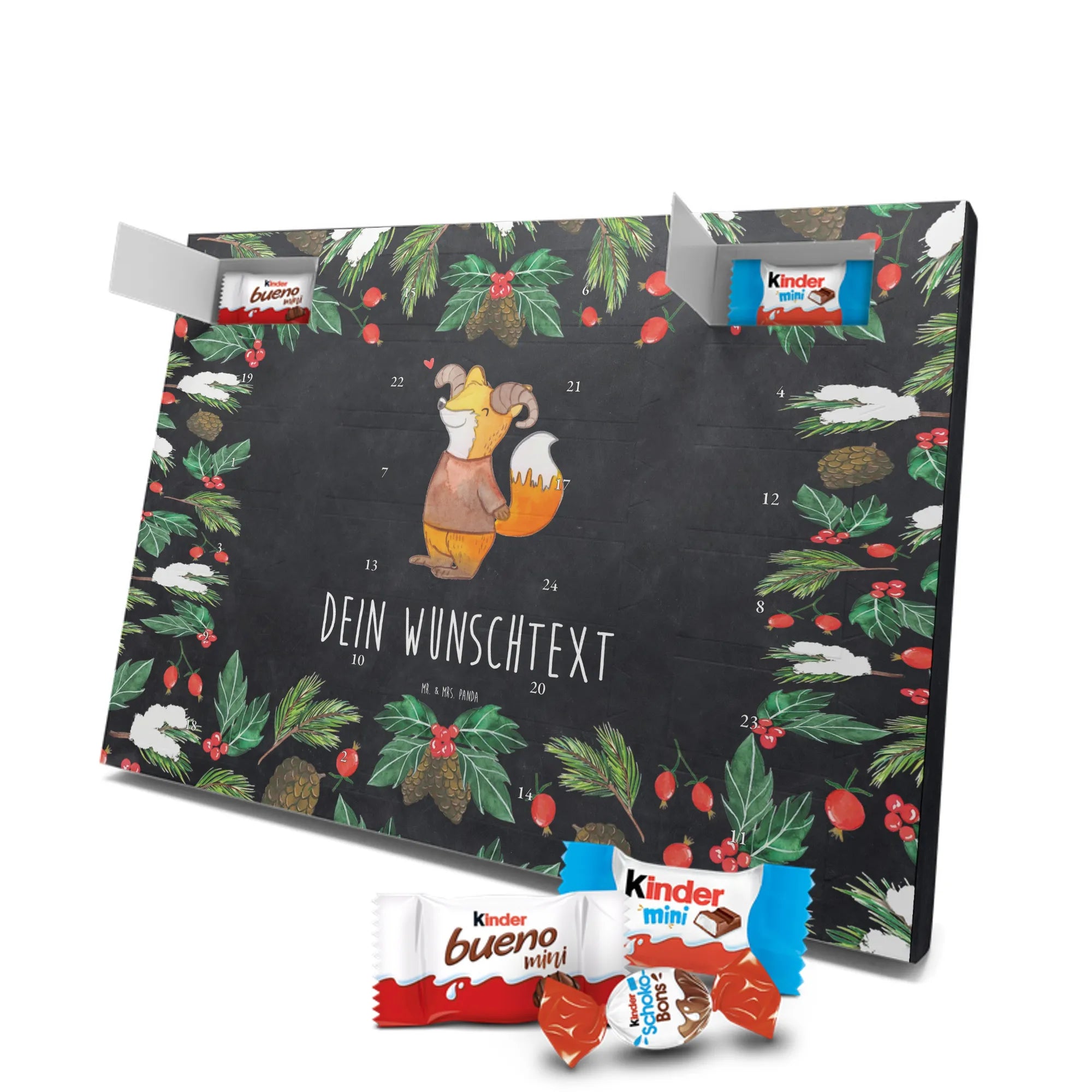 Make the Advent season even more special with the personalized chocolate Advent calendar from Mr. & Mrs. Panda. This unique Advent calendar is printed with your desired name or a custom text and features exclusive designs and sayings from the renowned designer duo. It's not only a visual highlight but also delights taste buds with 24 high-quality chocolate balls in various colors. The brilliant print quality and the silk-matte finish make this calendar a true eye-catcher during the Christmas season.
