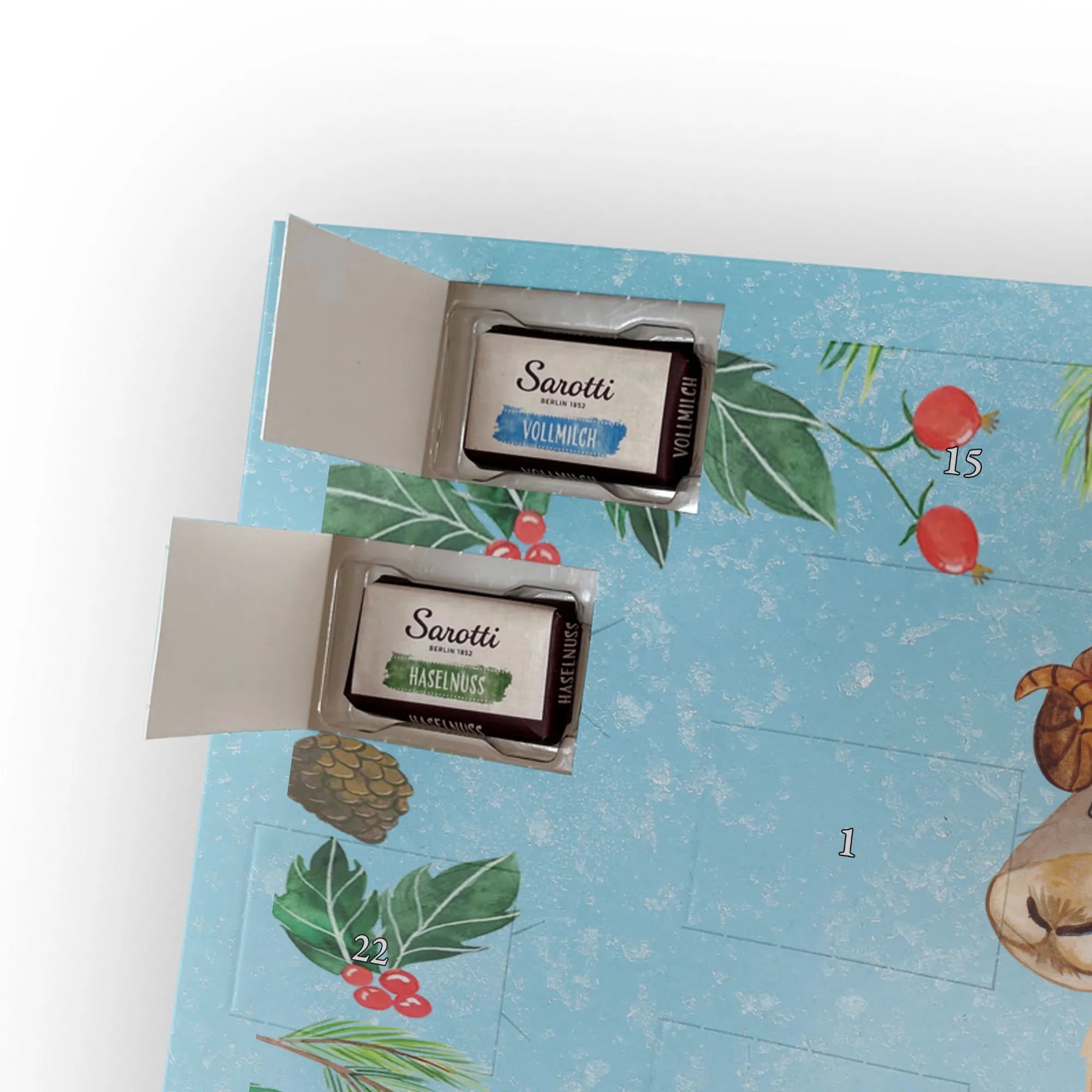 This handy advent calendar 2020 from Mr. & Mrs. Panda is really something very special - it is decorated with wonderful motifs and has the size 24m x 18cm x 2,5cm. It is filled with 24 chocolate balls and costs 14,90€ - the calendar can be hung up or set up using the set-up function on the back. Please note that we also have a larger calendar with delicious chocolate from Hello Lindt.