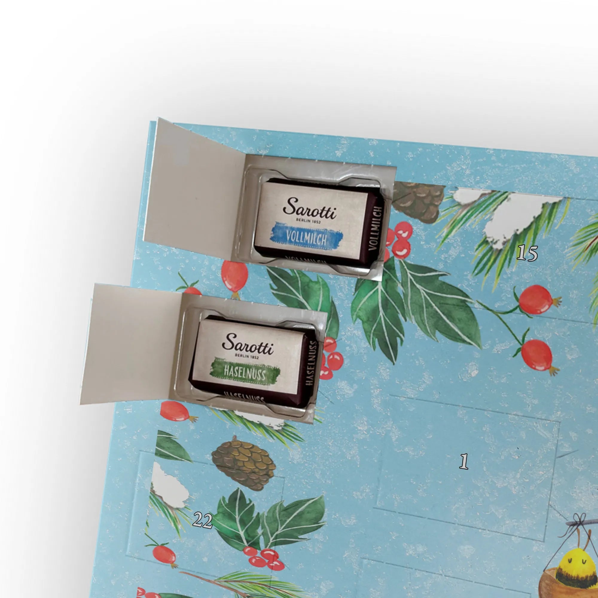 Make the Advent season even more special with the personalized chocolate Advent calendar from Mr. & Mrs. Panda. This unique Advent calendar is printed with your desired name or a custom text and features exclusive designs and sayings from the renowned designer duo. It's not only a visual highlight but also delights taste buds with 24 high-quality chocolate balls in various colors. The brilliant print quality and the silk-matte finish make this calendar a true eye-catcher during the Christmas season.