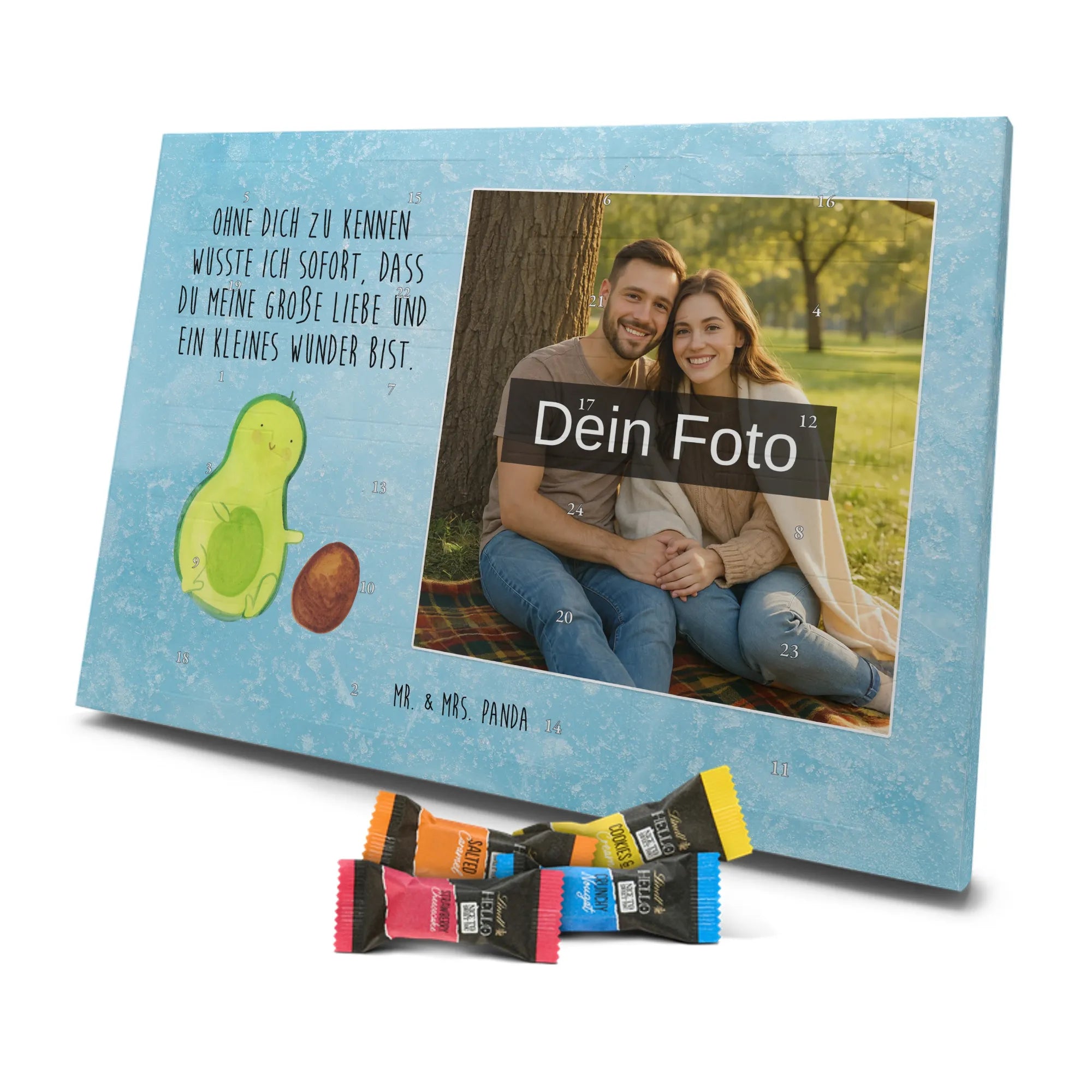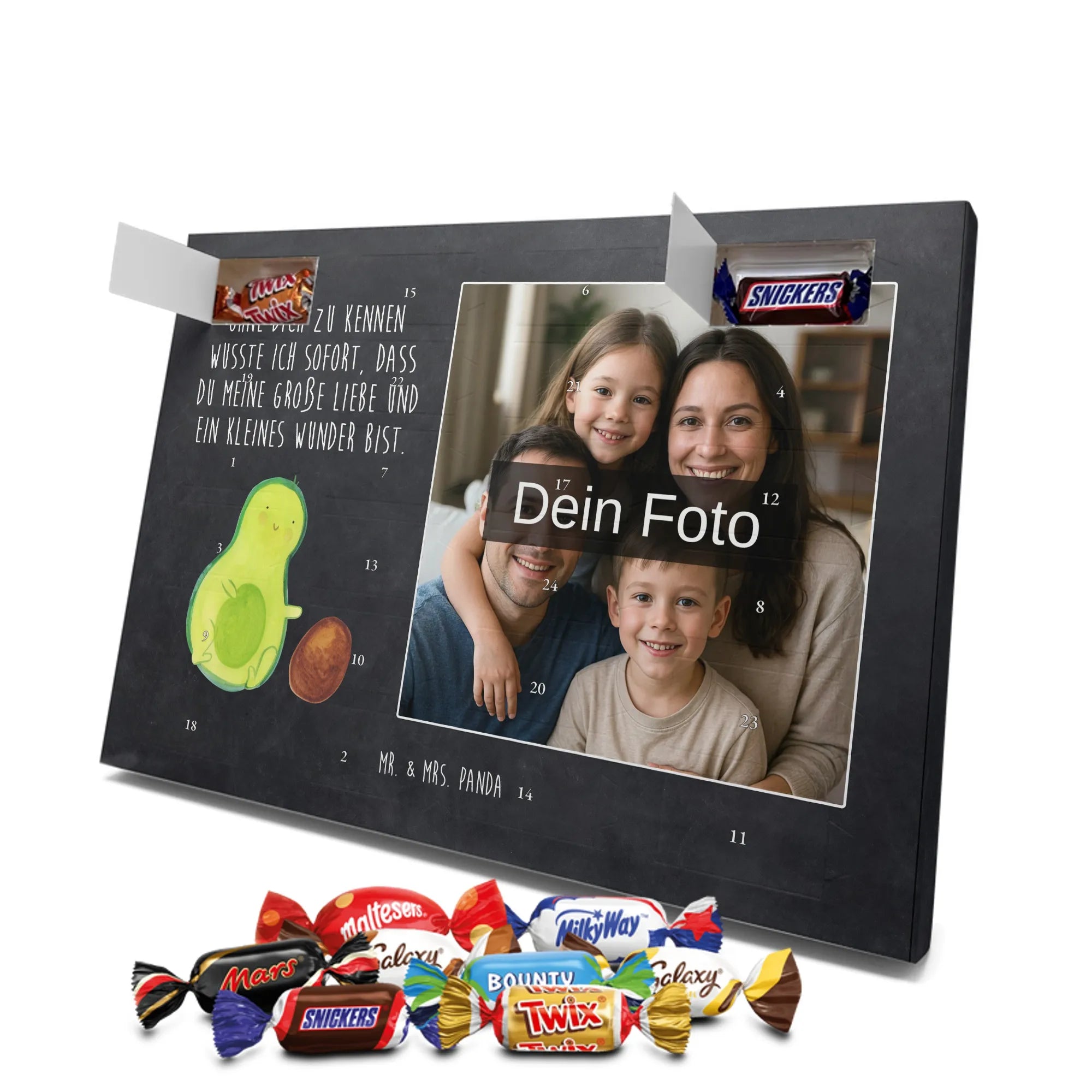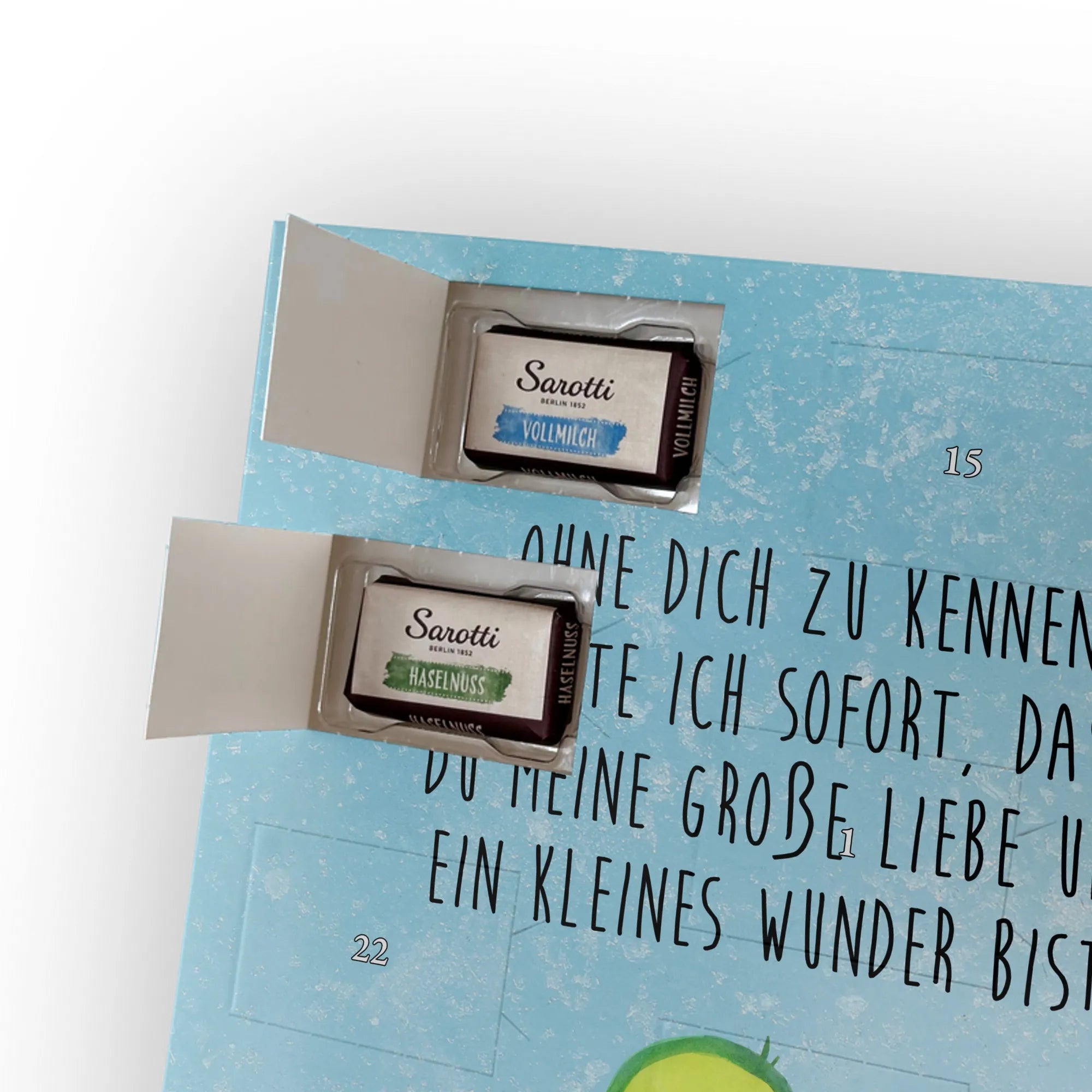 Personalisierter Schoko-Adventskalender mit Foto – das kleine Weihnachtswunder von Mr. & Mrs. Panda! Verschenke jeden Tag Vorfreude: Der Kalender ist liebevoll gestaltet mit unseren herzlichen Illustrationen und Sprüchen, während dein Foto die persönliche Mitte bildet. Bitte lade ein hochauflösendes Foto hoch und prüfe den Bildausschnitt, damit nichts Wichtiges verloren geht. Nutze nur Bilder, für die du die Rechte hast. Die hochwertige, seidenmatte Veredelung und die bedruckten Seitenflächen garantieren ein edles Erscheinungsbild. Maße: 355 mm x 245 mm x 11 mm; lässt sich sowohl aufhängen als auch aufstellen. Achtung: Fotos werden nicht nachbearbeitet oder zugeschnitten; personalisierte Artikel sind vom Rückgaberecht ausgeschlossen. Gefüllt mit 24 einzeln verpackten Schokoladentäfelchen aus den vier Geschmacksrichtungen Vollmilch, Nougat, Zartbitter und Haselnuss – von Sarotti® und Confiserie Heidel®. Insgesamt enthält der Kalender 107 g Markenschokolade. Ein persönliches Geschenk mit süßem Inhalt, ideal für Partner, Familie und Freunde, verpackt mit der typischen Mr. & Mrs. Panda Liebe zum Detail.