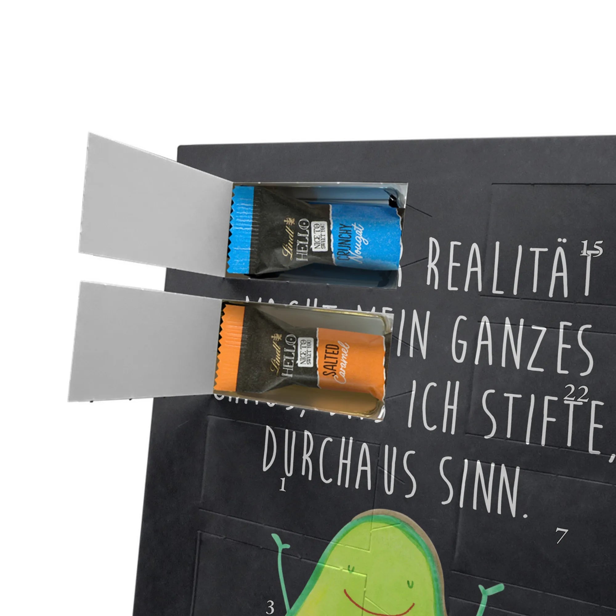 Entdecke unseren personalisierten Schoko-Foto-Adventskalender von Mr. & Mrs. Panda – ein liebevoll gestalteter Adventsbegleiter, der dich jeden Tag im Dezember mit süßen Überraschungen verwöhnt. Der Kalender ist mit charmanten Motiven und kurzen Sprüchen bedruckt und lässt sich mit deinem Lieblingsfoto personalisieren. Achte auf eine gute Bildqualität und den richtigen Bildausschnitt, damit dein Foto sauber gedruckt wird. Bitte nur Fotos hochladen, bei denen du die Rechte besitzt. Die hochwertige, seidenmatte Oberfläche und die bedruckten Seitenflächen verleihen dem Kalender einen besonderen Look. Maße: 325 mm x 225 mm x 27 mm. Innen findest du 24 einzeln verpackte Schokoladen Mini Sticks in vier köstlichen Sorten: Karamell-Schokoladenkuchen, Kekse, Knuspriger Nougat und Erdbeer-Cheesecake. Gefüllt mit Lindt Hello Schokolade. Wichtige Hinweise: Allergene wie Milcheiweiß, Milchzucker, Soja, Weizen und Haselnüsse sind enthalten. Kann Spuren von Mandeln und anderen Schalenfrüchten enthalten. Der Kalender kann aufgehängt oder aufgestellt werden. Hinweis: Fotos werden nicht nachbearbeitet oder zugeschnitten – Rücknahme ausgeschlossen. Verschenke Vorfreude mit deinem individuellen Foto-Adventskalender!