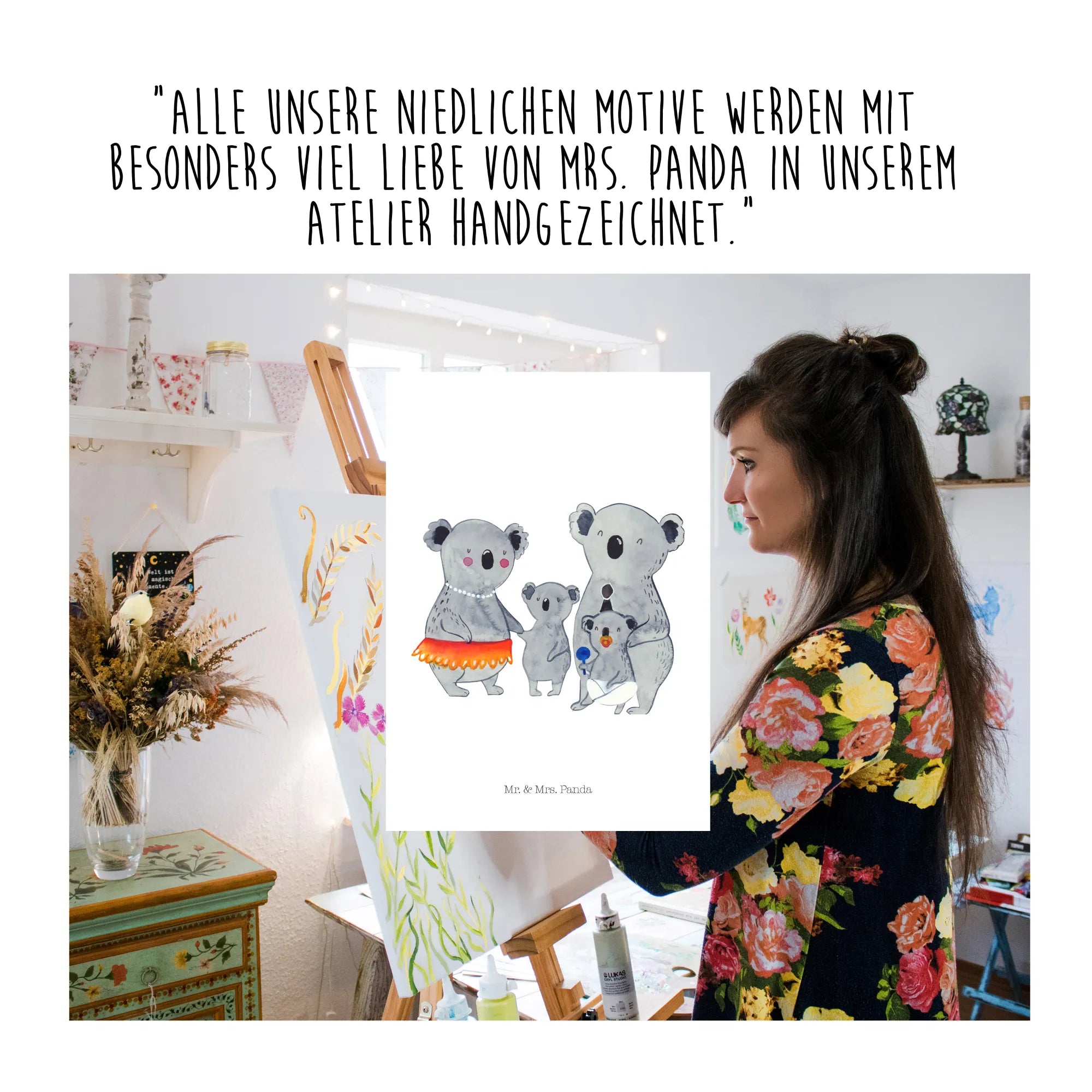 Each koala portrays an inviting expression, capturing the essence of family joy and the magic of togetherness. Can you resist the cuteness of two bigger koalas wearing playful accessories, like a pearl necklace and a party hat, while the smaller koalas cuddle close, holding a bib and a toy?
