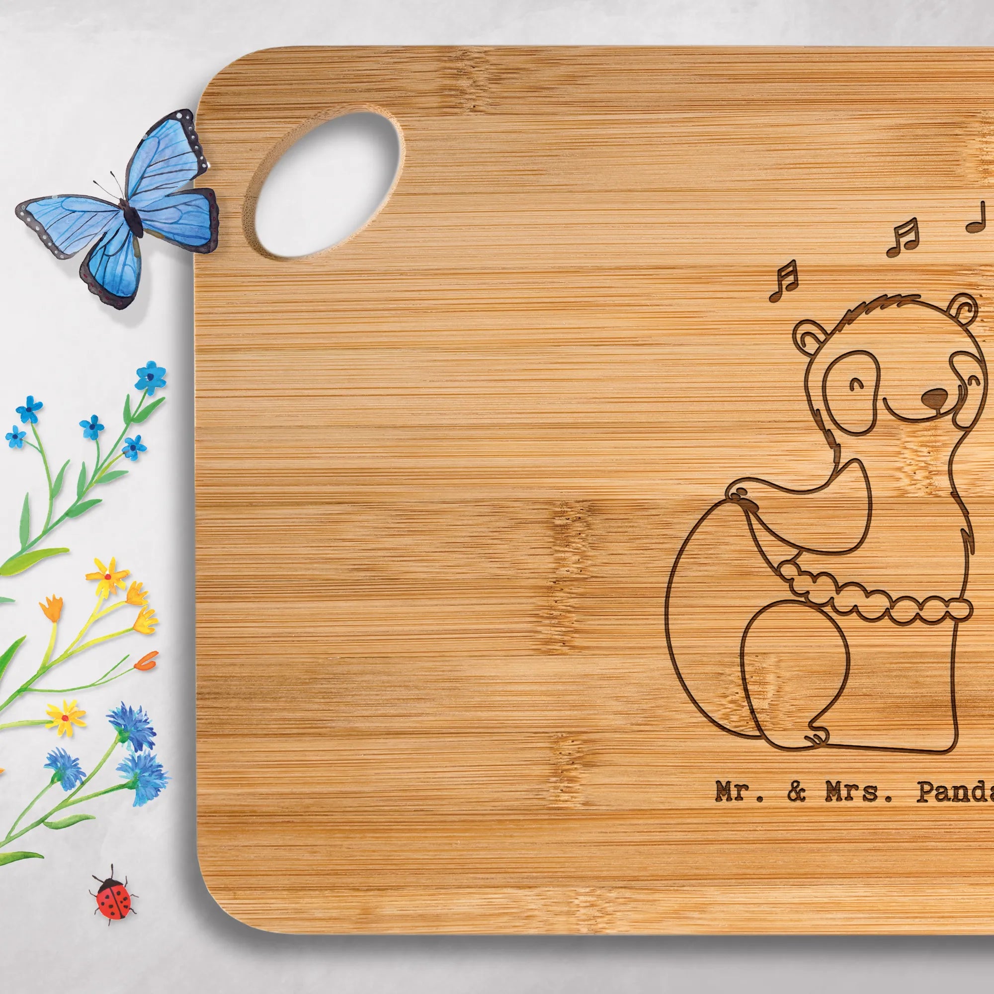 🐼 Hochwertiges Bambus-Schneidebrett mit robuster Beschaffenheit und liebevoller Gravur – ideal für Speisen und Frühstück.