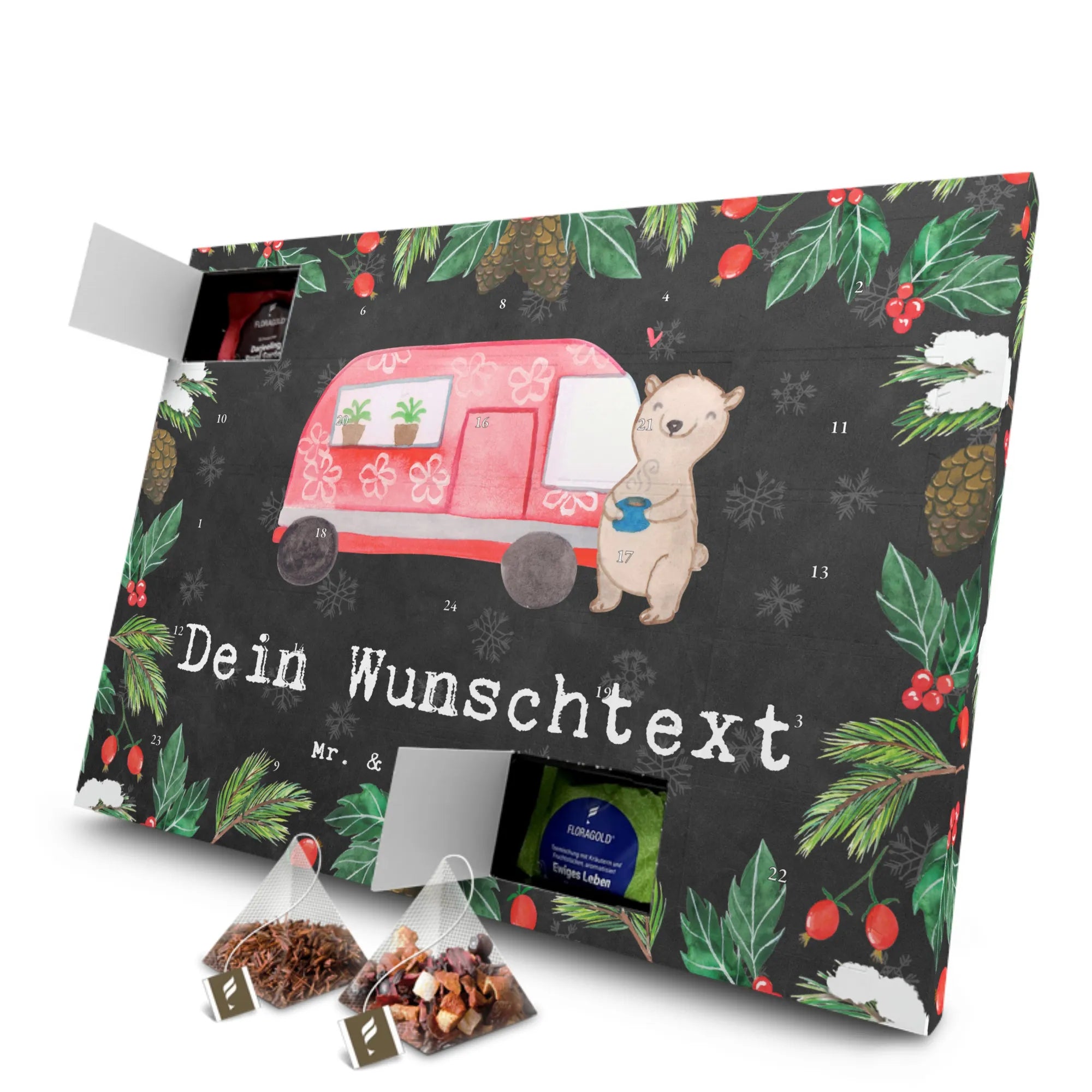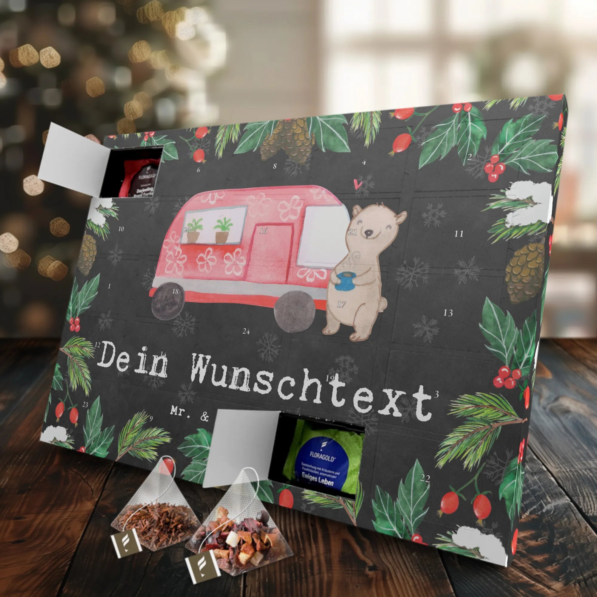 Der personalisierte Tee Adventskalender Bär Camper Medizin von Mr. & Mrs. Panda ist das perfekte Geschenk für alle Camping- und Teeliebhaber. Mit seinem niedlichen Motiv eines glücklichen Bären vor einem Camper mobilisiert er die Wanderlust und zaubert jedem ein Lächeln ins Gesicht.