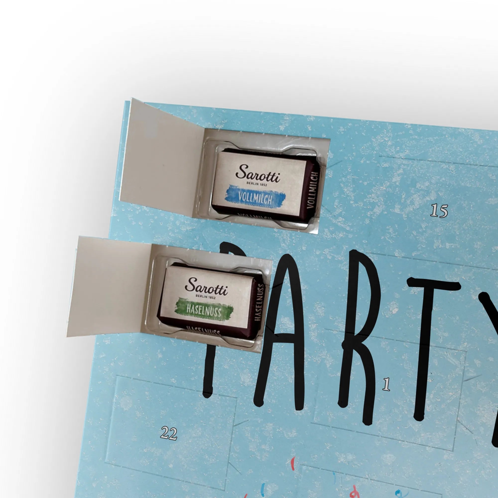 🐼 LECKERE FÜLLUNG: 24 Täfelchen, 107 g Markenschokolade (Sarotti® & Confiserie Heidel®) in vier Sorten.