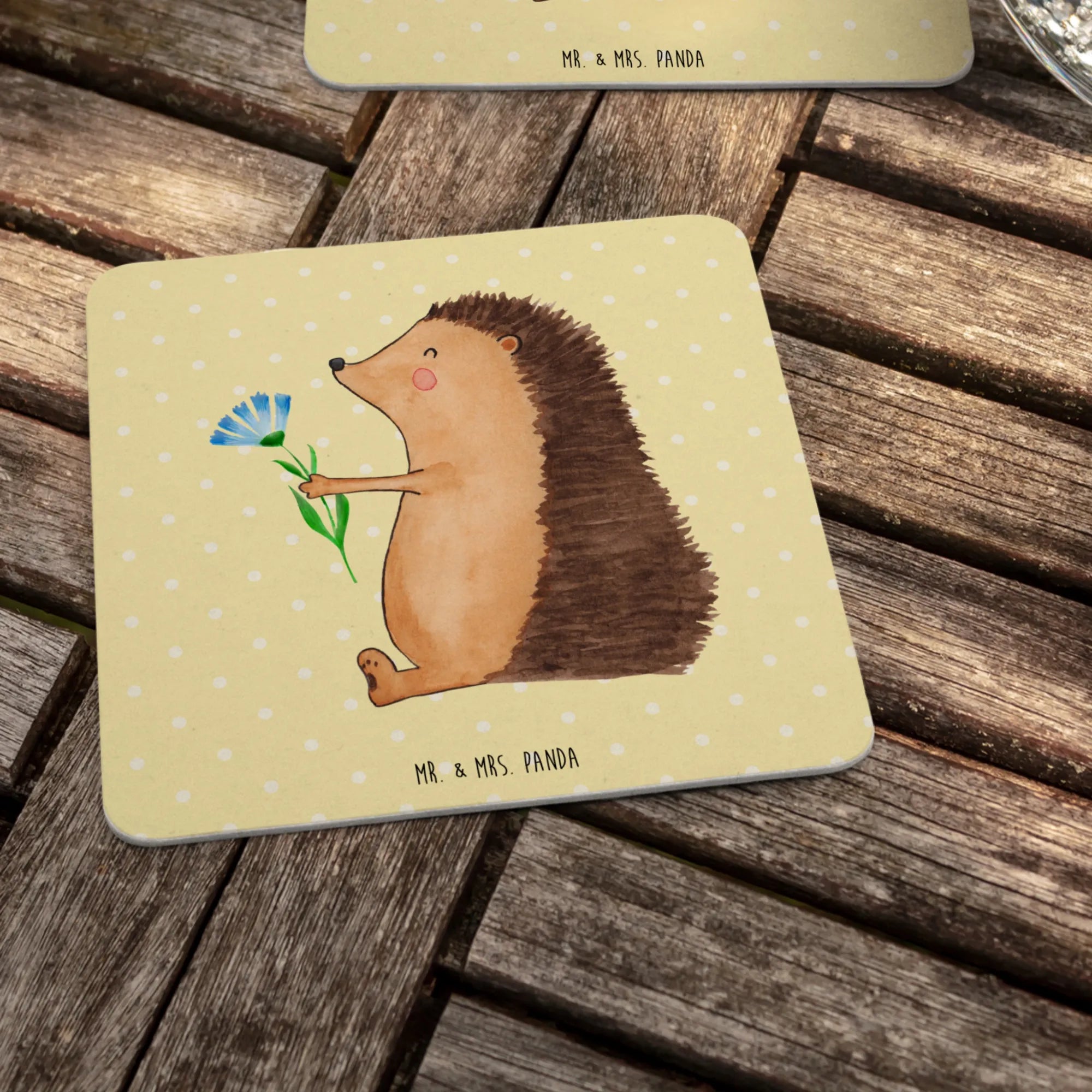 Mit den Maßen von 95 mm x 95 mm passt er perfekt auf jeden Esstisch und schützt diesen vor unschönen Kratzern und Wasserflecken. Die putzige Illustration eines Igels, der eine bunte Blume in der Hand hält, bringt ein Lächeln auf die Gesichter deiner Gäste. Die leuchtend gelbe Hintergrundfarbe sorgt für gute Laune und erinnert an sonnige Tage im Frühling und Sommer.