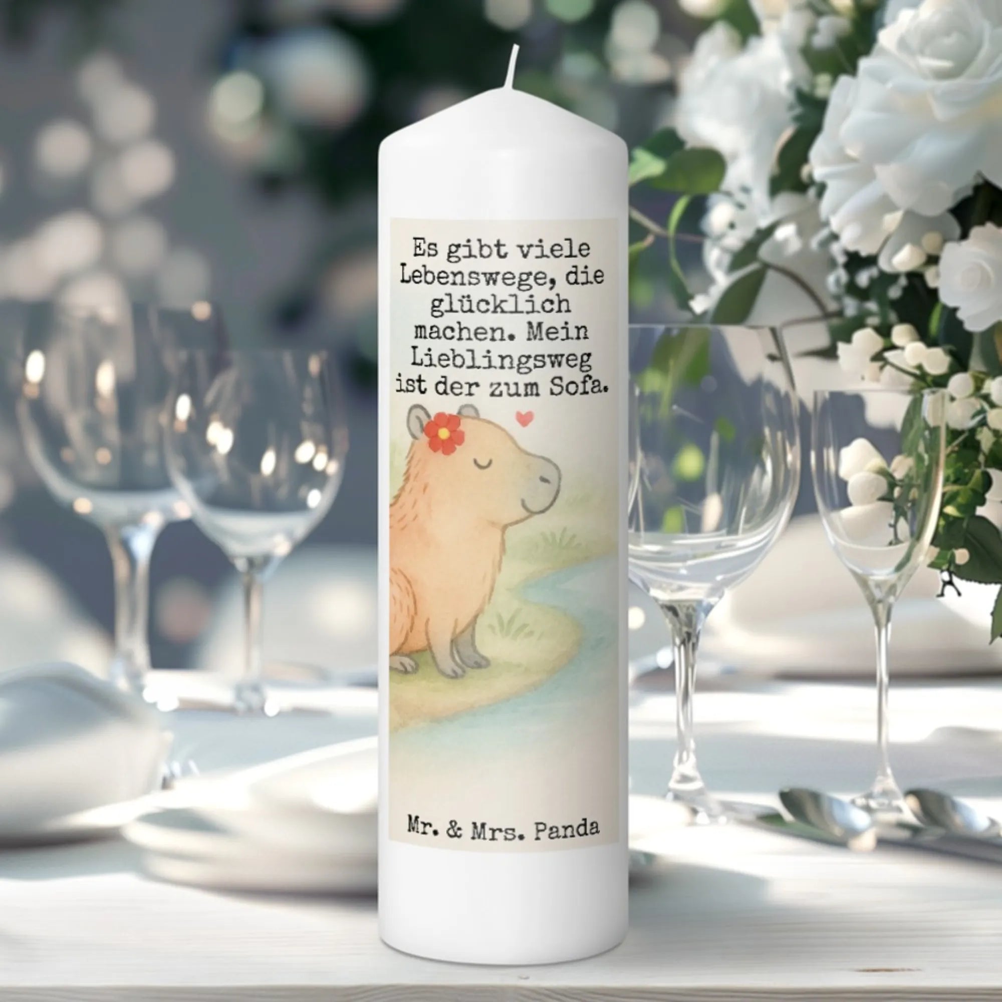In der gemütlichen Welt von Mr. & Mrs. Panda gibt es viele kleine Momente des Glücks zu entdecken. Auf diesem liebevollen Motiv findest du ein friedvolles Capybara, das mit geschlossenen Augen und einem sanften Lächeln pure Entspannung ausstrahlt. Das Highlight ist die verspielte rote Blume mit gelber Mitte, die frech auf seinem Kopf thront und dem Tier einen zauberhaften Ausdruck verleiht. Ein kleines Herz über dem Capybara rundet die liebevolle Szenerie ab und bringt die besondere Wärme des Moments zur Geltung. Die Illustration ist warm und sanft coloriert, was die beruhigende Ausstrahlung noch verstärkt. Der Spruch 'Es gibt viele Lebenswege, die glücklich machen. Mein Lieblingsweg ist der zum Sofa.' passt perfekt zu der friedlichen Atmosphäre und entführt dich auf einen entspannten Weg voller einfach zu findendem Glück.