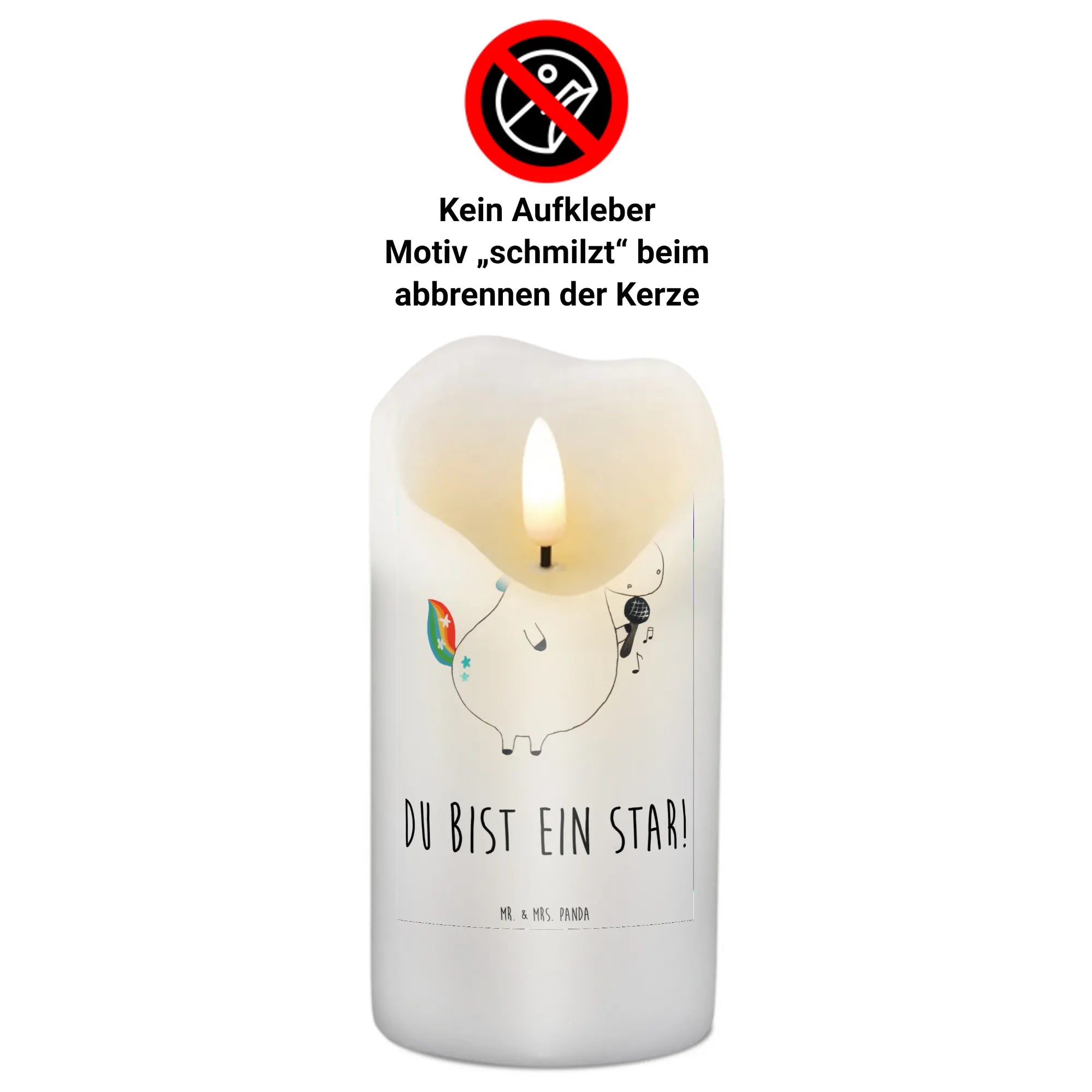 Measuring 15 x 7 cm and crafted from premium paraffin wax, our Unicorn Singer Candle features a delightful design of a unicorn singing into a microphone, paired with the charming slogan "Du bist ein Star!". This makes it an ideal gift for unicorn lovers and aspiring young singers alike. Imagine the twinkling eyes of a birthday girl or boy lighting up when they see this colorful, sparkling addition to their birthday cake or party table.