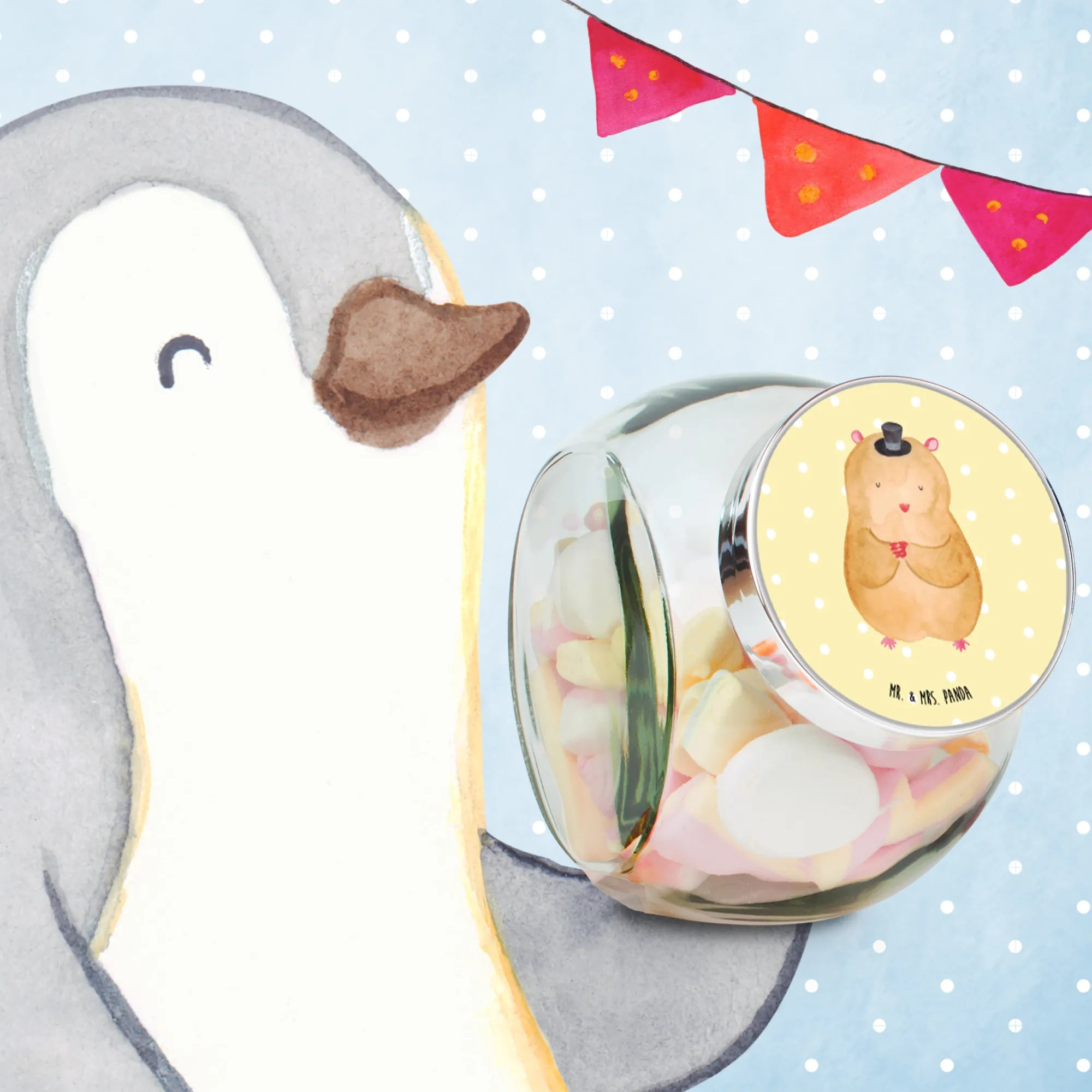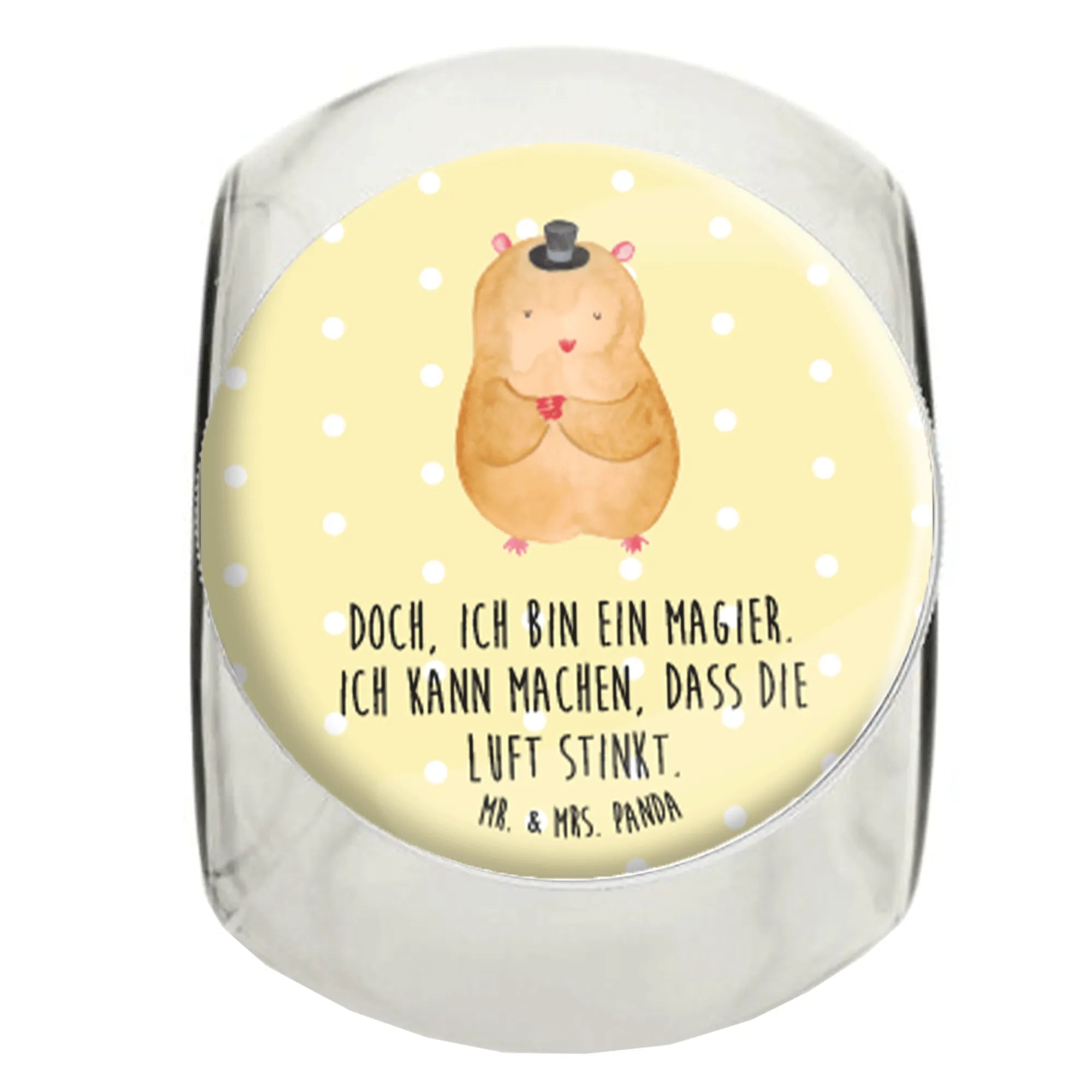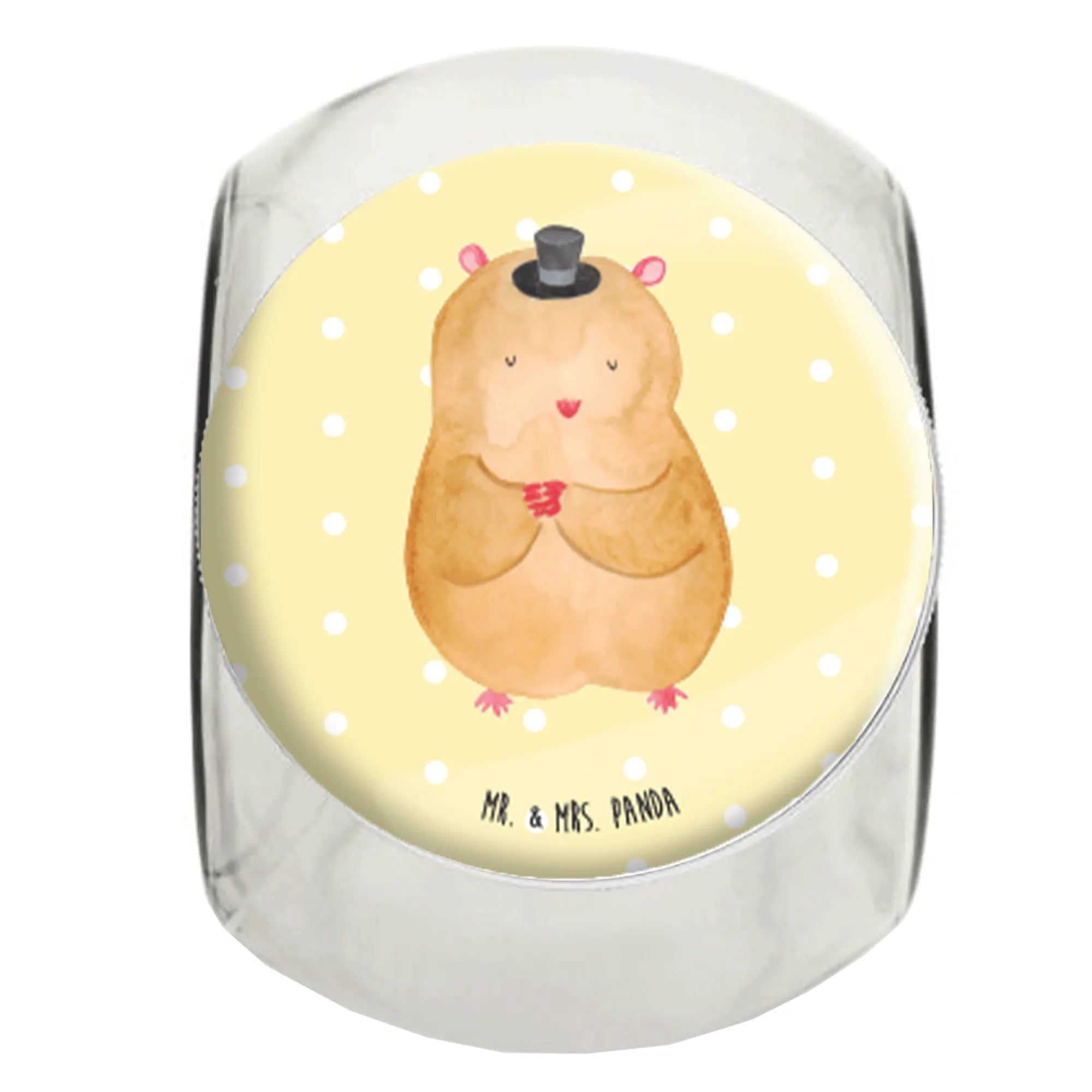 Crafted from premium glass, this candy jar shines with a glossy finish that showcases the vibrant, hand-drawn design by Mrs. Panda. The little hamster, complete with its charming top hat, is not only an endearing depiction but also a conversation starter for friends and family alike. It features a secure silver-colored screw cap, ensuring the freshness and aroma of your favorite snacks—whether it be sweet candies, crunchy cookies, or savory teas—are preserved perfectly. With a generous capacity of 870 ml (29 oz), this jar offers ample space for all your favorite goodies.