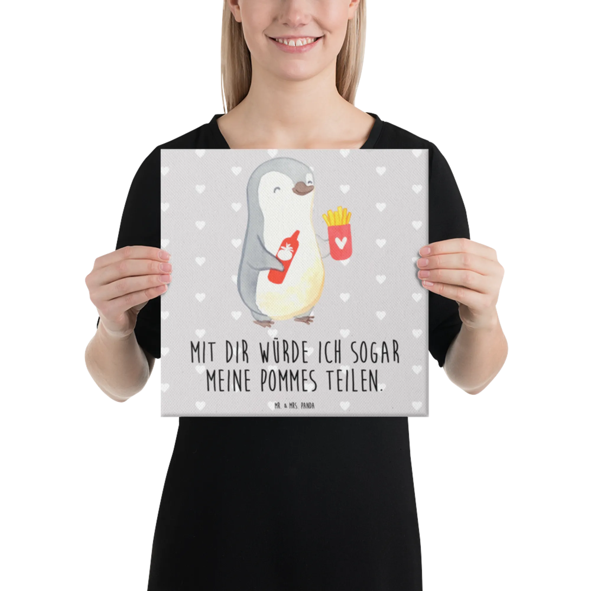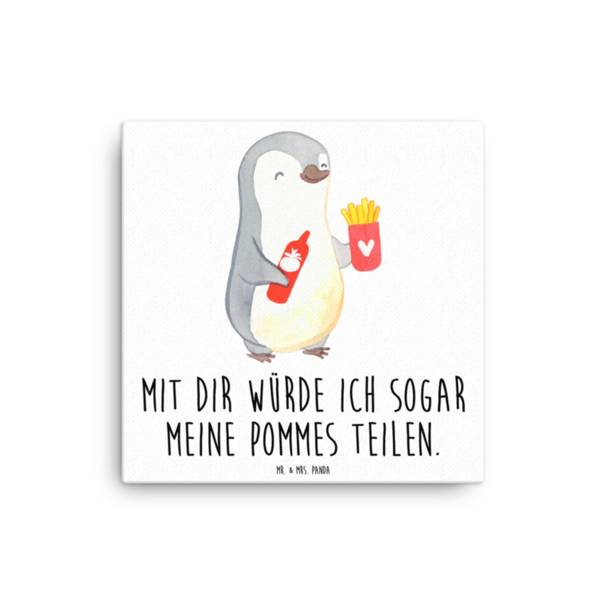 Our charming penguin motif brings a splash of warmth and joy, perfect for sharing love and laughter with someone special. Holding a cup of fries in one wing and a bottle of ketchup in the other, this delightful penguin reflects a playful spirit and a heart full of affection. The slogan, 'Mit dir würde ich sogar meine Pommes teilen,' captures the essence of true love — the willingness to share even the smallest delights. Ideal as a Valentine's Day gift or a sweet anniversary surprise, this motif is crafted with soft colors and a friendly expression that resonates with the warmth of connection. Whether it’s for a girlfriend, partner, or husband, this little guy symbolizes all the fun and happiness that come with being together. Every glance at this lovable penguin is a reminder that love is about sharing the good times, even when it comes to the crispiest fries.