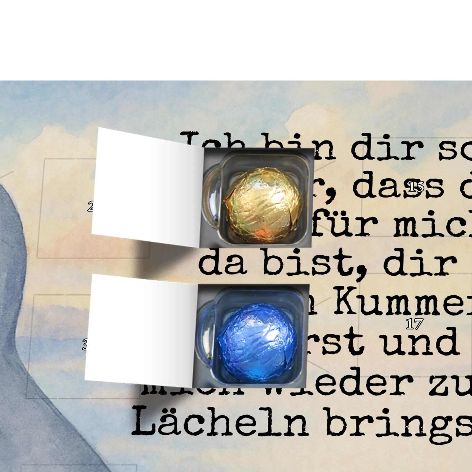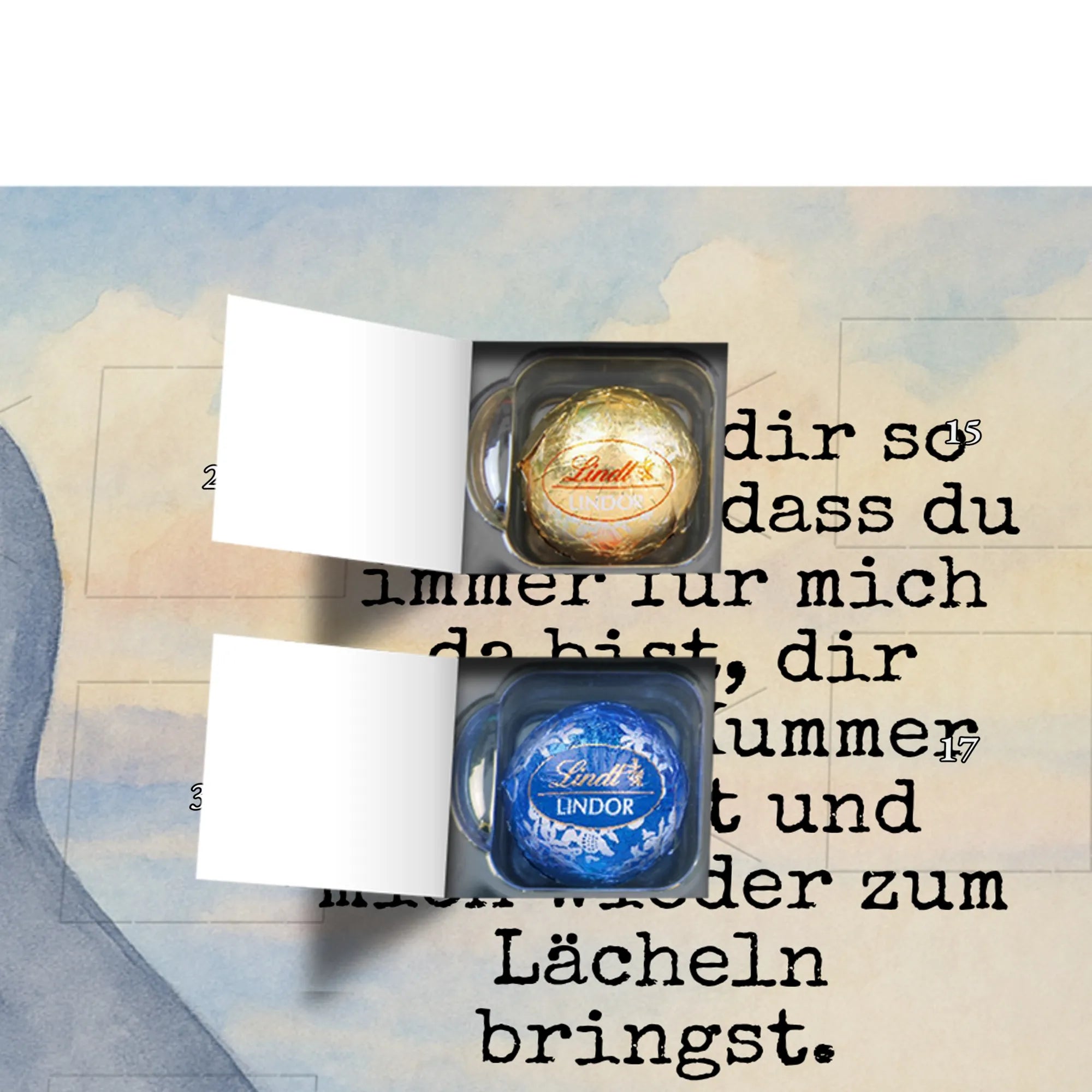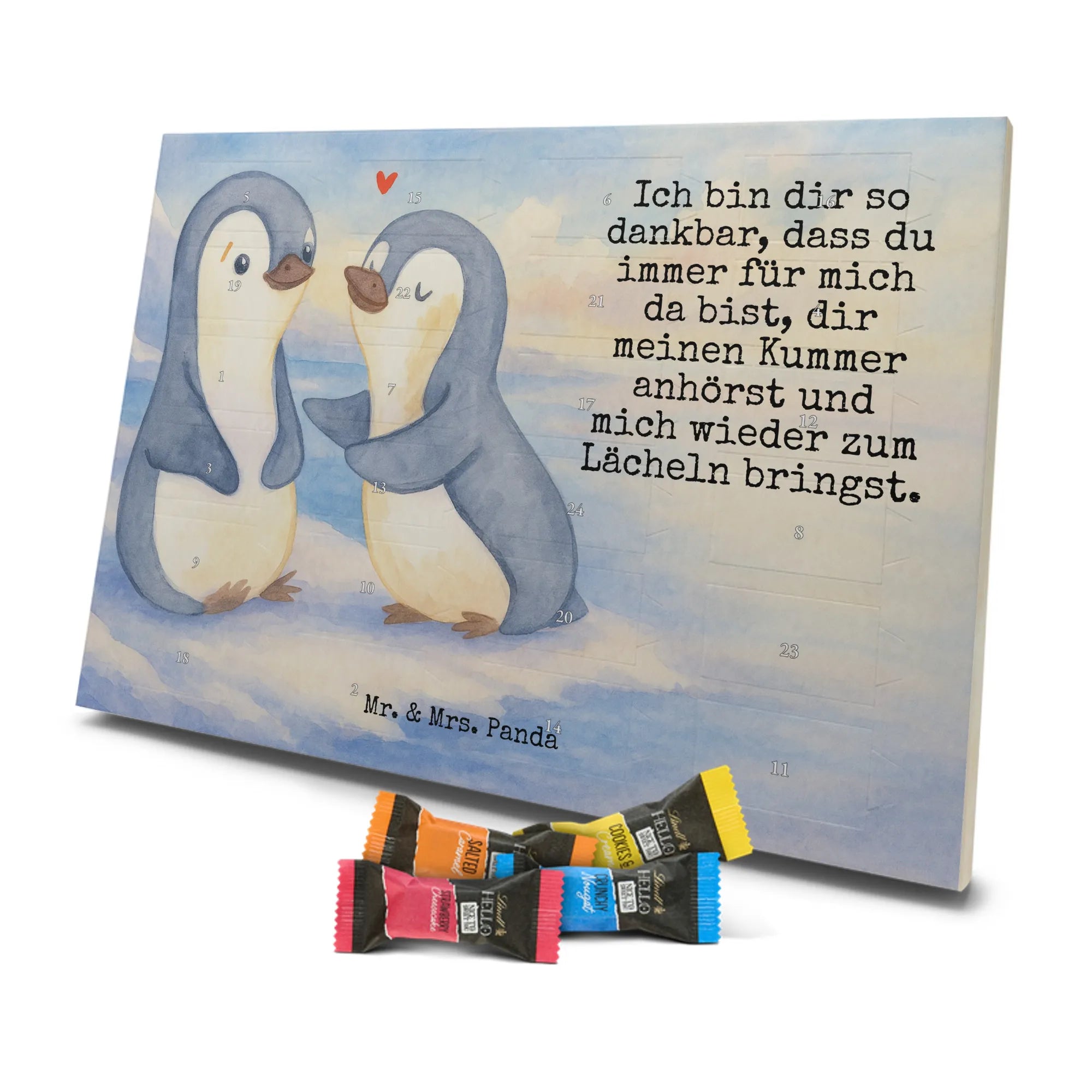 Dieser Schokoladen Adventskalender aus der Liebe-Kollektion von Mr. & Mrs. Panda vereint zärtliches Design und köstlichen Genuss. Auf dem Motiv sind zwei Pinguine zu sehen, die sich zärtlich zuneigen und einander Trost und Wärme schenken. Der vollflächig gedruckte Spruch „Ich bin dir so dankbar, dass du immer für mich da bist, dir meinen Kummer anhörst und mich wieder zum Lächeln bringst.“ macht den Kalender zu einem besonderen Liebesbeweis – ideal als Adventskalender mit Schokolade für die Freundin, den Freund oder den Ehemann.