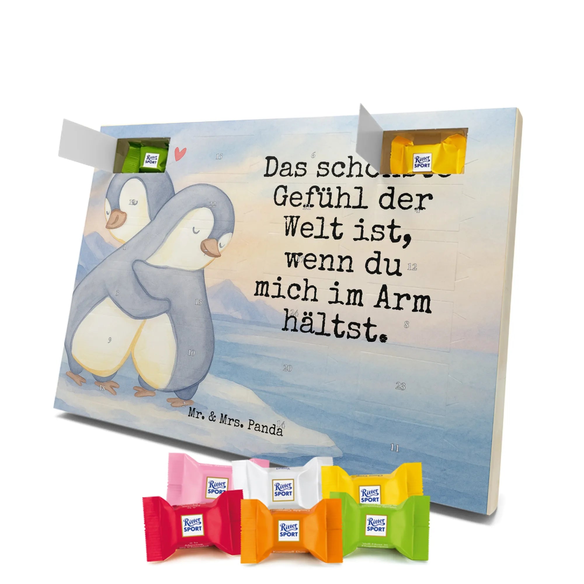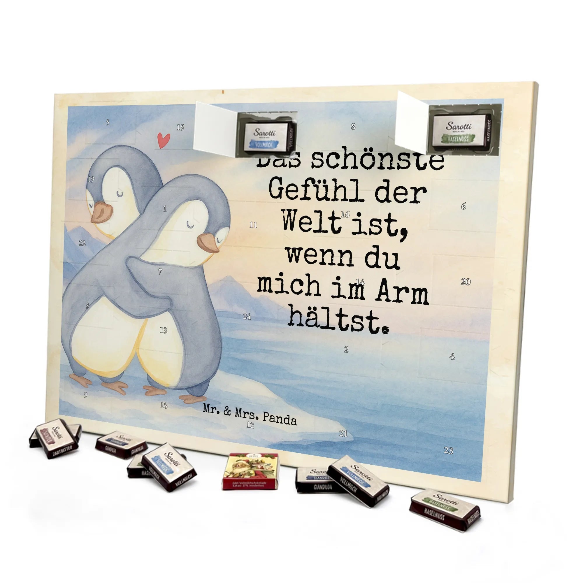 Mr. & Mrs. Panda Schoko Adventskalender „Pinguine Kuscheln“ aus der Liebe Kollektion ist das zuckersüße Geschenk für Verliebte und alle, die Vorfreude mit Gefühl verbinden. Auf dem liebevoll gestalteten Motiv umarmen sich zwei Pinguine, handgezeichnet in sanften Grau- und Beigetönen, mit einem kleinen roten Herz – begleitet vom Spruch: „Das schönste Gefühl der Welt ist, wenn du mich im Arm hältst.“