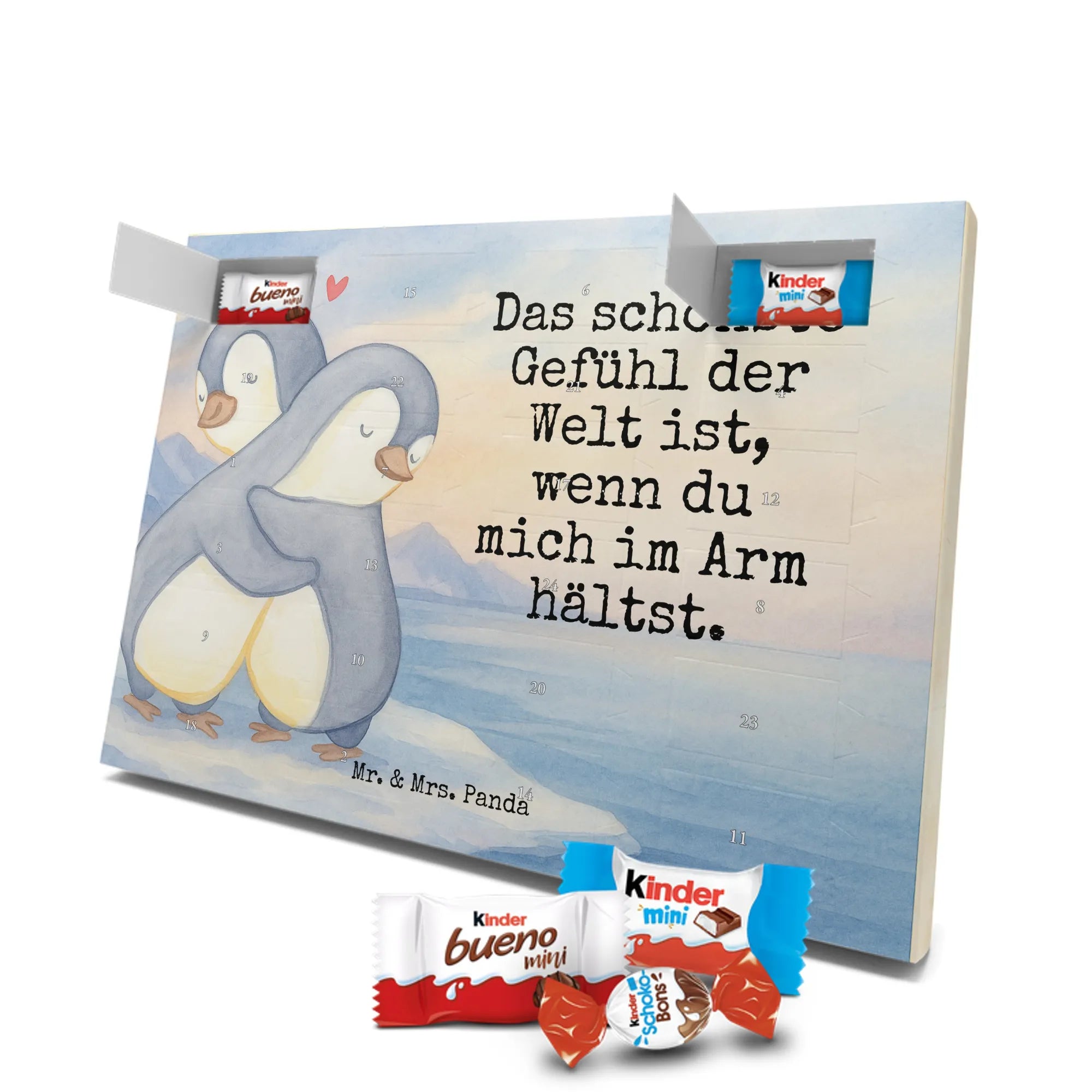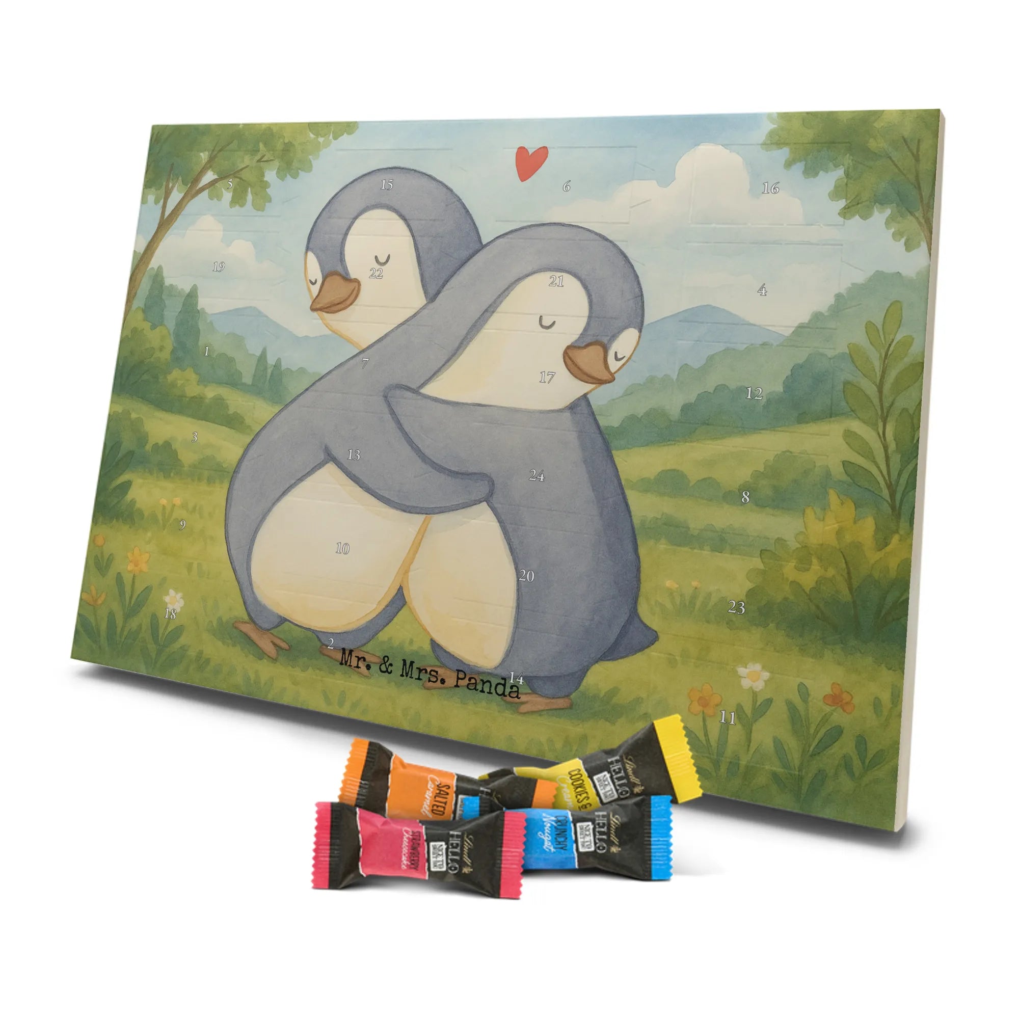 Unser liebevoll gestalteter Schokoladen Adventskalender aus der Liebe-Kollektion von Mr. & Mrs. Panda ist das perfekte Geschenk für Verliebte und alle, die in der Adventszeit gern Zuneigung teilen. Das Motiv zeigt zwei ineinander geschmiegte Pinguine in sanften Grau- und Beigetönen mit einem kleinen roten Herz – ein Bild, das Geborgenheit und Nähe ausstrahlt.