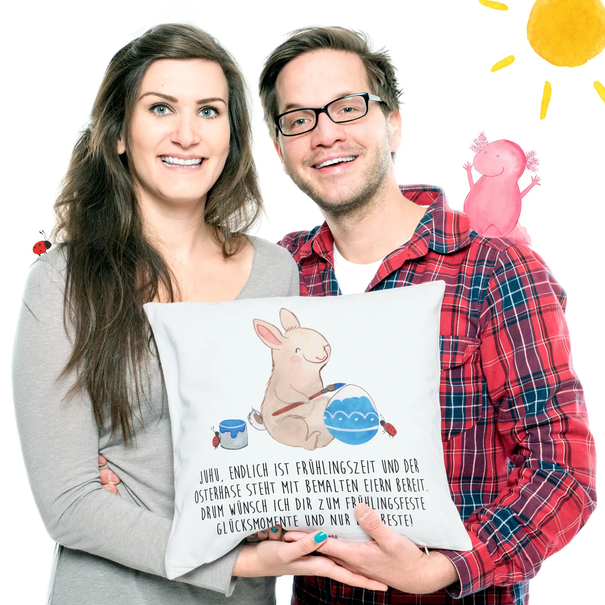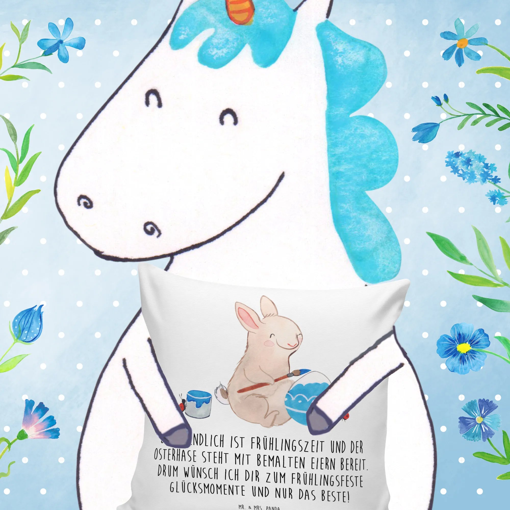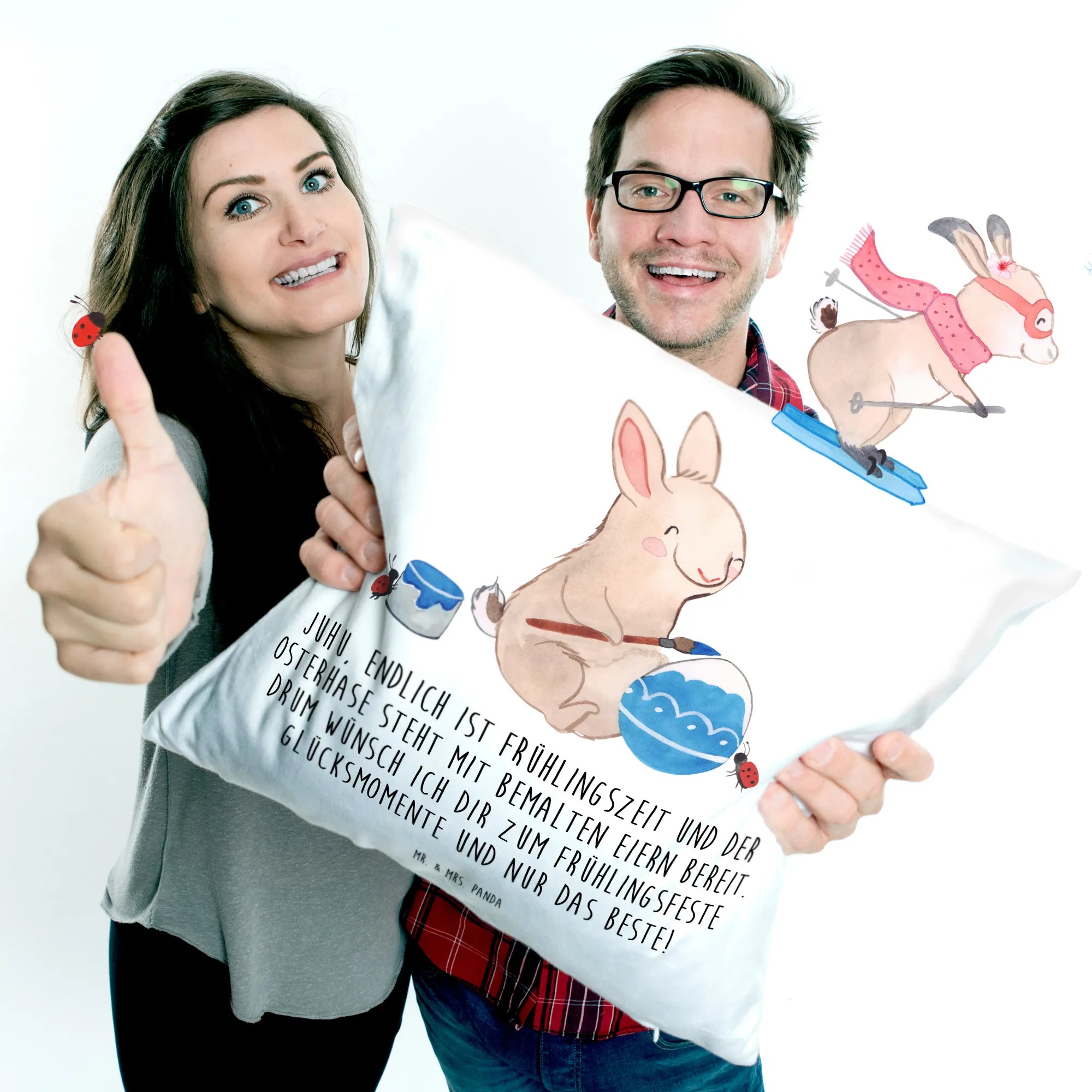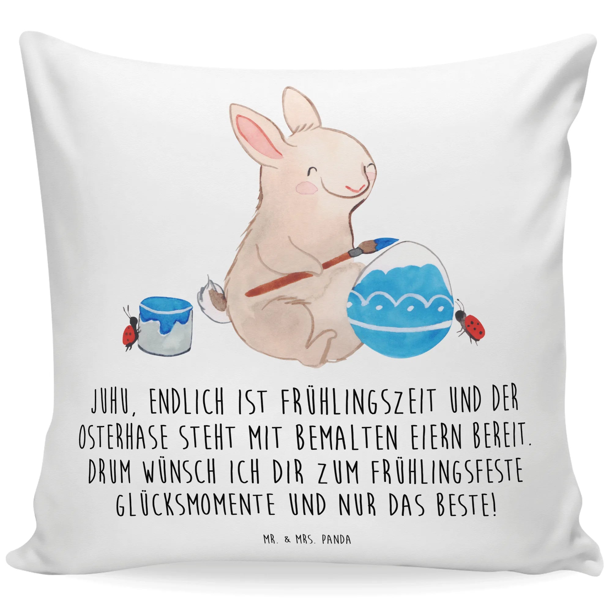 Imagine the sweet scene where our hardworking Easter bunny is in full swing, diligently painting beautiful Easter eggs, surrounded by lively ladybugs that cheer him on and lend a tiny hand in balancing the eggs. With spring bursting into life all around, this motif radiates a joyful spirit that embodies the essence of Easter. The saying, 'Juhu, endlich ist Frühlingszeit und der Osterhase steht mit bemalten Eiern bereit. Drum wünsch ich dir zum Frühlingsfeste Glücksmomente und nur das Beste!' captures the very heart of spring celebrations. This artwork invites you to set out on picnics with friends and family, filled with laughter, painting eggs, and relishing the renewal that comes with every season. Let these vibrant colors and cheerful characters remind you that life is always blossoming, and happiness is just around the corner.