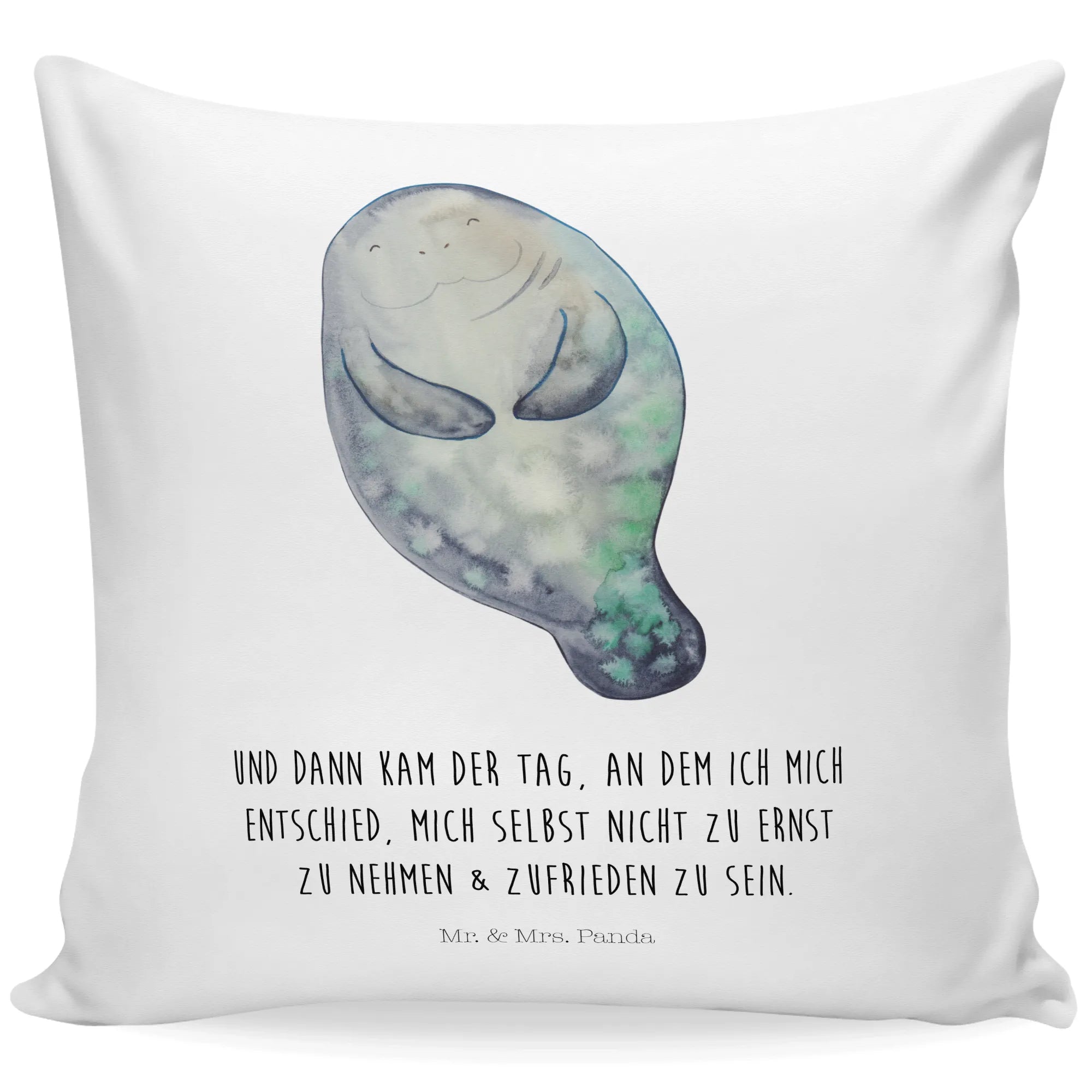 Introducing the Manatee Happy Cushion from the Marine Animals collection by Mr. & Mrs. Panda – the perfect thoughtful gift for anyone who loves ocean life! This beautiful cushion features an adorable illustration of a cheerful manatee, joyfully swimming through its aquatic habitat. Designed in soft blues and gentle greens, this cushion radiates a tranquil vibe, making it a delightful addition to any space. Measuring 40x40 cm (16x16 inches), it's just the right size to snuggle with on the couch while binge-watching your favorite shows or to add a touch of whimsy to your bedroom decor.