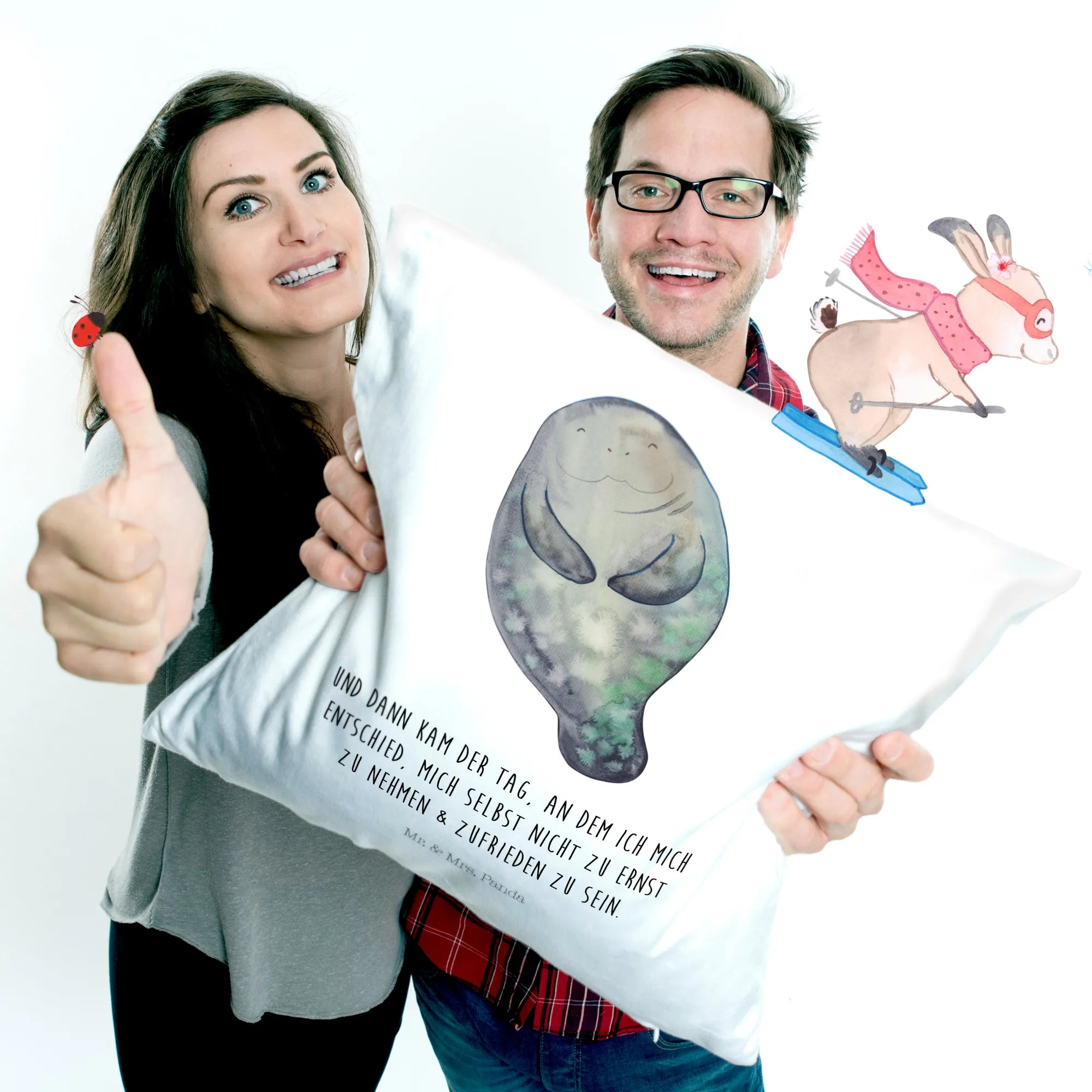 With its charming design of a cheerful manatee sporting a big smile, this cushion will not only brighten up your living space but also bring a sense of tranquility and joy.