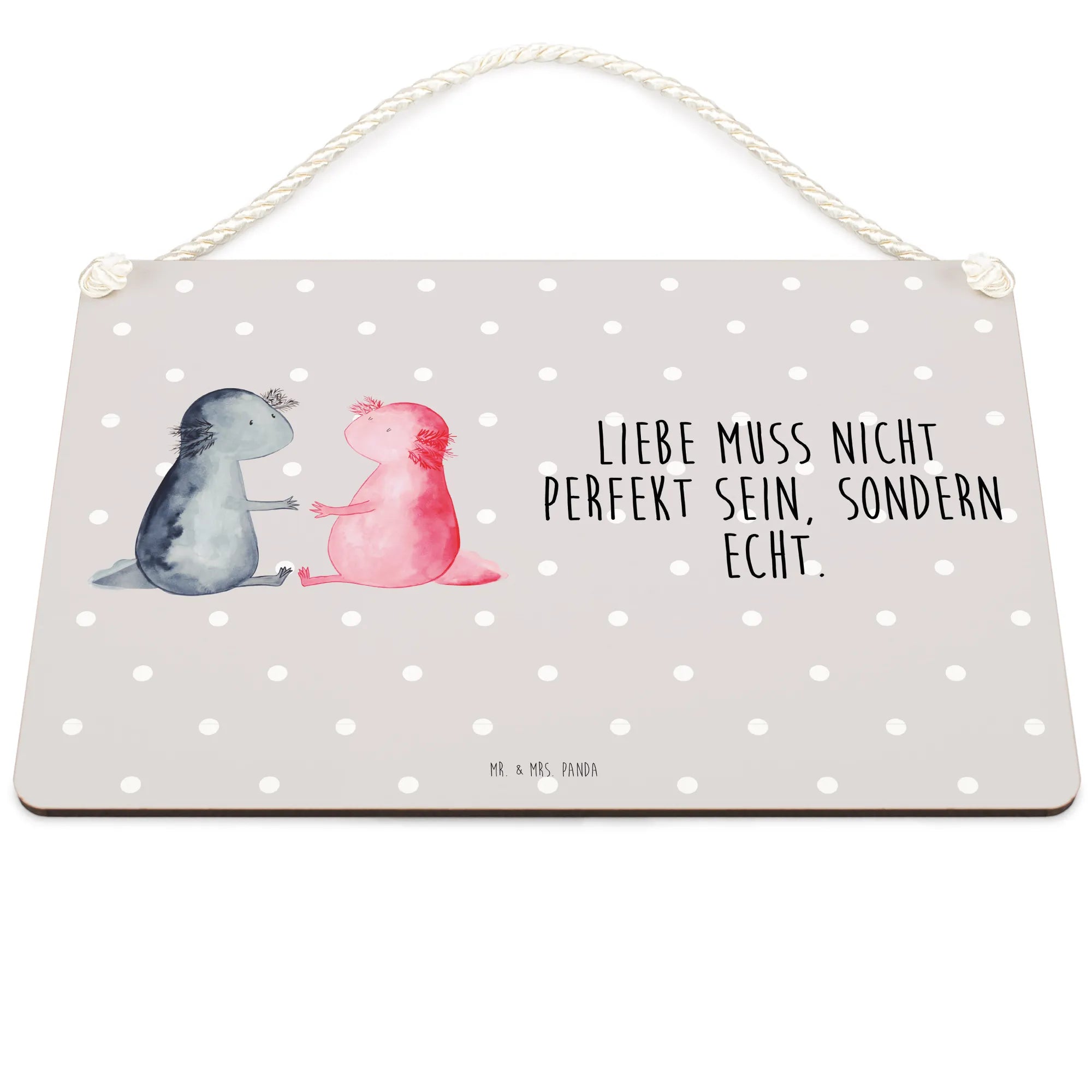Crafted on durable MDF with a lovely coated surface, the sign features two adorable axolotls side by side, holding hands, showcasing their unique bond. Hand-drawn by Mrs. Panda in her signature vibrant style, this delightful aquatic duo is sure to bring a smile to anyone's face. The axolotl, known scientifically as Ambystoma mexicanum, is a fascinating amphibian that not only captivates with its looks but also symbolizes resilience and friendship. Perfectly sized at DIN A5, it makes a charming addition to any wall or door in your home.