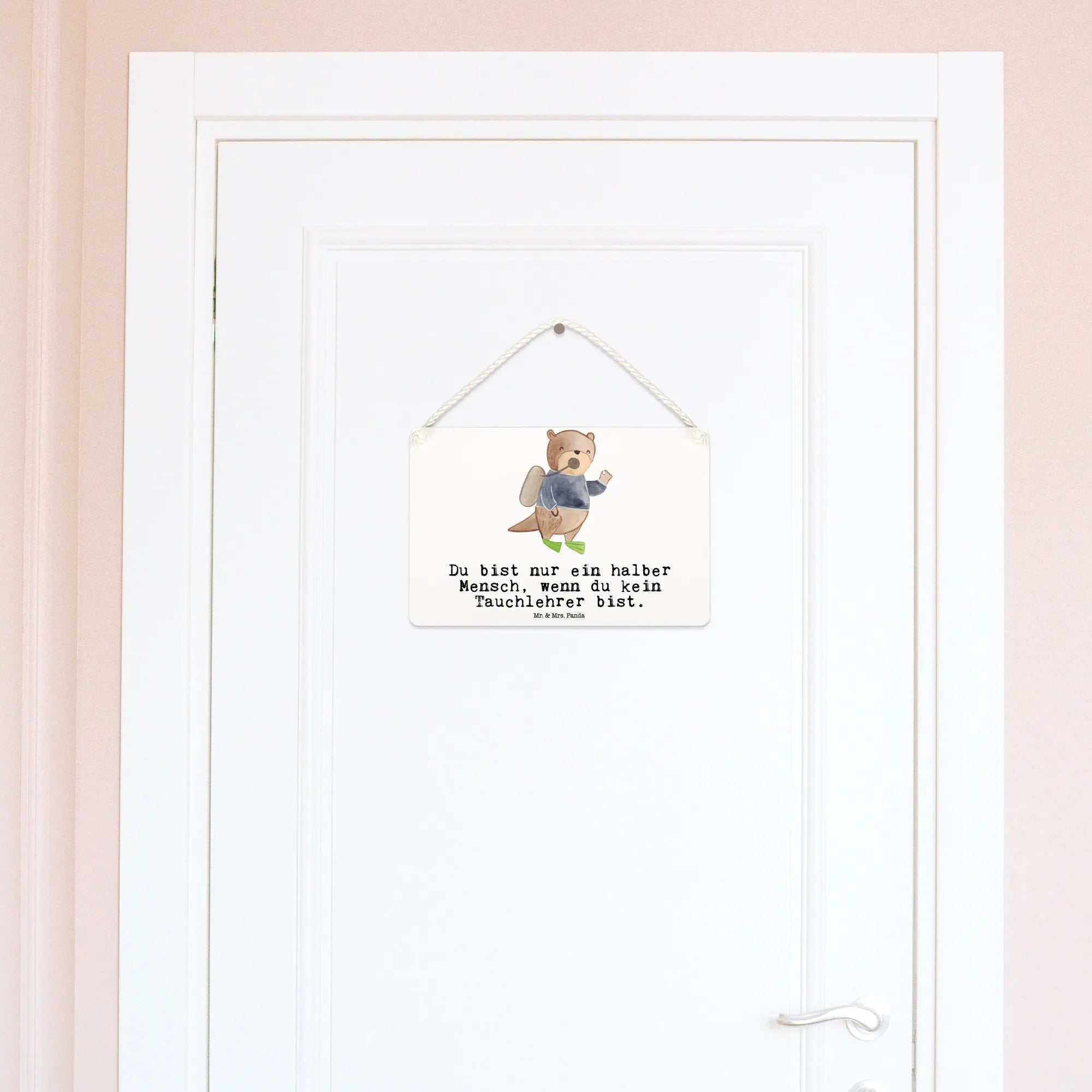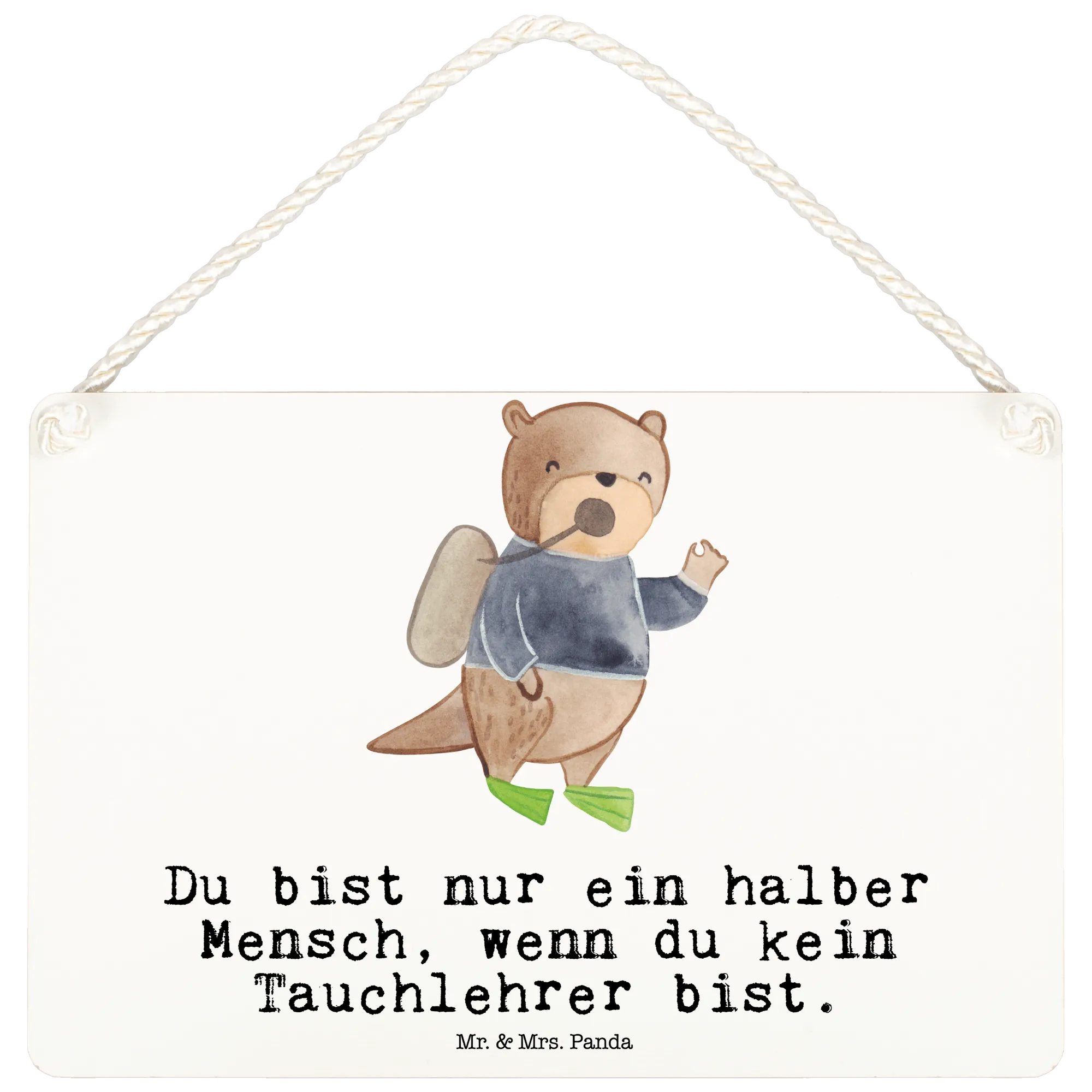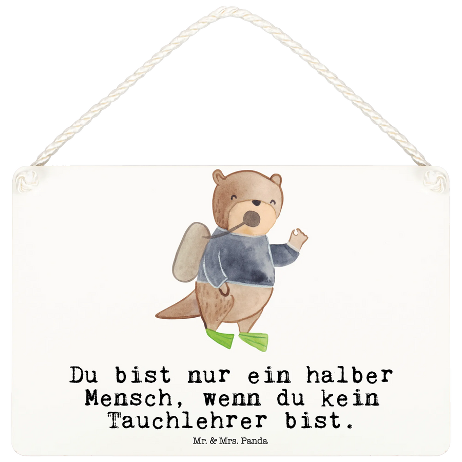 Das Deko Schild "Tauchlehrer mit Herz" von Mr. & Mrs. Panda ist ein liebevolles Geschenk für alle Tauchlehrer und Wassersportliebhaber. Mit einem süßen Motiv eines Otters, der in einem Neoprenanzug die Unterwasserwelt erkundet, bringt dieses Schild Freude in jedes Zuhause oder Büro.