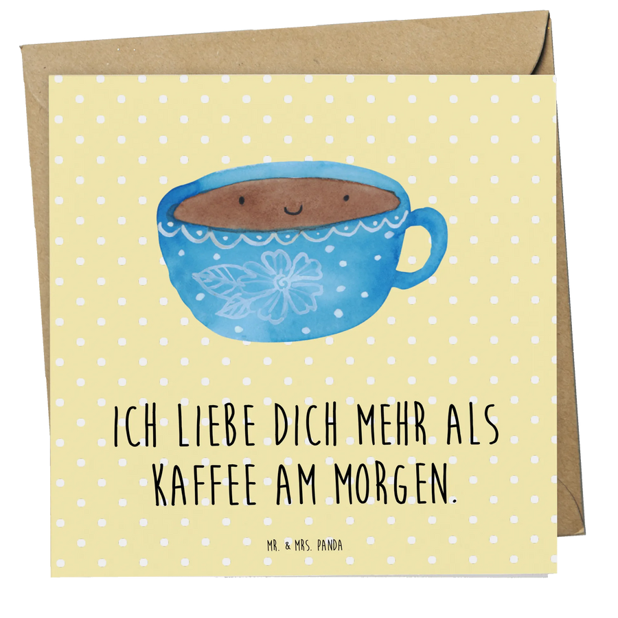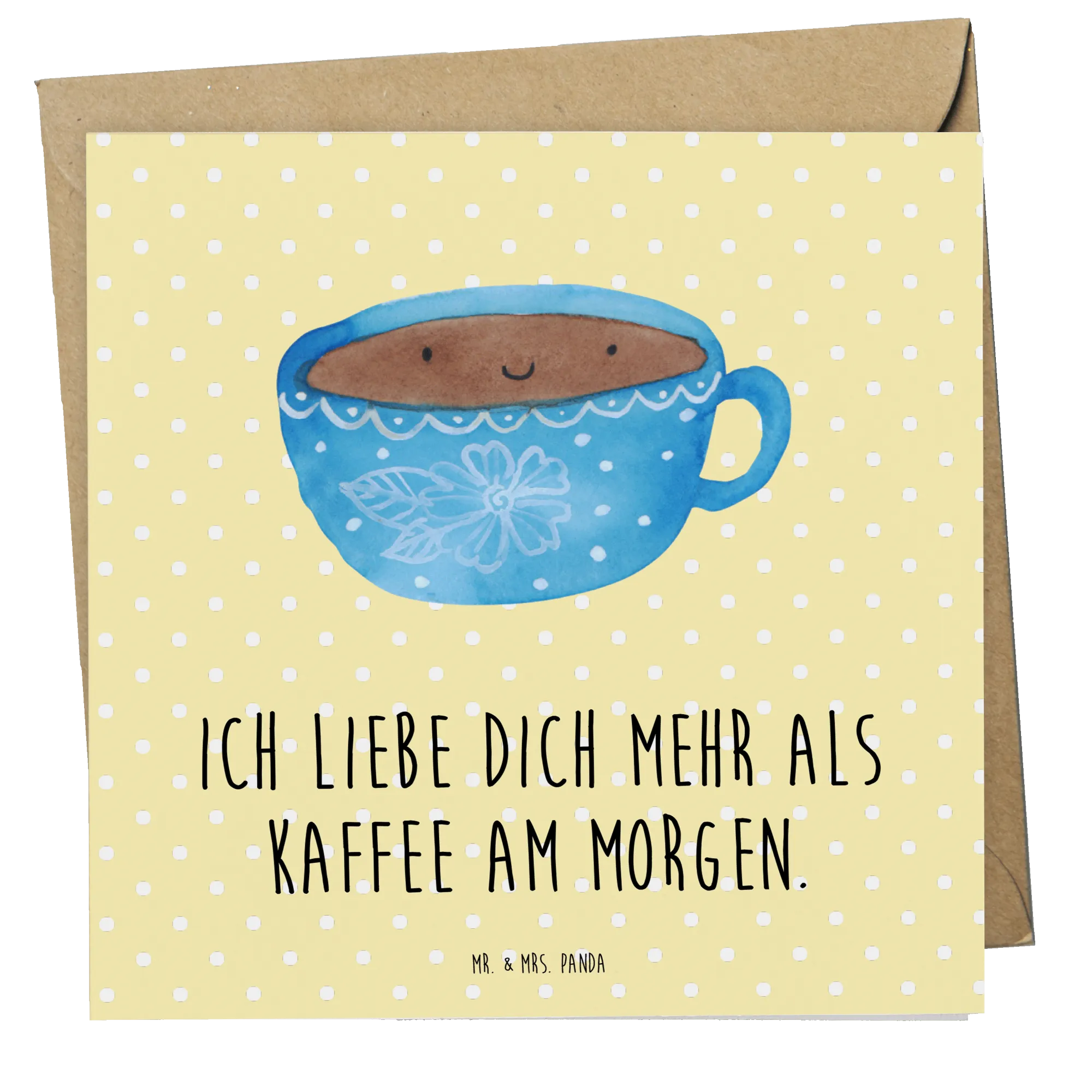 The front of the card showcases a cute and cheerful coffee mug, lovingly hand-drawn by Mrs. Panda, radiating happiness and warmth. The slogan, 'I love you more than the first cup of coffee in the morning,' adds a delightful touch of humor and sentiment that coffee lovers will absolutely adore!
