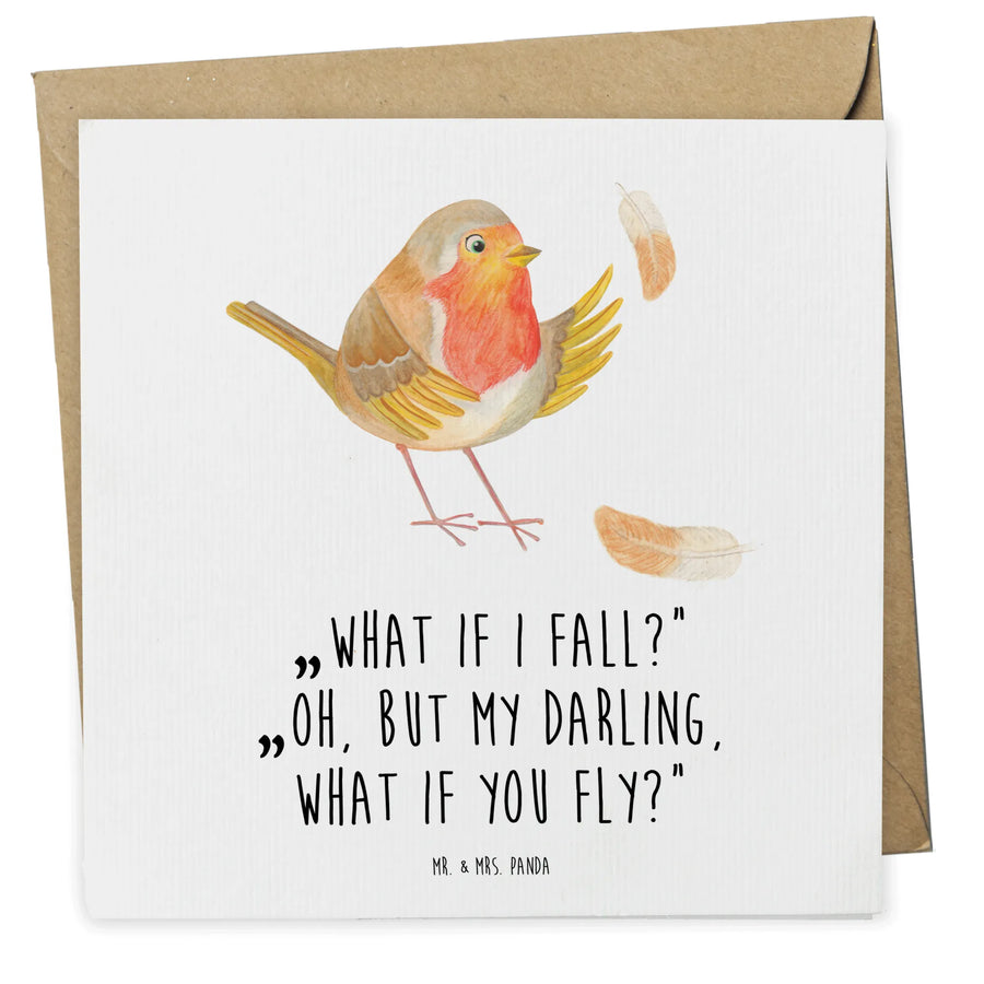 This card exudes warmth and encouragement with its beautifully hand-drawn design, making it an ideal choice for any occasion when you want to share a little motivation. Every time your loved one receives this card, they will see the lovely robin amidst colorful feathers, reminding them that life is about taking leaps of faith and overcoming fears. The inspiring sentiment, "What if I fall? Oh, but my darling, what if you fly?", encourages the recipient to embrace their dreams and aspirations with courage.