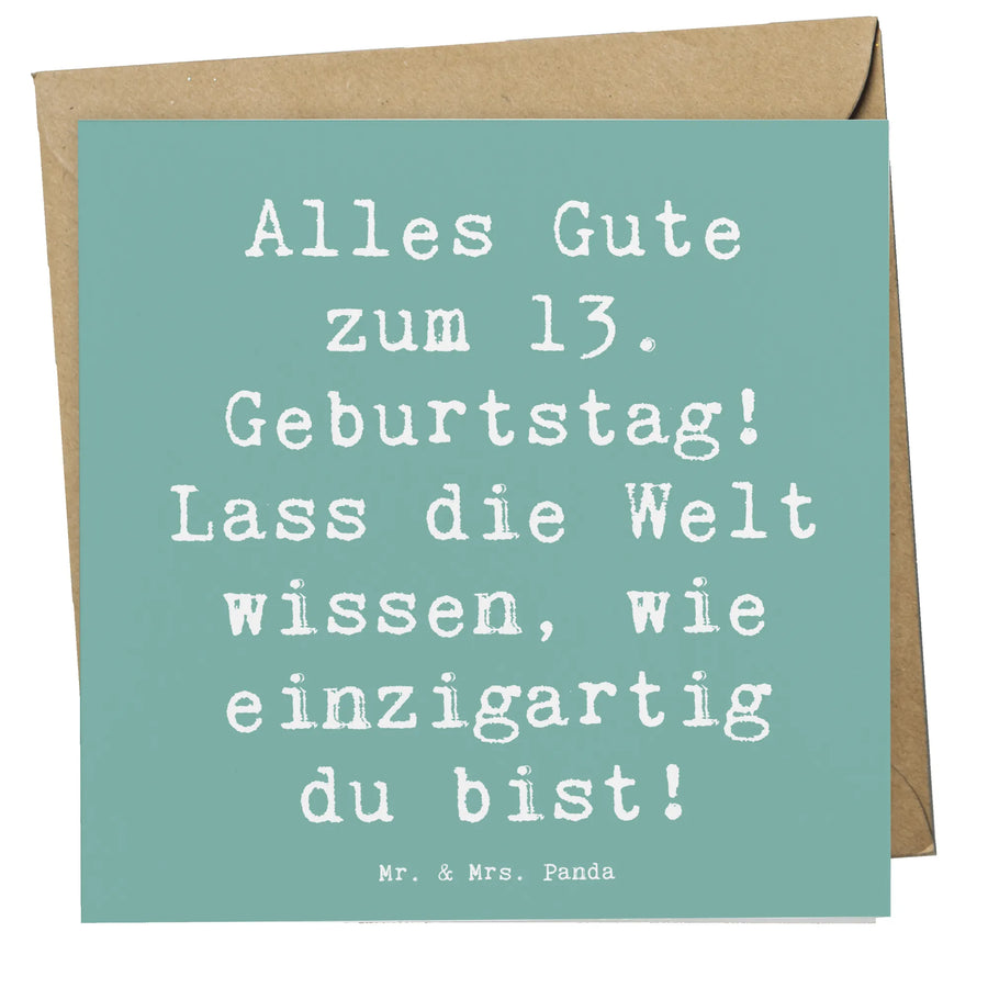 Die Deluxe Karte zum 13. Geburtstag von Mr. & Mrs. Panda ist das ideale Geschenk für diesen besonderen Tag! Mit ihrem liebevoll gestalteten Motiv und dem inspirierenden Spruch "Alles Gute zum 13. Geburtstag! Lass die Welt wissen, wie einzigartig du bist!" bringt sie pure Freude und zaubert jedem Geburtstagskind ein Lächeln ins Gesicht. Ob als persönliche Einladungskarte, Glückwunschkarte oder einfach nur als nette Überraschung – diese hochwertige Klappkarte ist wirklich vielseitig.