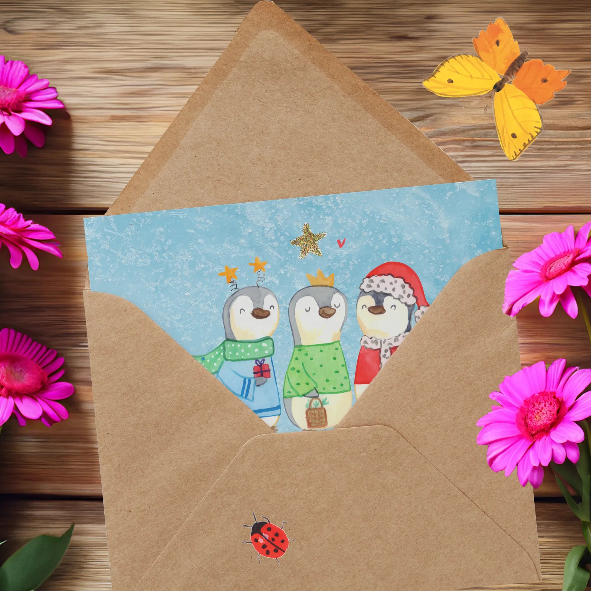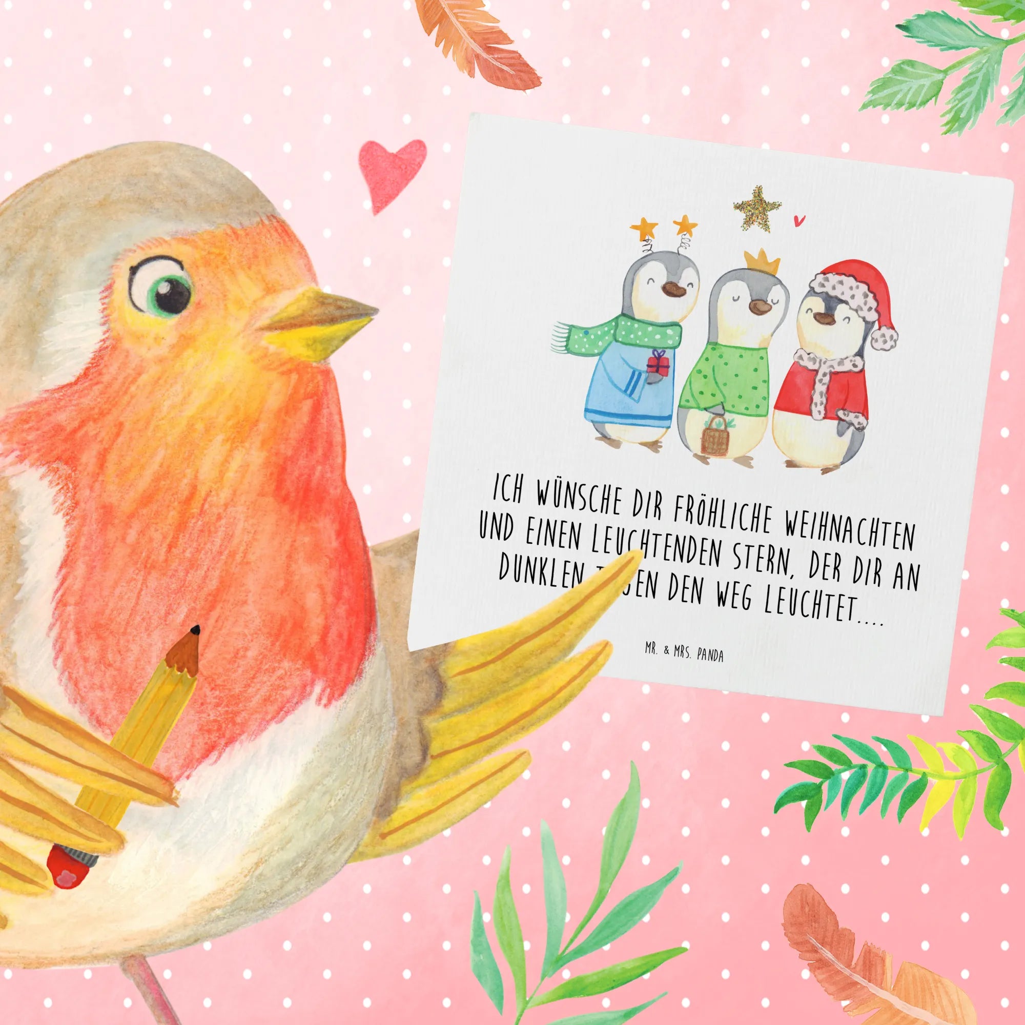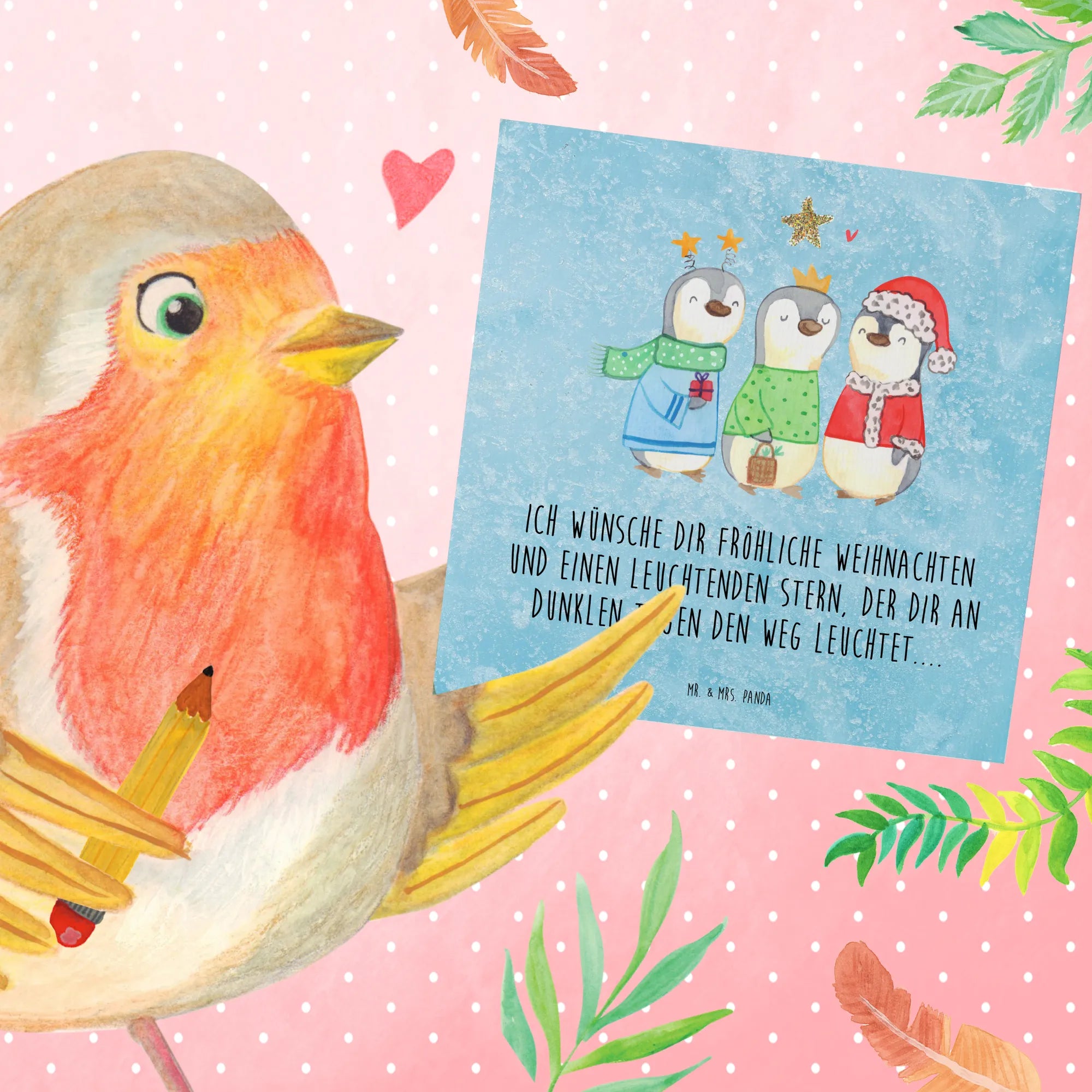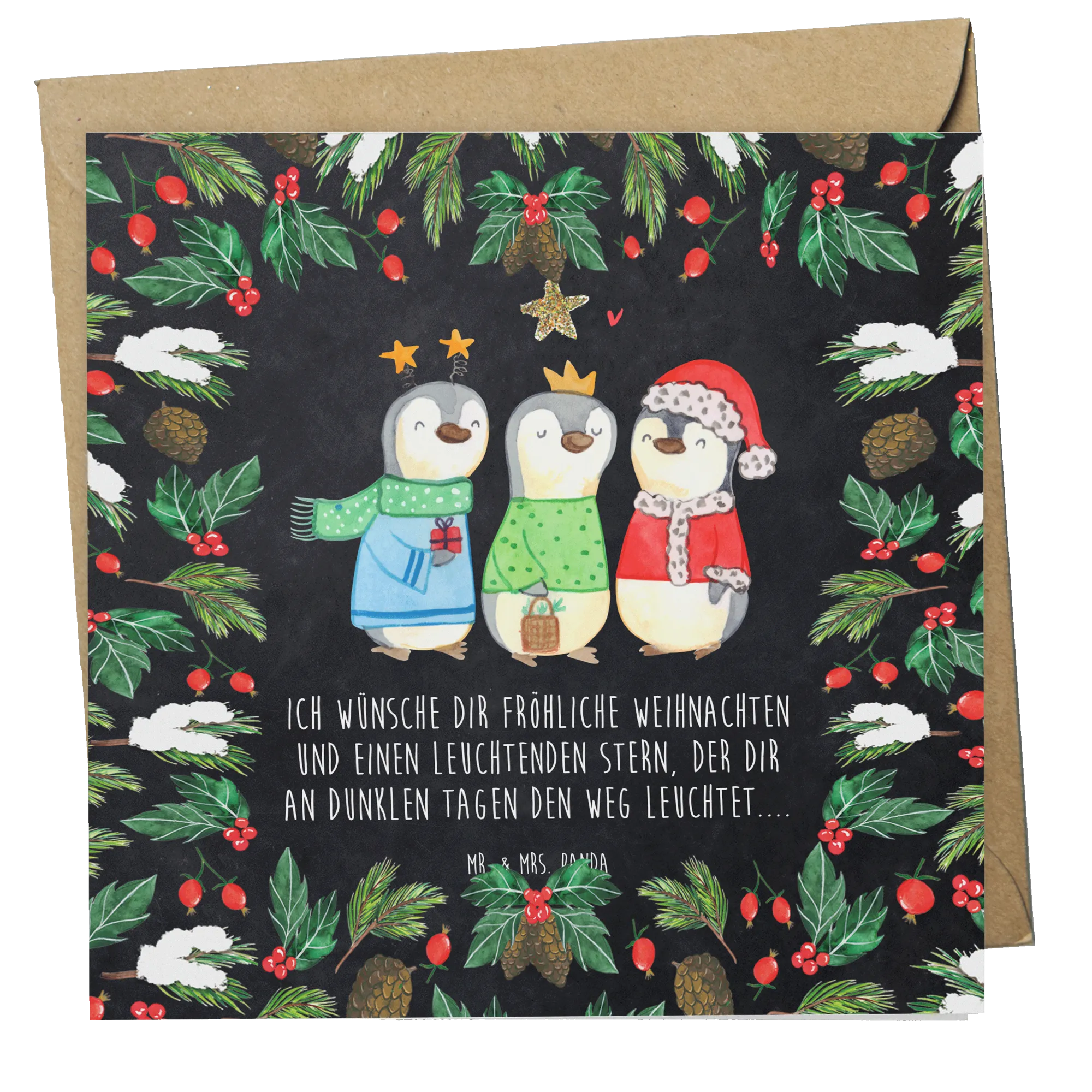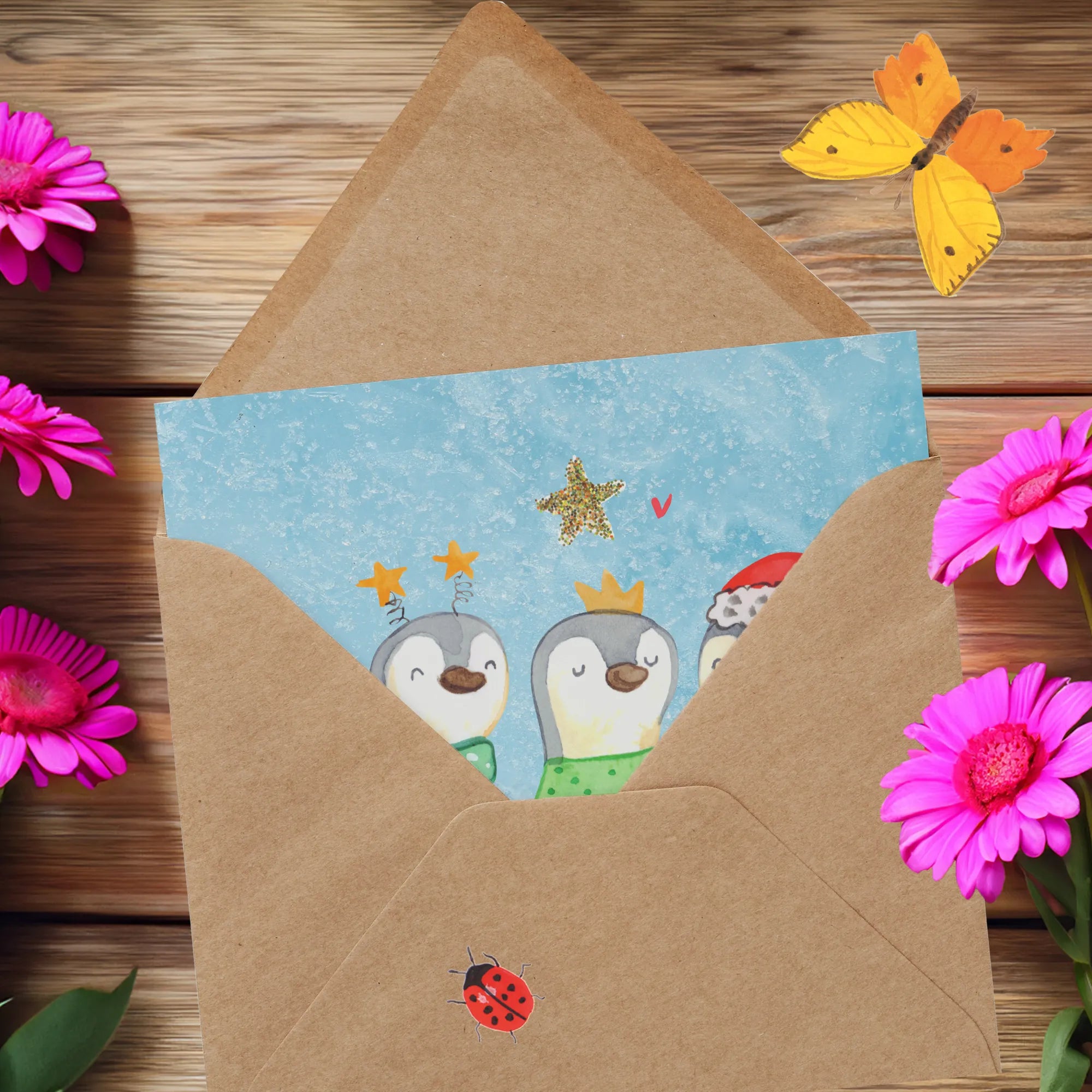 This charming card showcases three adorable penguins dressed as the Three Wise Men, bringing a delightful and whimsical touch to your season's greetings. With a heartfelt slogan wishing ‘Fröhliche Weihnachten’ and a shining star to guide you on dark days, this card is a wonderful message of love and hope.