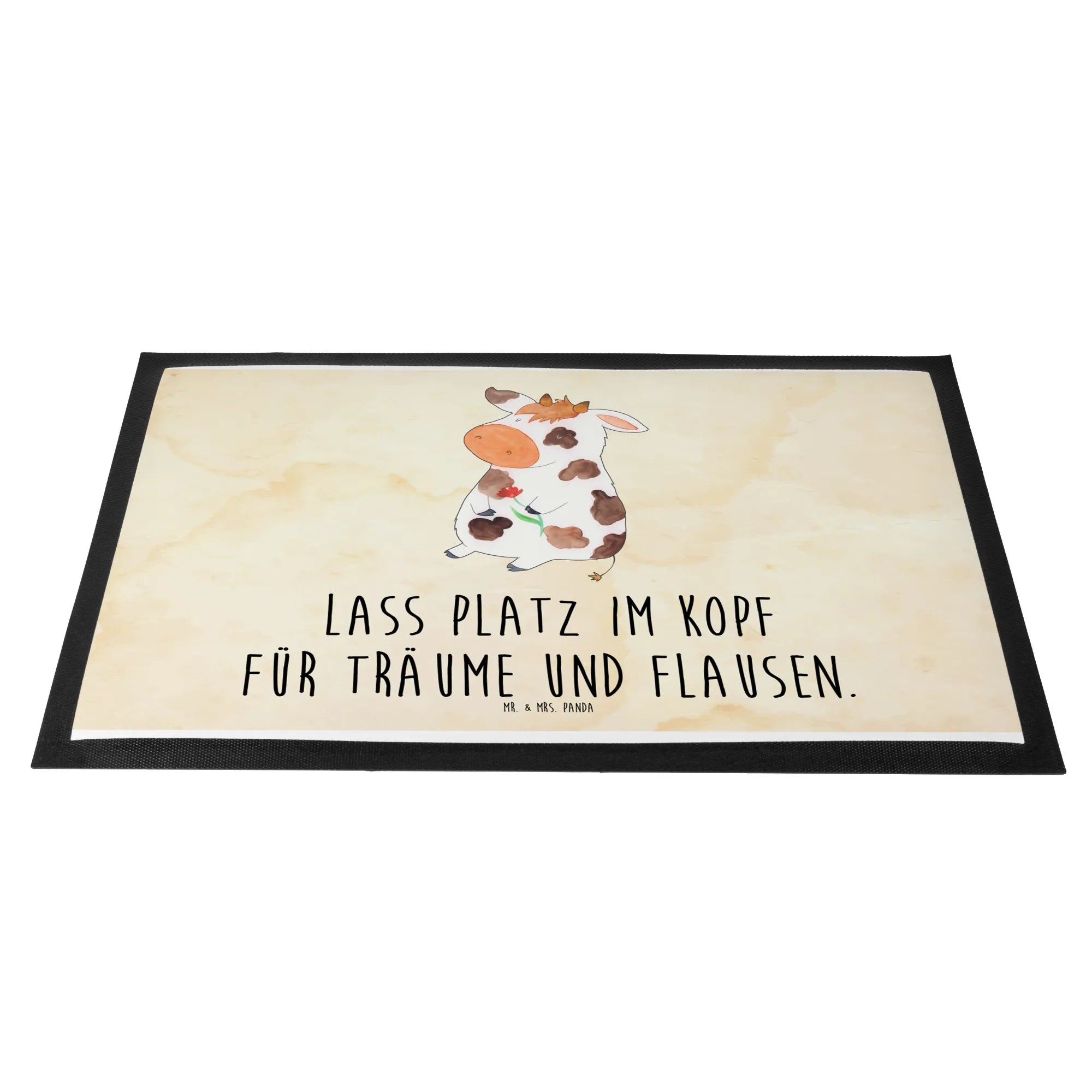 Imagine coming home after a long day and being greeted by a whimsical depiction of a dreamy cow, standing proudly with a flower in its hand. This cute little character isn’t just here to add color to your entrance; it’s the perfect motivation to let creativity and dreams wander in your life! With the playful slogan "Lass Platz im Kopf für Träume und Flausen," our doormat encourages everyone to create space for magic in their lives.