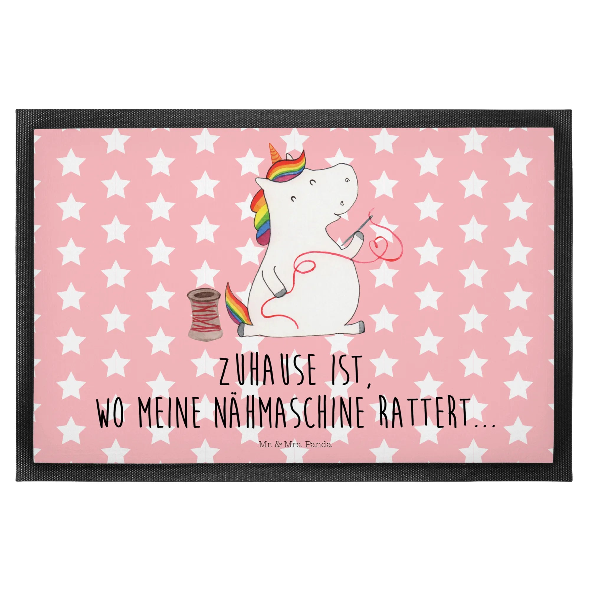 The lovely unicorn at the center of this doormat is hand-drawn with love by Mrs. Panda, effortlessly capturing the whimsy of the unicorn theme. With the slogan "Home is where my sewing machine rattles," it brings an added layer of warmth and personalization to any home. This doormat embraces the vibrant world of crafting and is a fantastic present for any occasion—from birthdays to housewarmings.