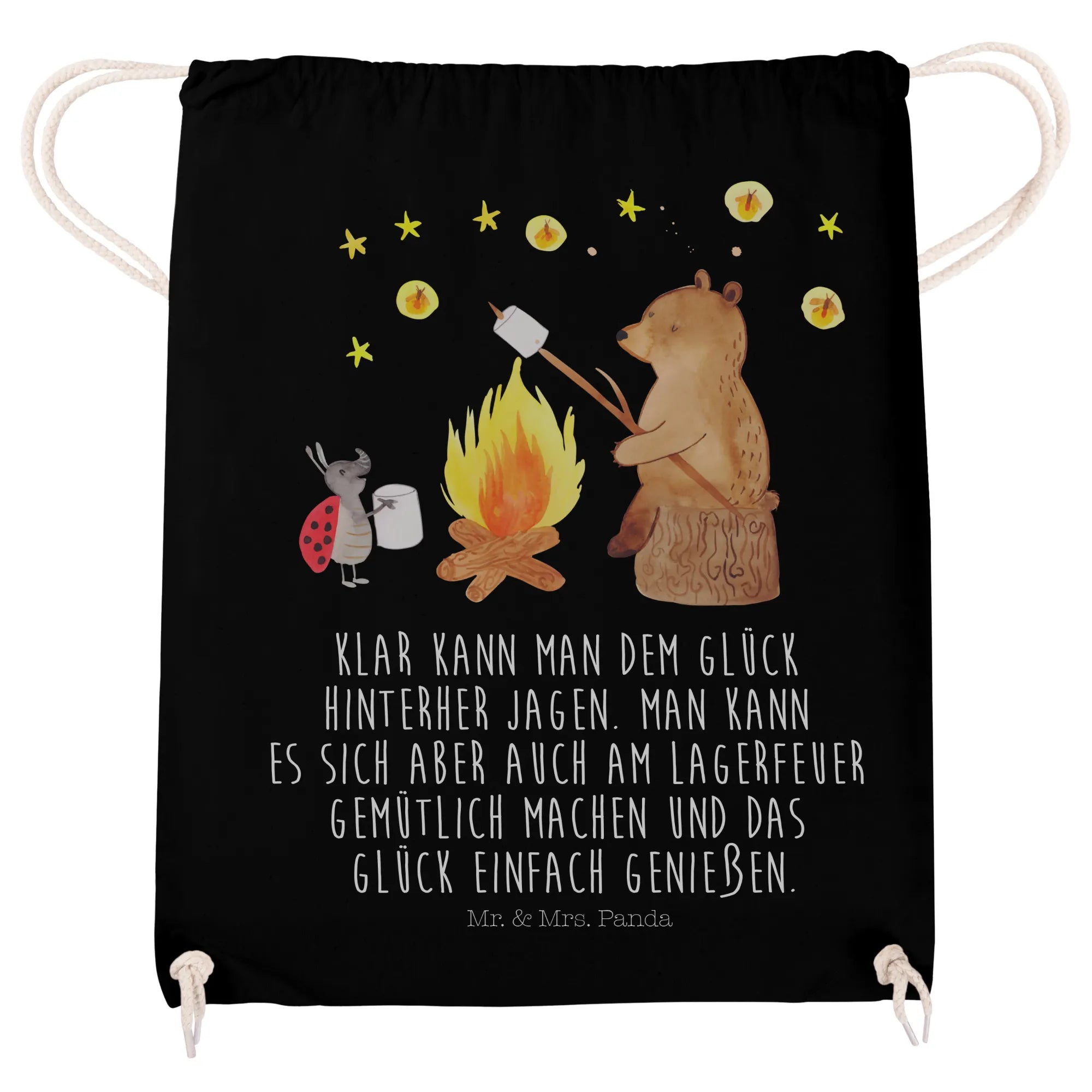 Perfect for friends who enjoy weekend camping trips, devotee gym-goers, or anyone who appreciates the adventures of life, this bag is more than just a practical item; it's a symbol of enjoying life's little moments—just like the motto beautifully illustrated on it: "Klar kann man dem Glück hinterher jagen. Man kann es sich aber auch am Lagerfeuer gemütlich machen und das Glück einfach genießen." This means that while it’s tempting to chase happiness, sometimes it’s best to simply sit back and enjoy the good moments—like roasting marshmallows by the fire.