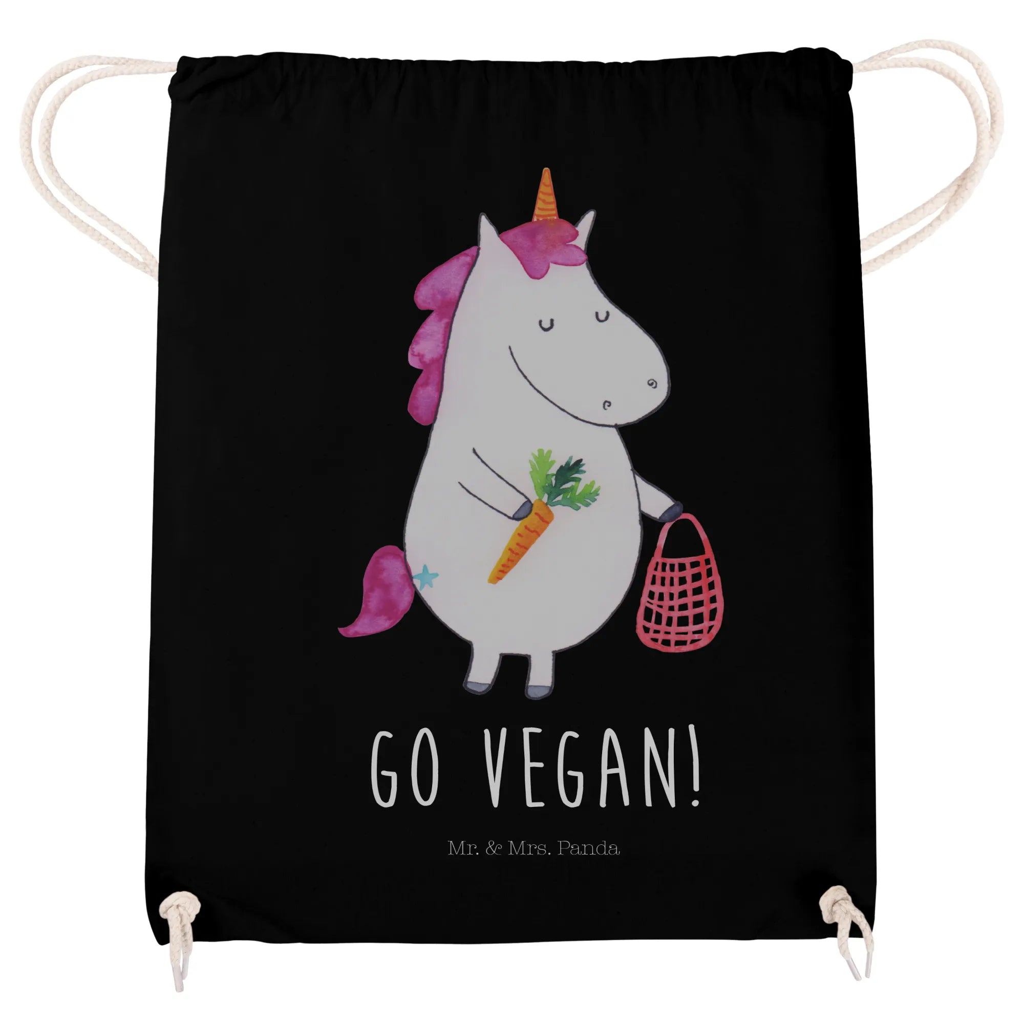 Zauberhaft, praktisch und mit Herz: Unser Einhorn „Vegan“ Sportbeutel von Mr. & Mrs. Panda vereint niedliches Design und Alltagstauglichkeit. Auf dem schwarzen Hintergrund strahlt das liebevoll handgezeichnete Einhorn mit Einkaufstasche voller veganer Lebensmittel und dem klaren Slogan „GO VEGAN!“. Das Motiv stammt aus der Einhorn - Kollektion und wurde von Mrs. Panda liebevoll aquarelliert. 🦄🌱
