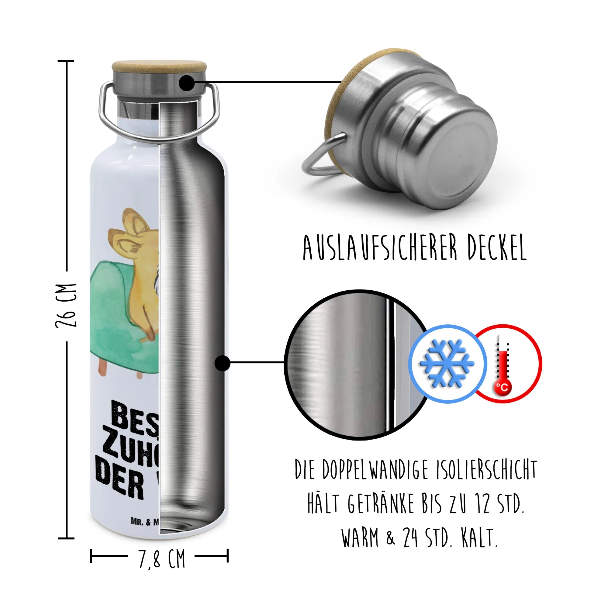 Discover the delightful Drinks Bottle by Mr. & Mrs. Panda! Embrace style and functionality with this beautiful double-walled stainless steel bottle featuring a sleek bamboo lid. Designed to keep your drinks hot or cold for hours, it has a capacity of 750 ml (25 oz) and measures 255 mm (10 in) tall with a 78 mm (3 in) diameter. Perfect for your day at school, work, or outdoor adventures, it’s also great for sparkling drinks! Each bottle showcases unique illustrations and motivational quotes that can uplift your day. Easy to carry and incredibly durable, don’t forget to hand wash to maintain its charm. Hydration has never been this fun!