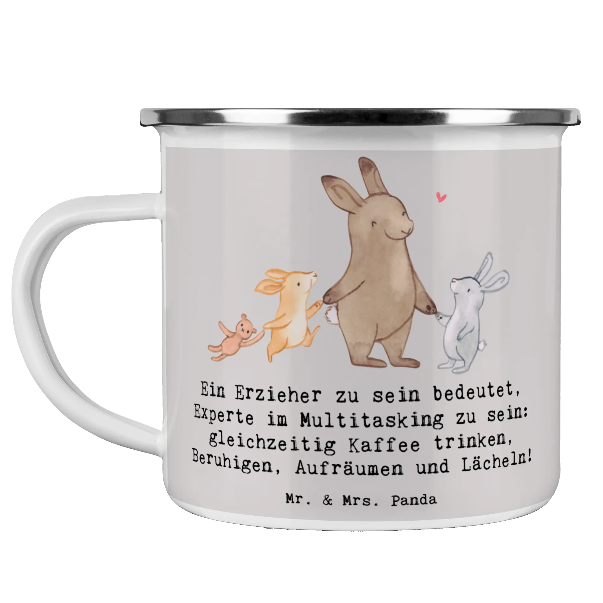 Enamel camping mug Ein Erzieher zu sein bedeutet, Experte im Multitasking zu sein: gleichzeitig Kaffee trinken, Beruhigen, Aufräumen und Lächeln! - White