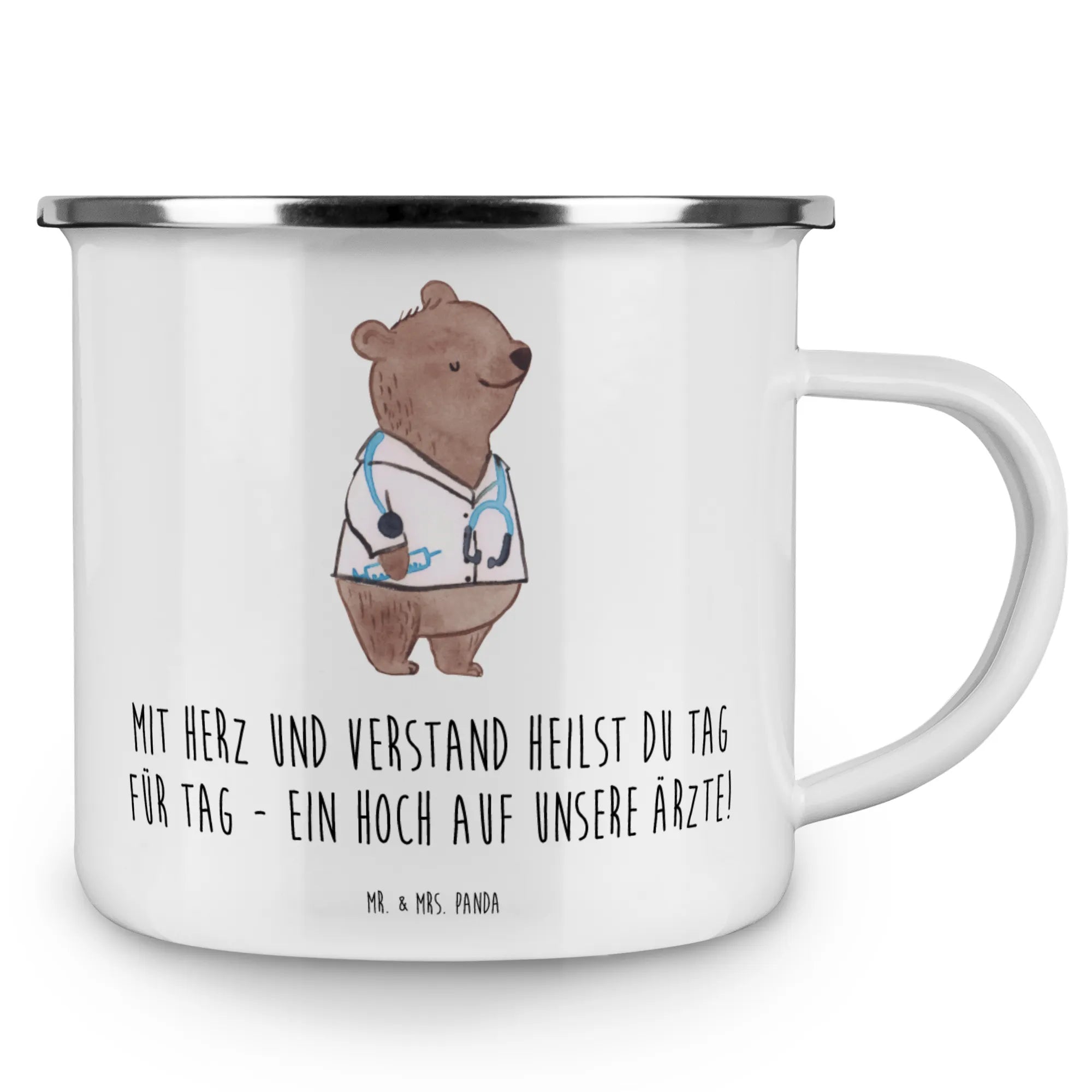 Enamel camping mug Mit Herz und Verstand heilst du Tag für Tag - Ein Hoch auf unsere Ärzte!
