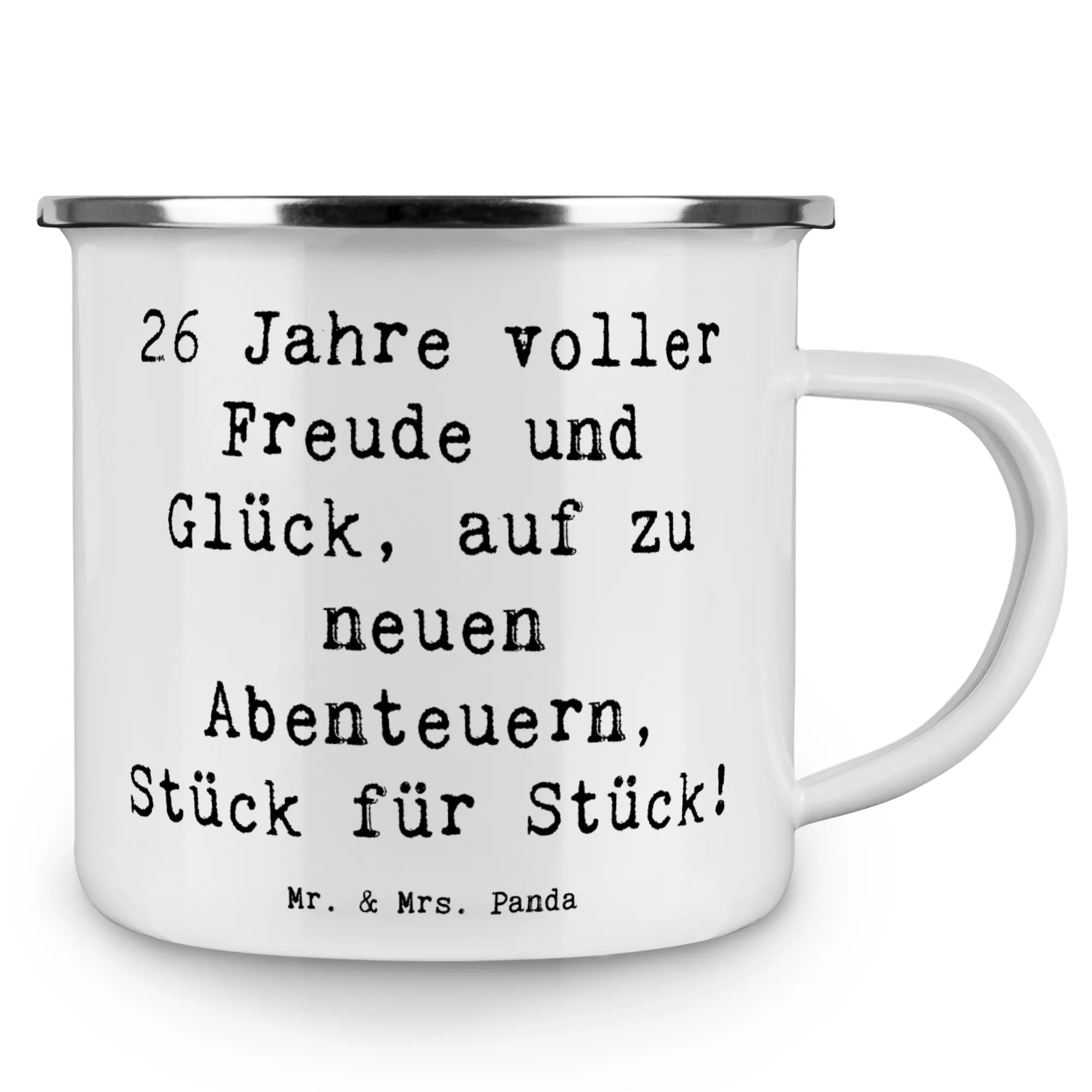 Enamel camping mug Saying 26 Jahre voller Freude und Glück, auf zu neuen Abenteuern, Stück für Stück!