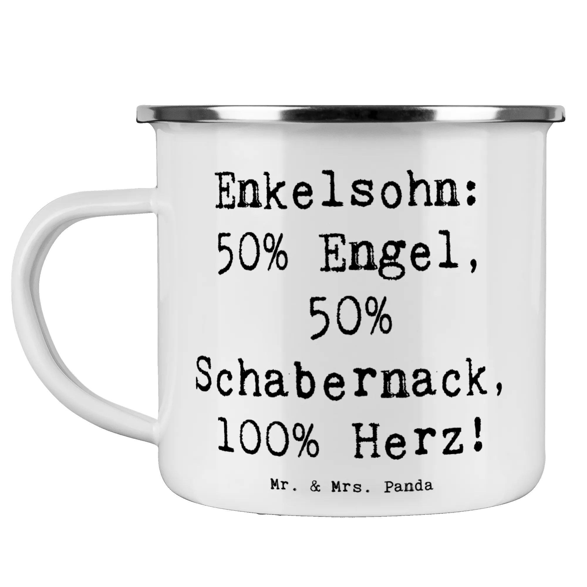 Enamel camping mug Saying Enkelsohn: 50% Engel, 50% Schabernack, 100% Herz!