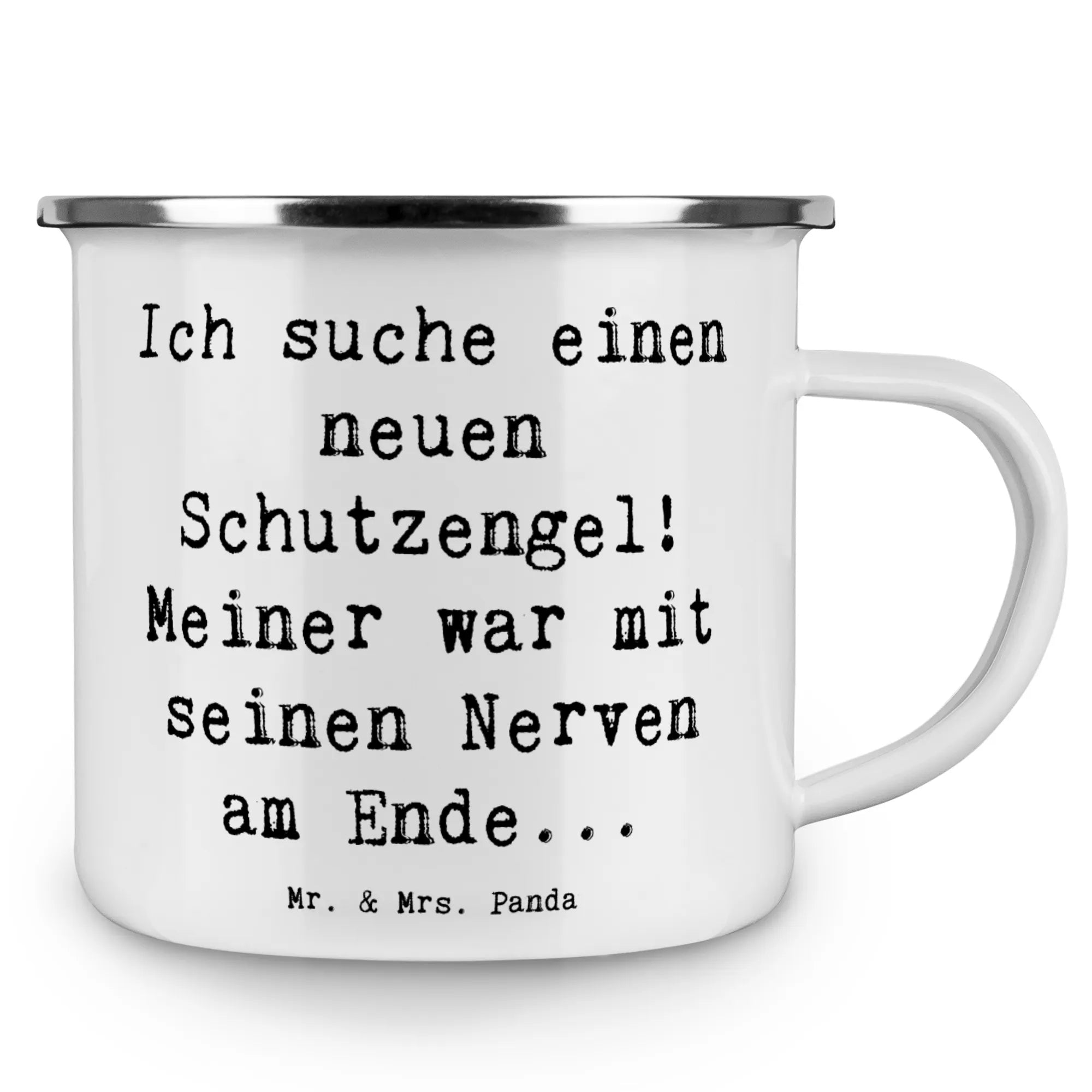Enamel camping mug Saying Ich suche einen neuen Schutzengel! Meiner war mit seinen Nerven am Ende...