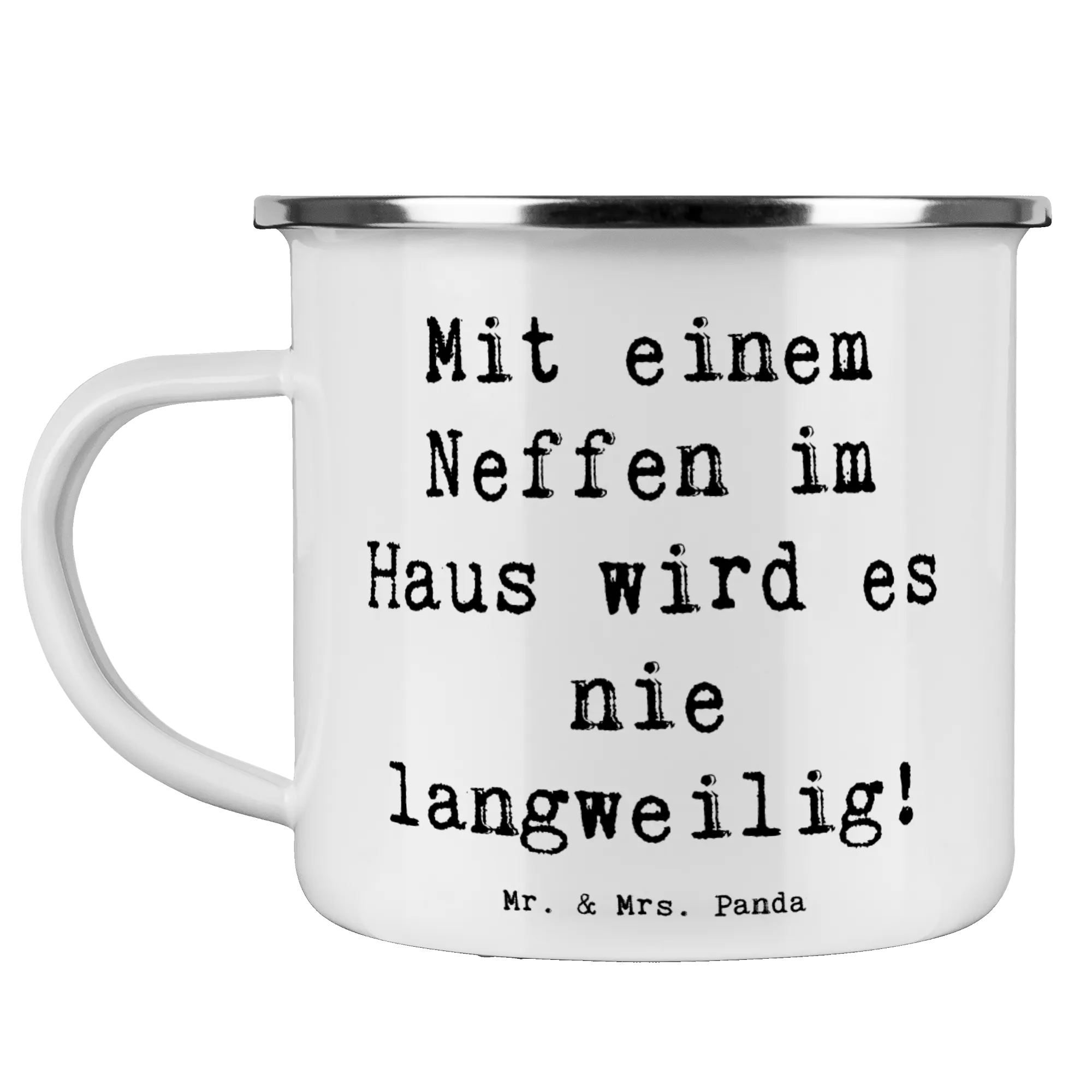 Enamel camping mug Saying Mit einem Neffen im Haus wird es nie langweilig!