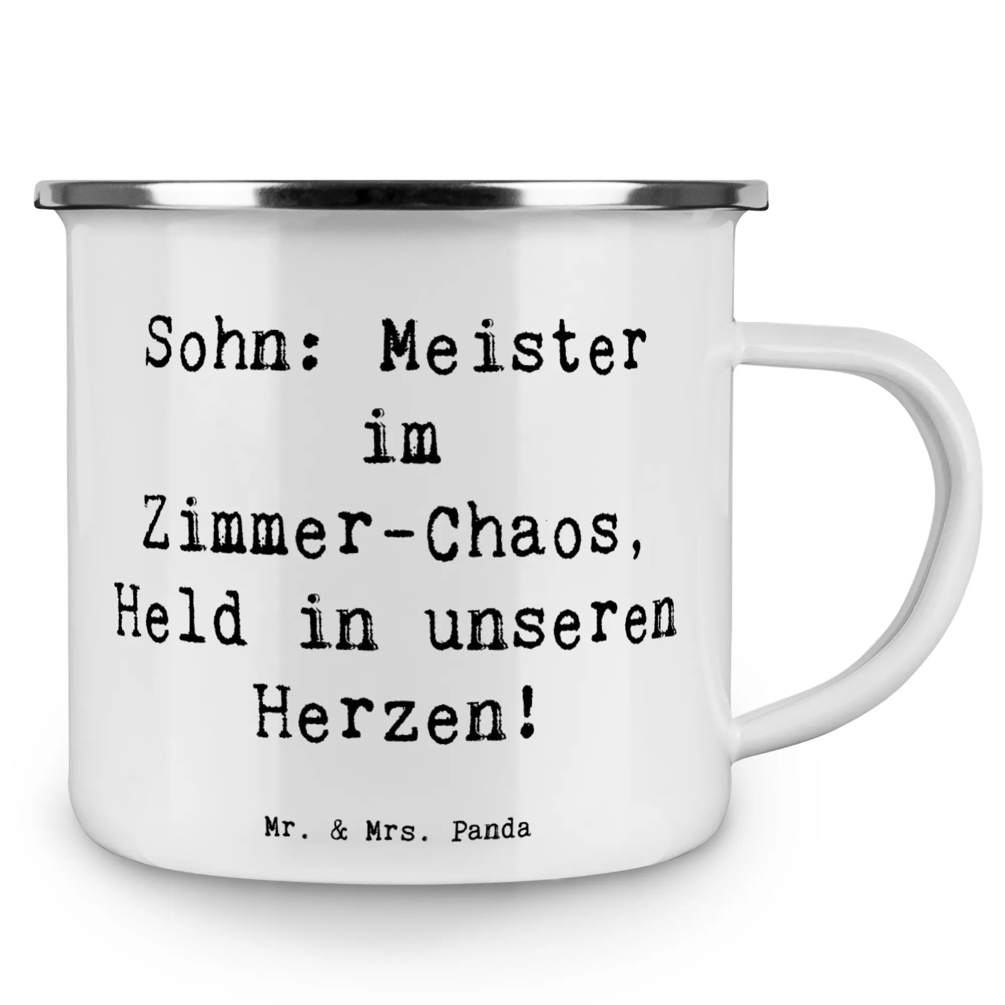 Enamel camping mug Saying Sohn: Meister im Zimmer-Chaos, Held in unseren Herzen!
