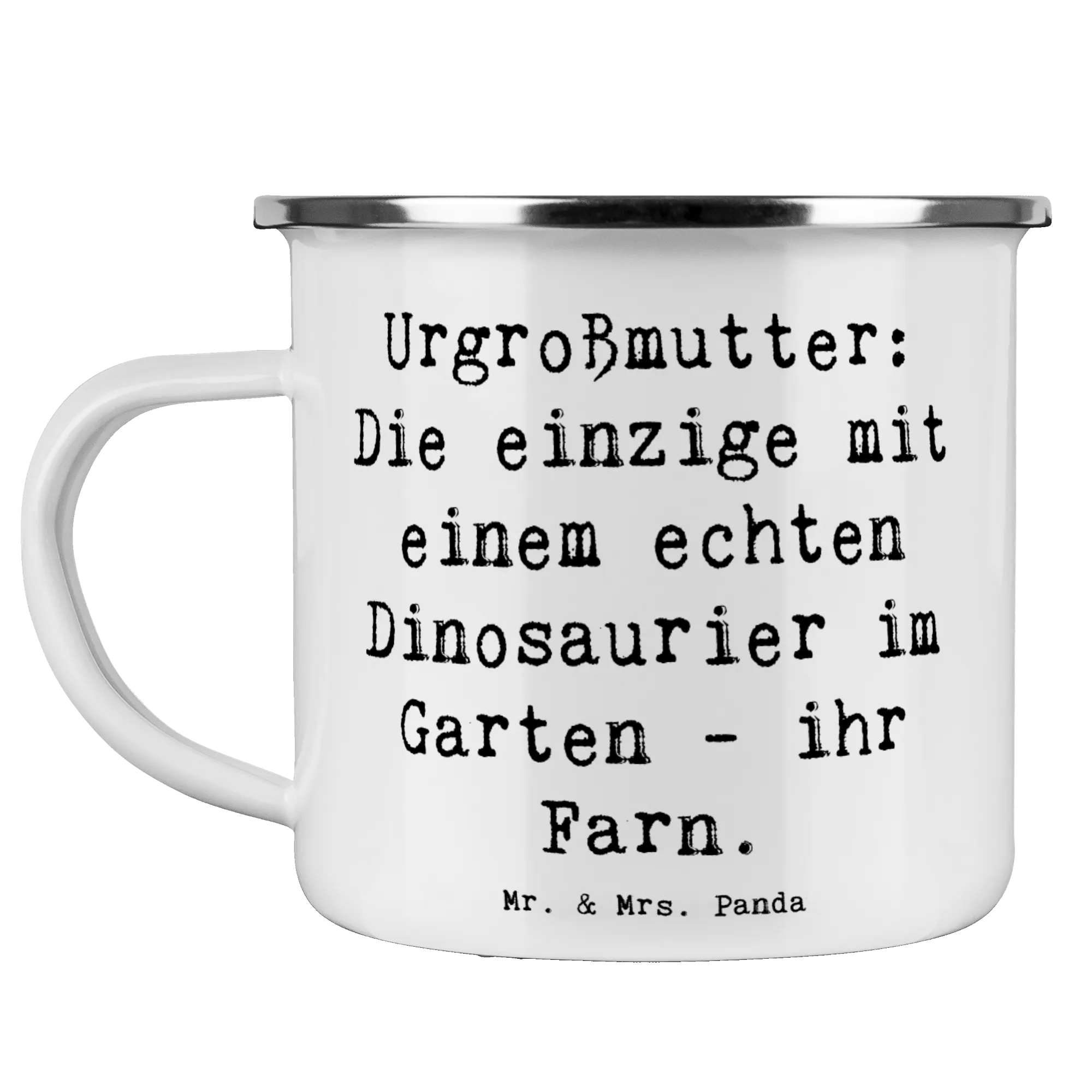Enamel camping mug Saying Urgroßmutter: Die einzige mit einem echten Dinosaurier im Garten – ihr Farn.