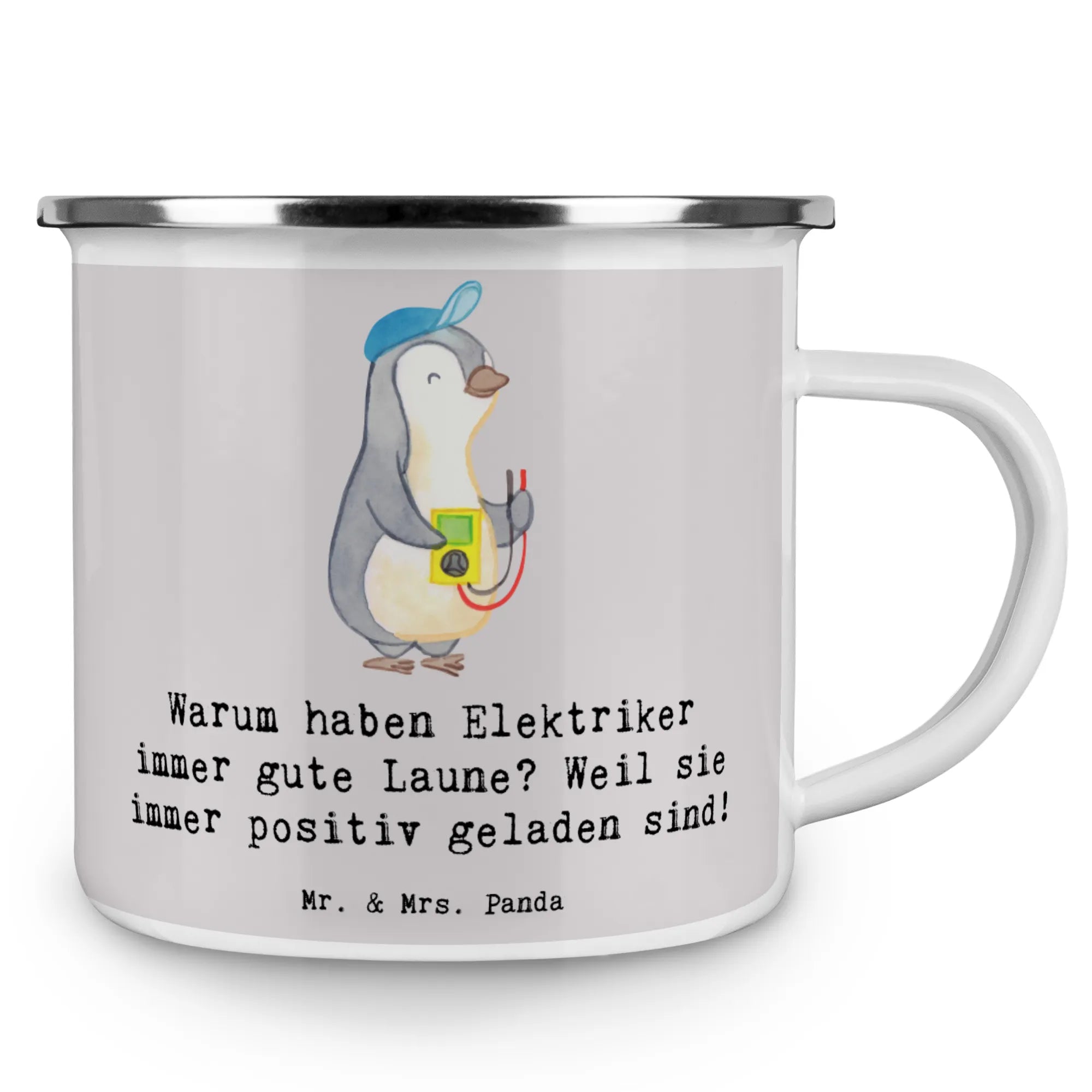 Enamel camping mug Warum haben Elektriker immer gute Laune? Weil sie immer positiv geladen sind! - White