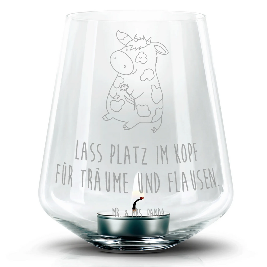 Das wunderschöne Gravur Windlicht aus der Bauernhof Kollektion von Mr. & Mrs. Panda ist das perfekte Geschenk für jeden Tierliebhaber. Mit der verträumten Kuh, die stolz eine Blume in der Hand hält, bringt dieses Teelichtglas fröhliche Landhausstimmung in jedes Zuhause.
