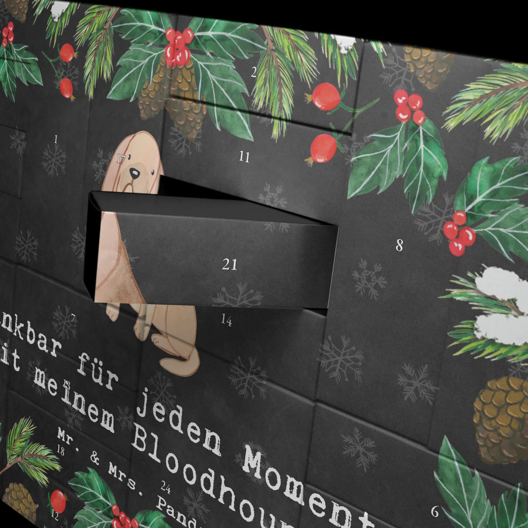 Entdecke unseren liebevoll gestalteten Adventskalender aus der Hunderassen-Kollektion von Mr. & Mrs. Panda. Auf der Vorderseite siehst Du eine zarte Aquarellzeichnung von Mrs. Panda: ein treuer Bloodhound mit warmen, braunen Tönen und dem herzlichen Spruch „Dankbar für jeden Moment mit meinem Bloodhound.“ Dieses Motiv spricht direkt das Herz aller Bluthund-Fans und Hundebesitzer an.