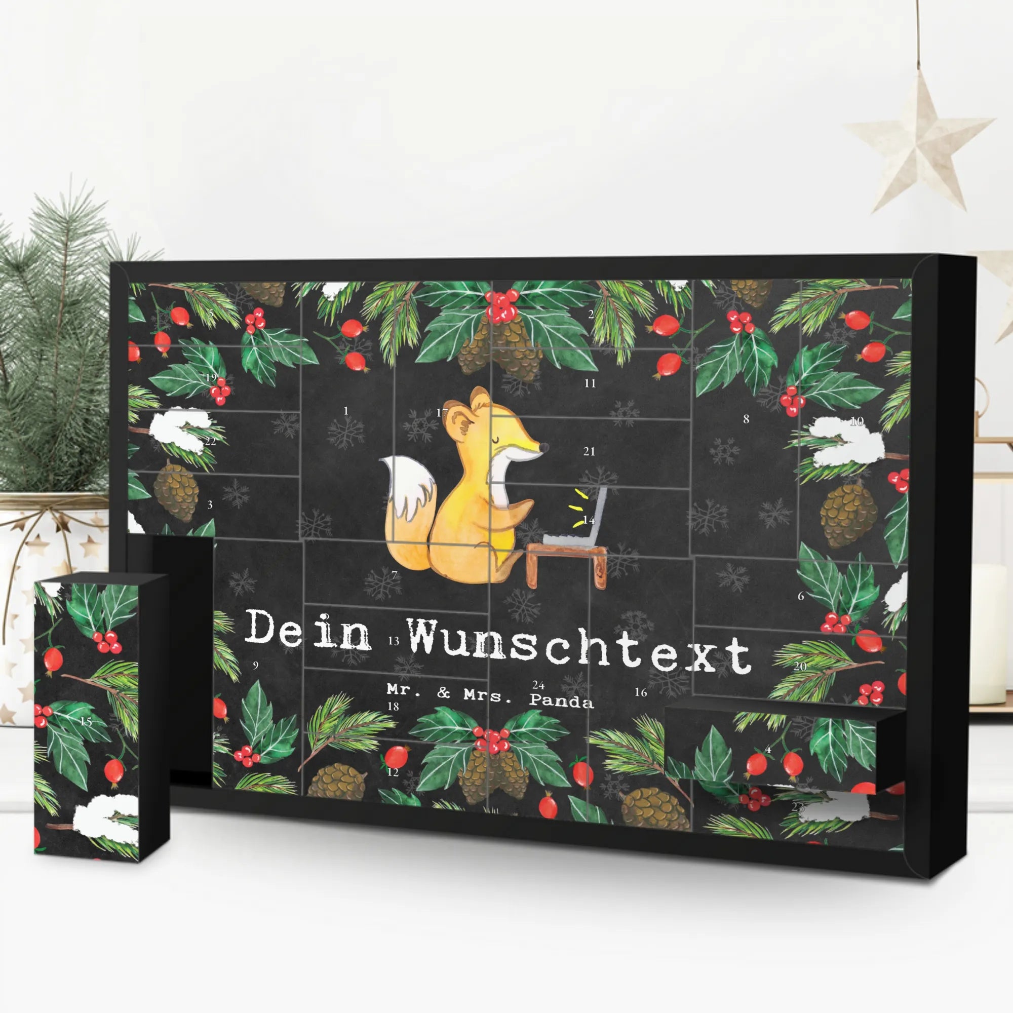 Der personalisierte, befüllbare Adventskalender mit dem liebevollen Fuchs-Motiv "Bester Arbeitskollege der Welt" ist das perfekte Geschenk für deinen geschätzten Kollegen. Egal, ob zur Verabschiedung, zum Ruhestand oder einfach als Dankeschön für die tolle Zusammenarbeit – dieser Adventskalender zaubert jedem Kollegen ein Lächeln ins Gesicht! Mit 24 großzügigen Schachteln ist der Kalender ideal, um kleine Überraschungen, Süßigkeiten oder Erinnerungen zu verstecken. Die einzigartige Zeichnung von Mrs. Panda verleiht dem Kalender eine persönliche Note, die dein Geschenk zu etwas ganz Besonderem macht. Die seidenmatte Oberfläche sorgt dafür, dass der Kalender edel und hochwertig wirkt, perfekt für das Büro oder den eigenen Schreibtisch.