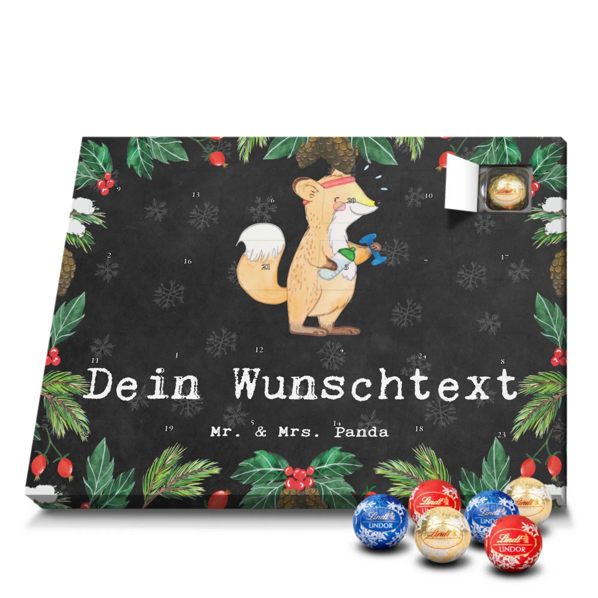 Make the Advent season even more special with the personalized chocolate Advent calendar from Mr. & Mrs. Panda. This unique Advent calendar is printed with your desired name or a custom text and features exclusive designs and sayings from the renowned designer duo. It's not only a visual highlight but also delights taste buds with 24 high-quality chocolate balls in various colors. The brilliant print quality and the silk-matte finish make this calendar a true eye-catcher during the Christmas season.
