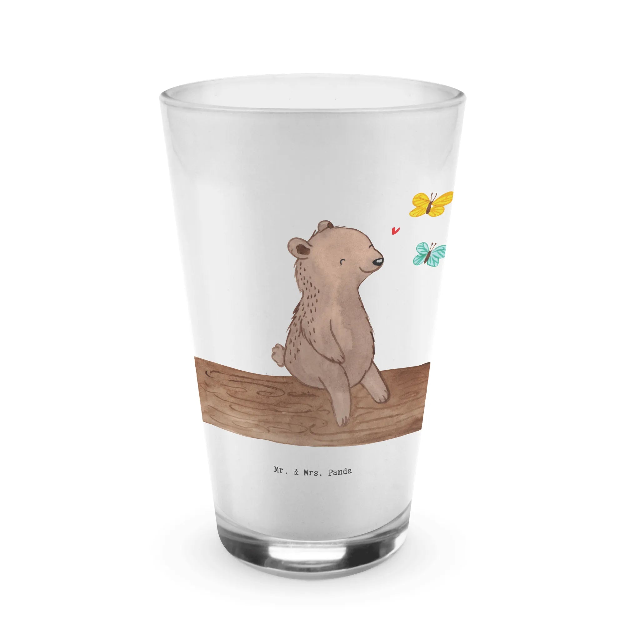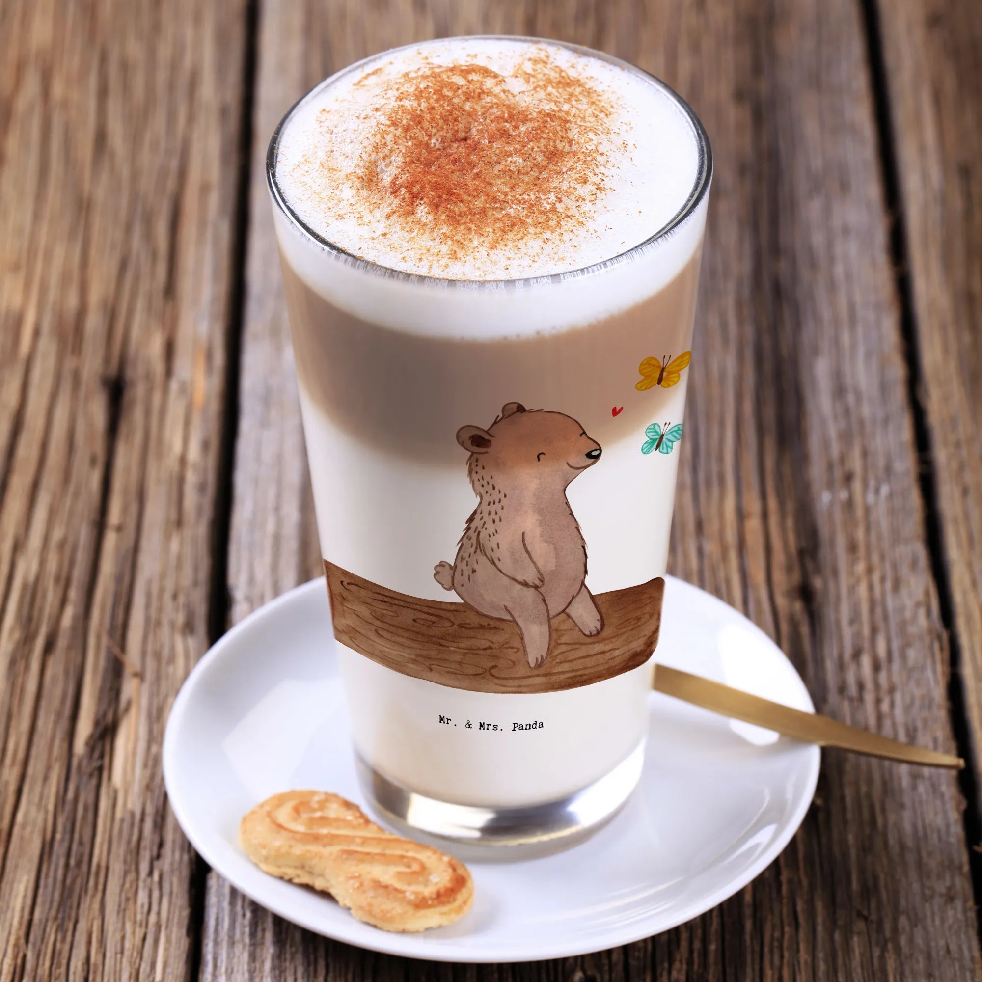 Crafted from premium, thick-walled satin glass, this versatile piece is perfect for savoring your favorite cappuccino, steaming latte macchiato, or any other delightful coffee creation. Picture the joy of sipping a warm brew while surrounded by stunning landscapes, with our adorable bear motif keeping you company. The sweet bear contentedly perched on a tree stump, watching butterflies dance through the air, epitomizes the peace and beauty nature offers.