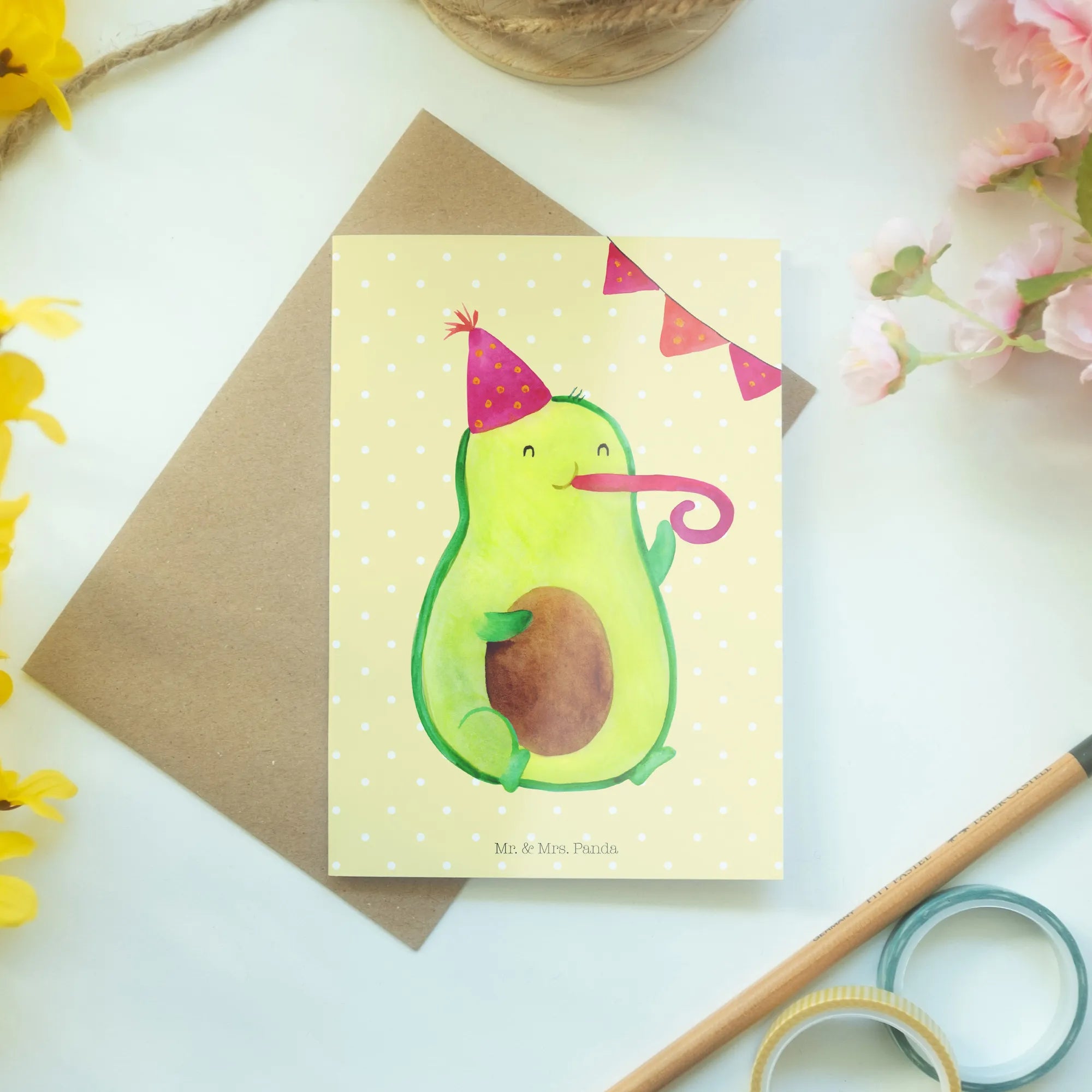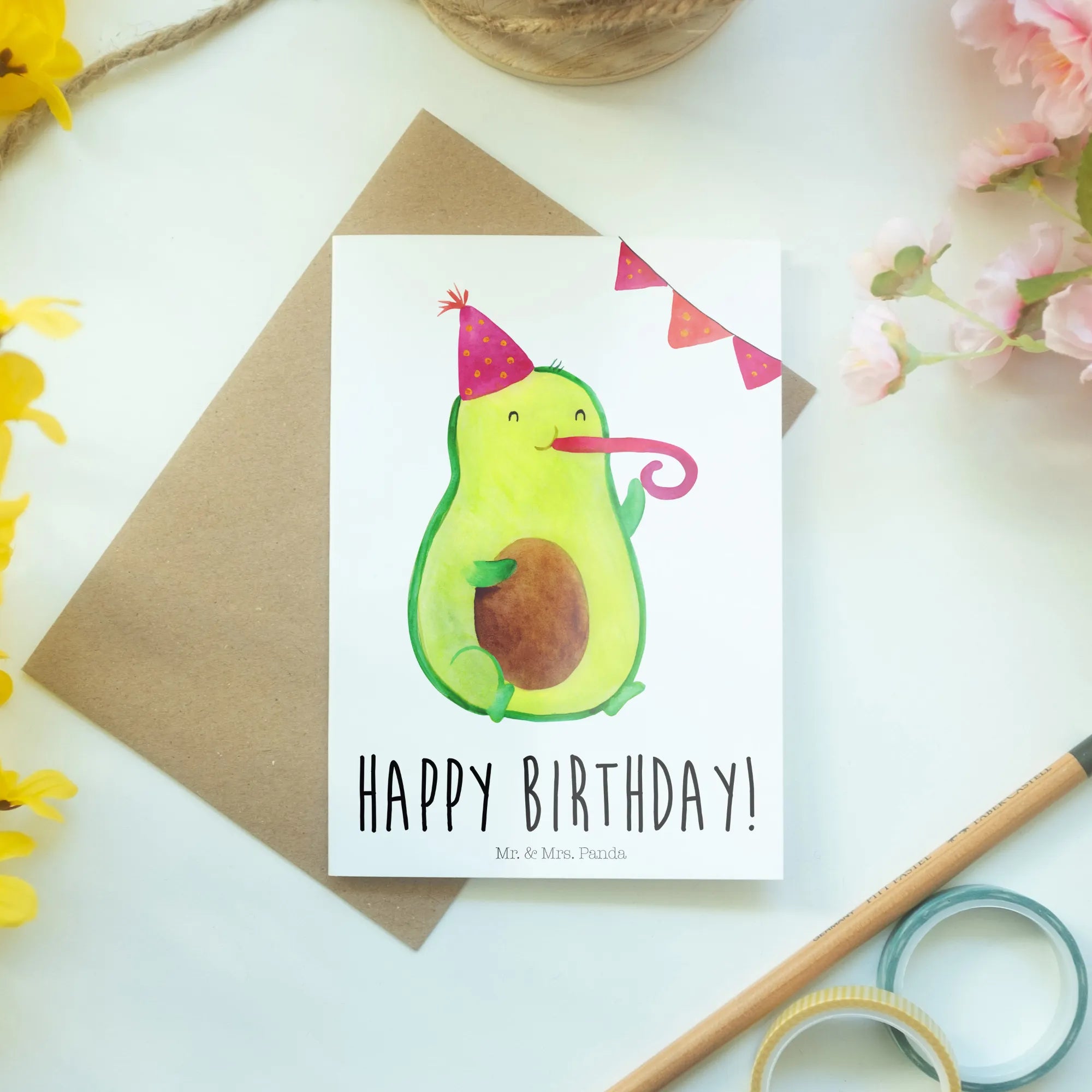 Are you searching for the perfect way to celebrate someone's special day? Then look no further than our delightful "Avocado Birthday" greeting card from the special collection by Mr. & Mrs. Panda! This charming greeting card features an adorable hand-drawn motif of a sweet avocado donning a festive party hat and blowing into a party blower, spreading joy and cheer at every glance.