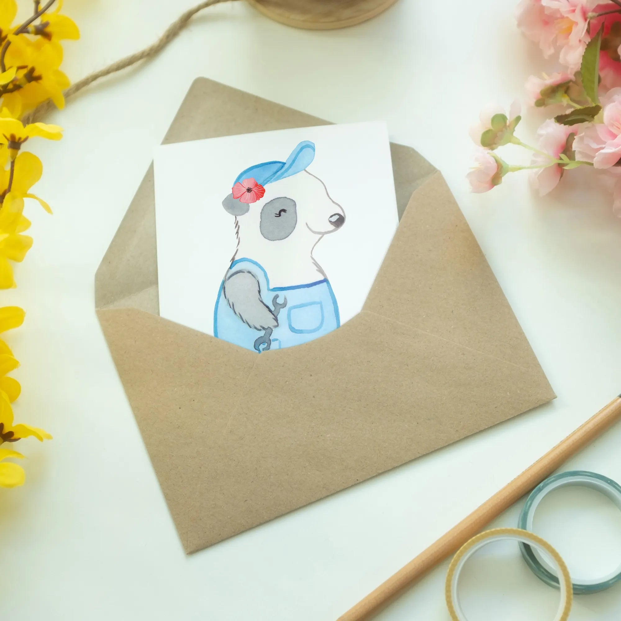 Made from high-quality 300-gram carton, this card boasts a lovely matte interior that's perfect for your personal message for any occasion. The glossy cover, adorned with a charming illustration of a female panda in a jumpsuit, holding tools, what better way to embrace the spirit of craftsmanship? This unique design captures the essence of being a craftswoman beautifully!
